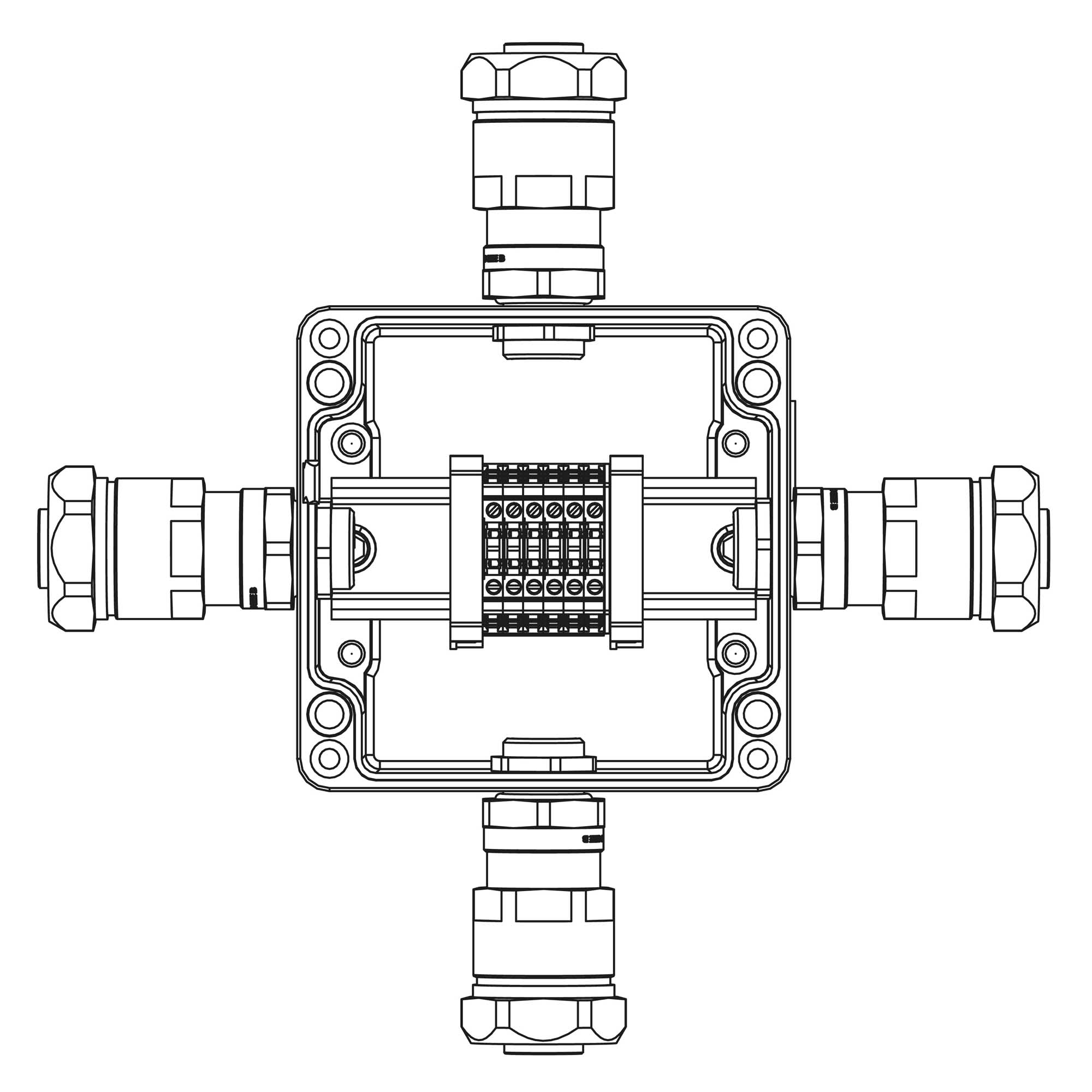 TBE - A - 12 - (6xCBC.2) - 1x6018ANP22BKM2SB(A) - 1x6018ANP22BKM2SB(B) - 1x6018ANP22BKM2SB(C) - 1x6018ANP22BKM2SB(D)1Ex e IIC Т5 Gb / Ex tb IIIC T95°C Db IP66 Un=500 В, In=23 А Взрывозащищенная клеммная коробка из алюминия 120x120x90мм 1Ex e IIC Т5 Gb / Ex tb IIIC T95°C Db IP66 Температурный режим Т5 40°C Количество клемм: CBC.2 6 шт. Ток А Вводы Сторона А: Взрывозащищенный кабельный ввод ANP под небронированный кабель в металлорукаве M20х1,5 D8 - 13мм, Dn20мм. Никелированная латунь.IP66/68 1 шт. Сторона B: Взрывозащищенный кабельный ввод ANP под небронированный кабель в металлорукаве M20х1,5 D8 - 13мм, Dn20мм. Никелированная латунь.IP66/68 1 шт. Сторона C: Взрывозащищенный кабельный ввод ANP под небронированный кабель в металлорукаве M20х1,5 D8 - 13мм, Dn20мм. Никелированная латунь.IP66/68 1 шт. Сторона D: Взрывозащищенный кабельный ввод ANP под небронированный кабель в металлорукаве M20х1,5 D8 - 13мм, Dn20мм. Никелированная латунь.IP66/68 1 шт.