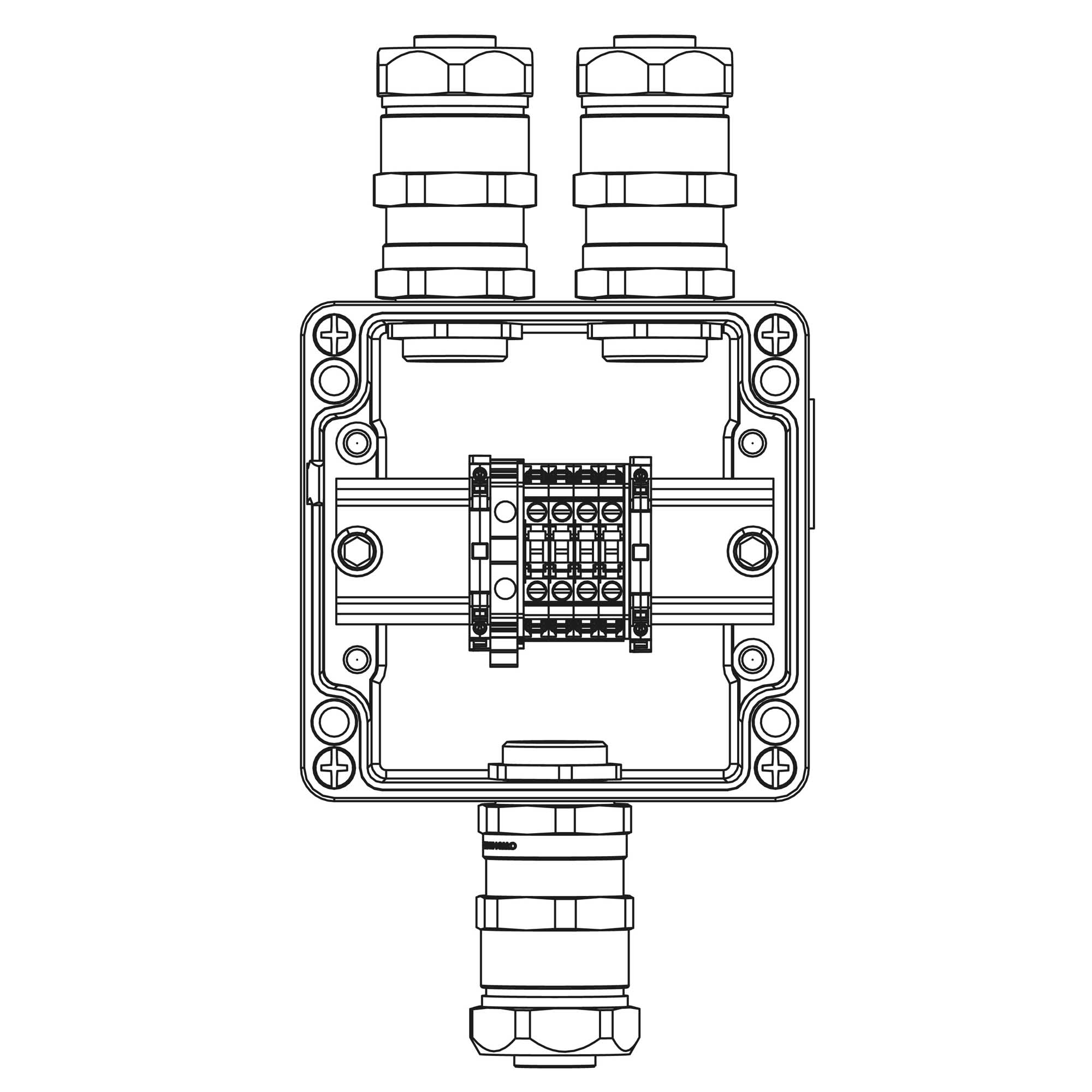 TBE - A - 12 - (4xCBC.4 - 1xTEO.4) - 2x6018ANP22CKM3SB(A) - 1x6018ANP22CKM3SB(C)1Ex e IIC Т5 Gb / Ex tb IIIC T95°C Db IP66 Un=500 В, In=29 А Взрывозащищенная клеммная коробка из алюминия 120x120x90мм 1Ex e IIC Т5 Gb / Ex tb IIIC T95°C Db IP66 Температурный режим Т5 40°C Количество клемм: CBC.4 4 шт. Ток А TEO.4 1 шт. Ток А Вводы Сторона А: Взрывозащищенный кабельный ввод ANP под небронированный кабель в металлорукаве M25х1,5 D10,5 - 18мм, Dn20мм. Никелированная латунь.IP66/68 2 шт. Сторона C: Взрывозащищенный кабельный ввод ANP под небронированный кабель в металлорукаве M25х1,5 D10,5 - 18мм, Dn20мм. Никелированная латунь.IP66/68 1 шт.
