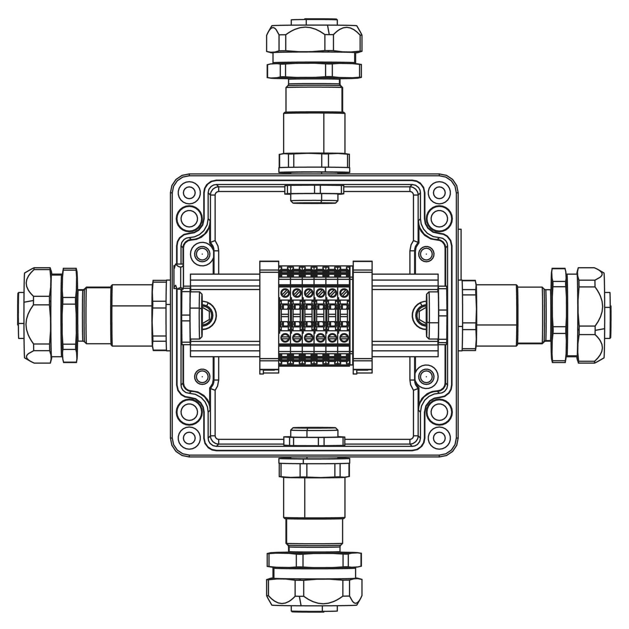 Взрывозащищенная клеммная коробка из алюминия TBE - A - 12 - (6xCBC.2) - 1xKAEPM2MHK - 20(A) - 1xKAEPM2MHK - 20(B) - 1xKAEPM2MHK - 20(C) - 1xKAEPM2MHK - 20(D)1Ex e IIC Т5 Gb / Ex tb IIIC T95°C Db IP66 Un=500 В, In=23 А Взрывозащищенная клеммная коробка из алюминия 120x120x90мм 1Ex e IIC Т5 Gb / Ex tb IIIC T95°C Db IP66 Температурный режим Т5 40°C Количество клемм: CBC.2 6 шт. Ток А Вводы Сторона А: Универсальный кабельный ввод серии КАЕРМ для бронированного и небронированного кабеля М20х1,5 d:5,8 - 12мм. Dn:20. Никелированная латунь IP66/IP68 1 шт. Сторона B: Универсальный кабельный ввод серии КАЕРМ для бронированного и небронированного кабеля М20х1,5 d:5,8 - 12мм. Dn:20. Никелированная латунь IP66/IP68 1 шт. Сторона C: Универсальный кабельный ввод серии КАЕРМ для бронированного и небронированного кабеля М20х1,5 d:5,8 - 12мм. Dn:20. Никелированная латунь IP66/IP68 1 шт. Сторона D: Универсальный кабельный ввод серии КАЕРМ для бронированного и небронированного кабеля М20х1,5 d:5,8 - 12мм. Dn:20. Никелированная латунь IP66/IP68 1 шт.