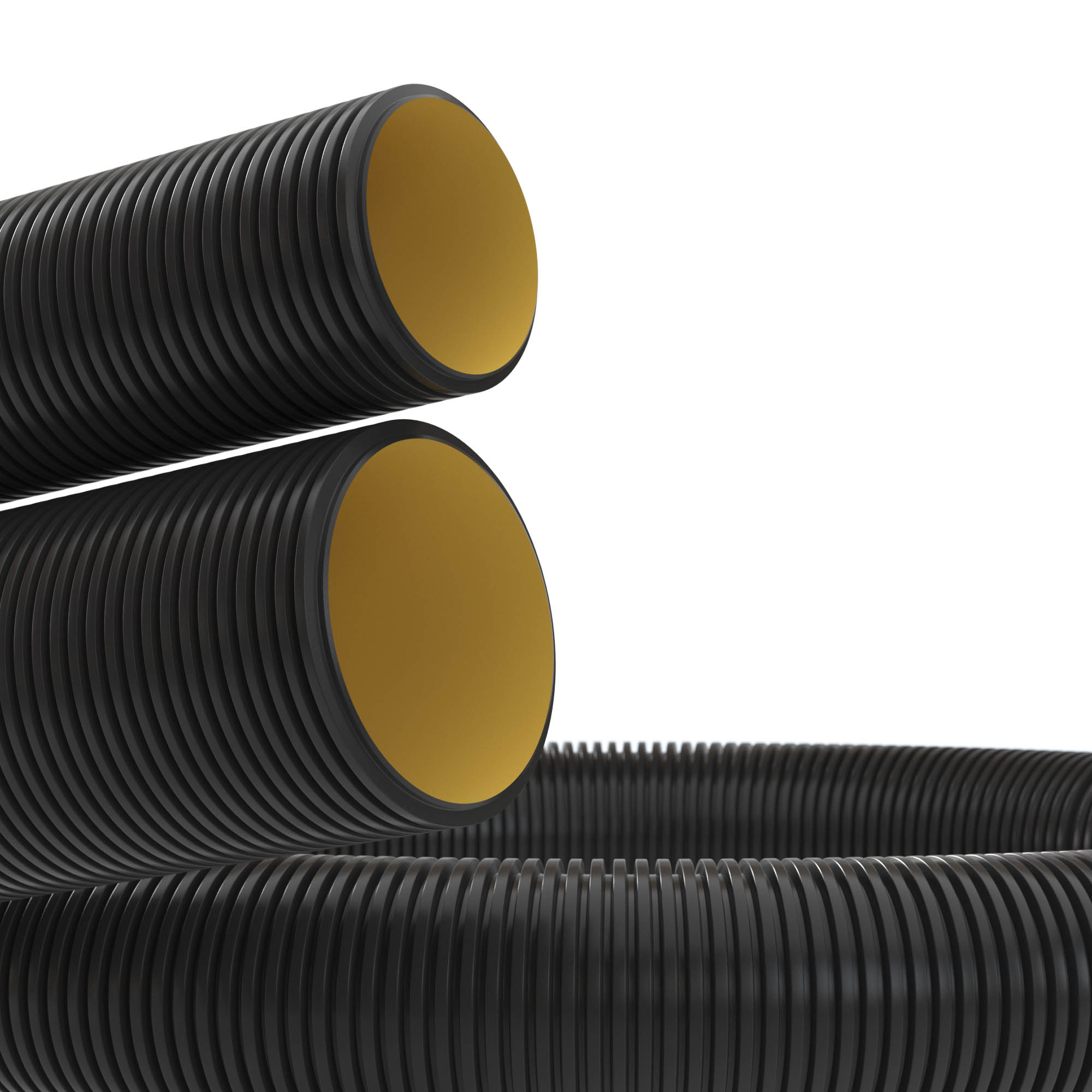 Двустенные гибкие электротехнические трубы могут использоваться как для прокладки кабеля, так и для организации ливневой организации. В первом случае удобнее использовать трубы с протяжкой - она позволяет легко проложить кабель во внутреннем пространстве трубы. Труба имеет высокую кольцевую жесткость. Диаметр 160 мм, поставляется бухтами по 50 метров. Материал - ПНД.