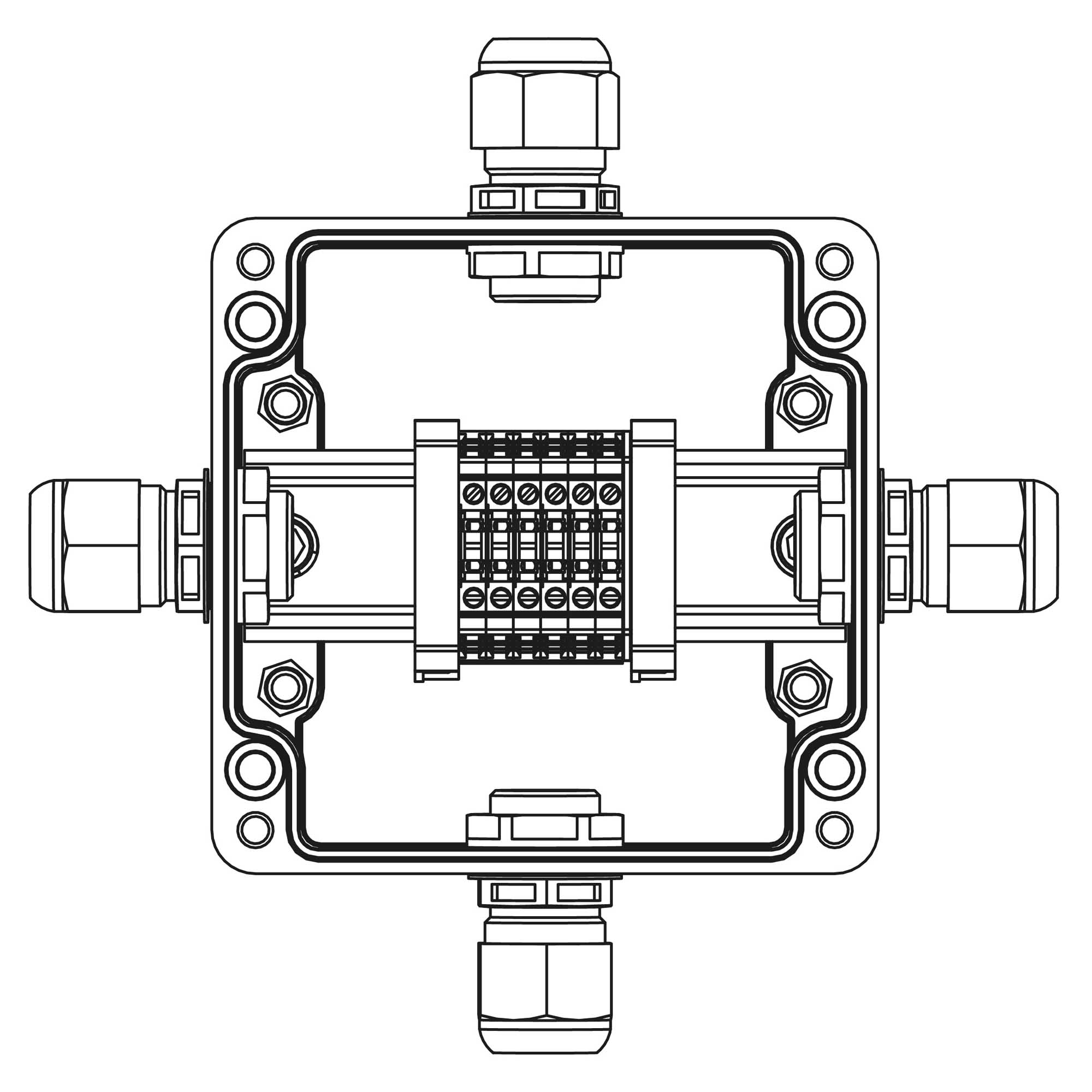 Взрывозащищенная клеммная коробка из полиэстера TBE - P - 03 - (6xCBC.2) - 1xPABMP(A) - 1xPABMP(B) - 1xPABMP(C) - 1xPABMP(D)1Ex e IIC Т5 Gb / Ex tb IIIC T95°C Db IP66 Un=500 В, In=23 А Взрывозащищенная клеммная коробка GRP 120x120x90мм 1Ex e IIC Т5 Gb / Ex tb IIIC T95°C Db IP66 Температурный режим Т5 40°C Количество клемм: CBC.2 6 шт. Ток А Вводы Сторона А: Взрывозащищенный полиамидный кабельный ввод, небронированный кабель M20х1,5 D7 - 12мм. IP66/68 1 шт. Сторона B: Взрывозащищенный полиамидный кабельный ввод, небронированный кабель M20х1,5 D7 - 12мм. IP66/68 1 шт. Сторона C: Взрывозащищенный полиамидный кабельный ввод, небронированный кабель M20х1,5 D7 - 12мм. IP66/68 1 шт. Сторона D: Взрывозащищенный полиамидный кабельный ввод, небронированный кабель M20х1,5 D7 - 12мм. IP66/68 1 шт.