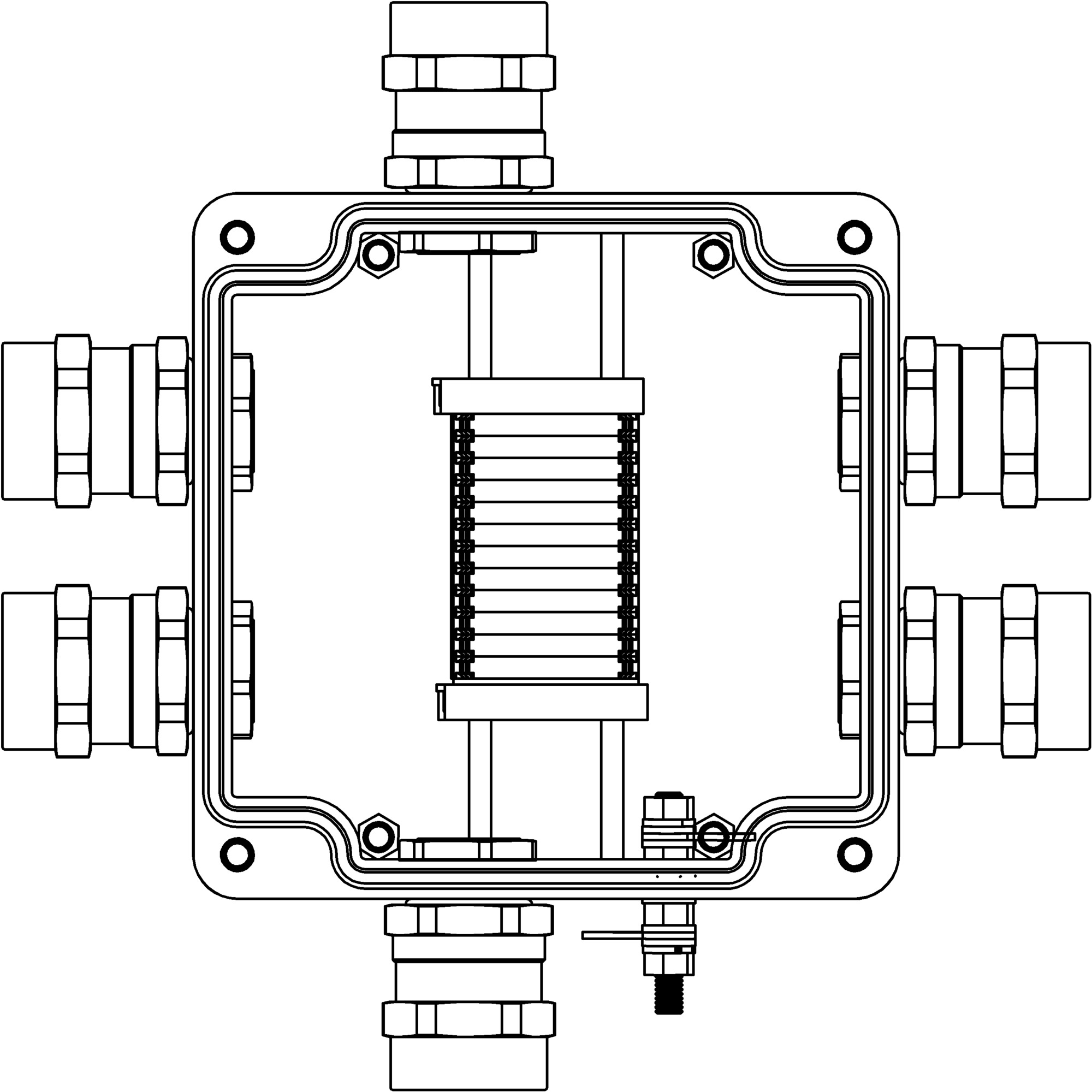 TBE - P - 05 - (12xCBC.4) - 2x6018ANSCGKM3SB(A) - 1x6018ANSCGKM3SB(B) - 2x6018ANSCGKM3SB(C) - 1x6018ANSCGKM3SB(D)1Ex e IIC Т5 Gb / Ex tb IIIC T95°C Db IP66/ШЗ/КЗ Un=500 В, In=29 А Взрывозащищенная клеммная коробка GRP 160x160x90мм 1Ex e IIC Т5 Gb / Ex tb IIIC T95°C Db IP66 Температурный режим Т5 40°C Кольца заземления Зажим заземления Количество клемм: CBC.4 12 шт. Ток А Вводы Сторона А: Взрывозащищенный кабельный ввод ANS под небронированный кабель M25х1,5 D10,5 - 18мм. Никелированная латунь. IP66/68 2 шт. Сторона B: Взрывозащищенный кабельный ввод ANS под небронированный кабель M25х1,5 D10,5 - 18мм. Никелированная латунь. IP66/68 1 шт. Сторона C: Взрывозащищенный кабельный ввод ANS под небронированный кабель M25х1,5 D10,5 - 18мм. Никелированная латунь. IP66/68 2 шт. Сторона D: Взрывозащищенный кабельный ввод ANS под небронированный кабель M25х1,5 D10,5 - 18мм. Никелированная латунь. IP66/68 1 шт.