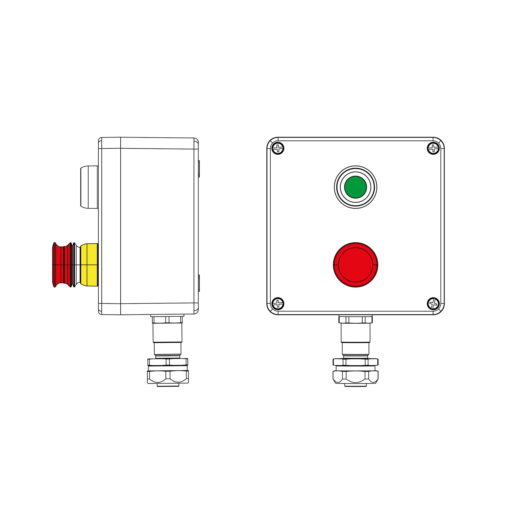 Взрывозащищенный пост управления из полиэстера CPE - P - 05 - (1xP1G(11) - 1xP3E(11)) - 1xKAEPM2MHK - 20(C)1Ex d e IIC Т5 Gb / Ex tb IIIC T95°C Db IP66/КЗ Un=380 В, In=16 А Взрывозащищенный пост управления GRP 160x160x90мм 1Ex d e IIC Т5 Gb / Ex tb IIIC T95°C Db IP66 Температурный режим Т5 40°C Кольца заземления Количество элементов управления: Контактный блок 1NC/1NO + Аварийная кнопка P3E Красная 1 шт. Контактный блок 1NC/1NO + Кнопка P1 Зеленая 1 шт. Количество клемм: Вводы Сторона C: Универсальный кабельный ввод серии КАЕРМ для бронированного и небронированного кабеля М20х1,5 d:5,8 - 12мм. Dn:20. Никелированная латунь IP66/IP68 1 шт.