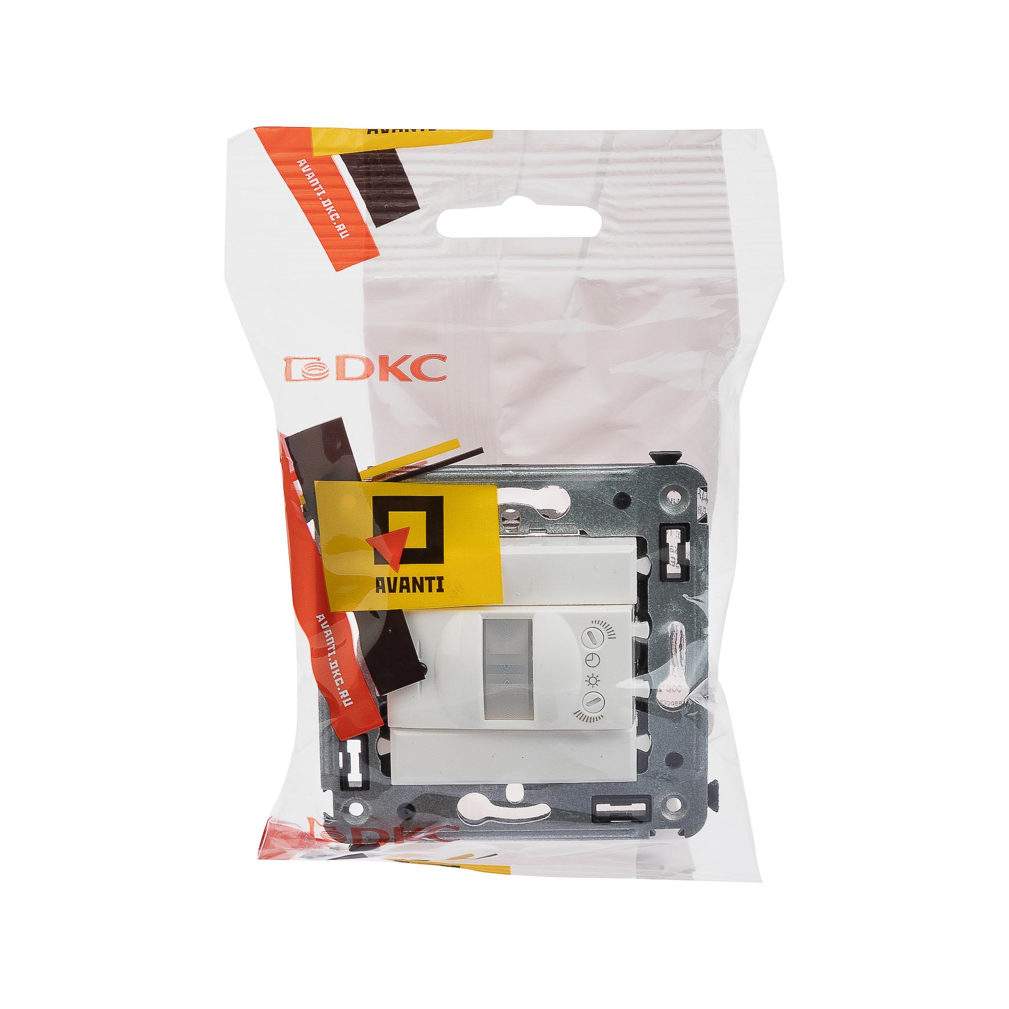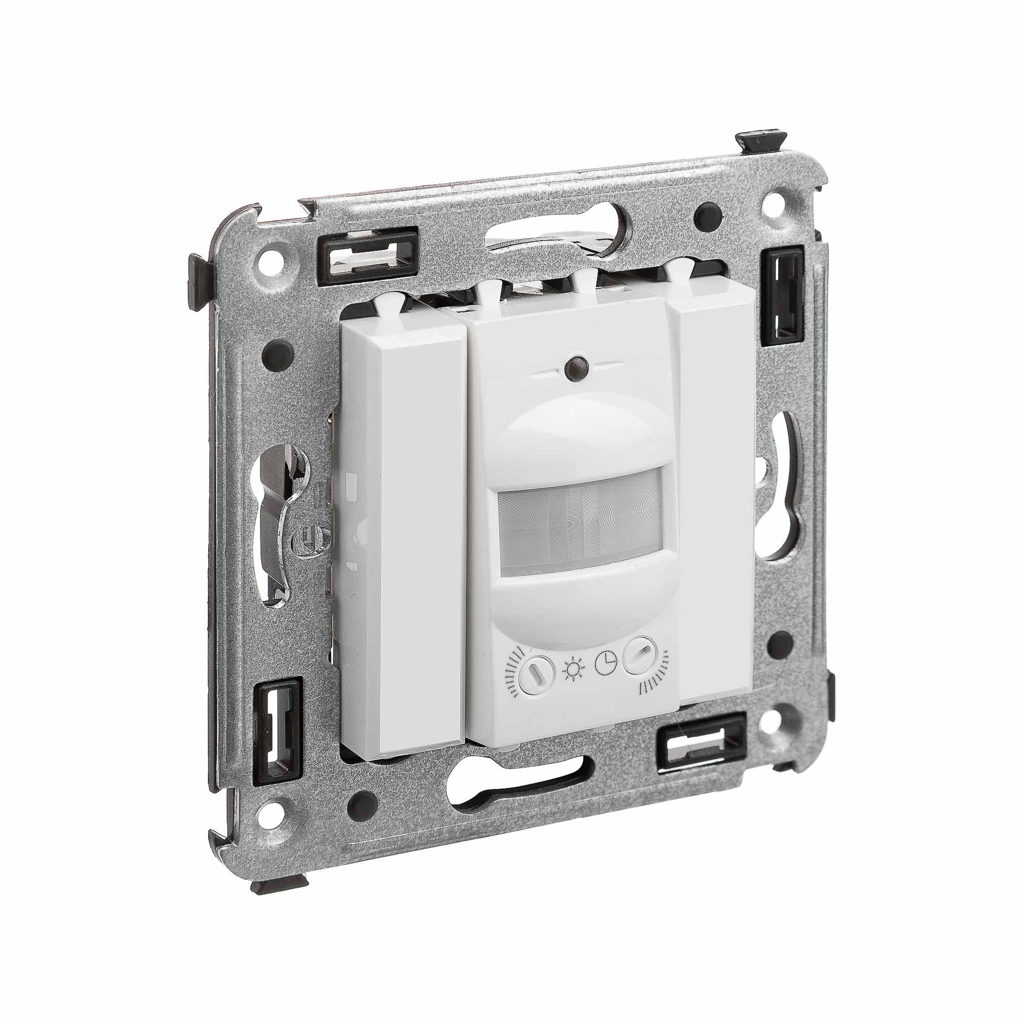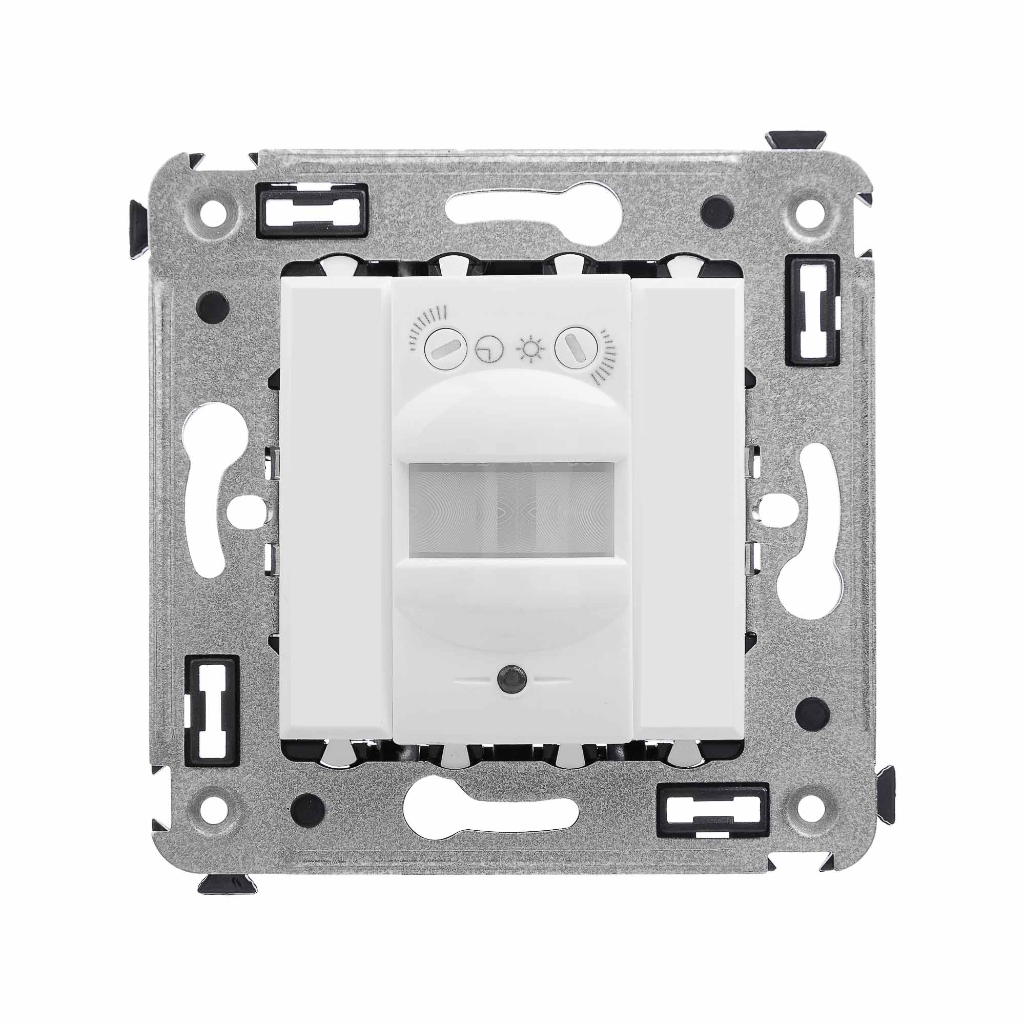 Датчик движения. Назначение: для монтажа в подрозеточные коробки глубиной не менее 45 мм (код 59301). Используется для автоматического включения/выключения света. Характеристики: диаметр отверстий для ввода кабелей – 3 мм; винтовые зажимы; шаблон для зачистки кабеля – 11 мм; расстояние обнаружения – от 2 до 12 м; угол охвата – 150°; время задержки отключения – от 10 с до 7 мин.; настройка светочувствительности датчика; настройка порога освещенности; фиксация в подрозеточные коробки глубиной не менее 45 мм при помощи каркаса с лапками (код 4400802) и саморезов. Цвет: "Белое облако".