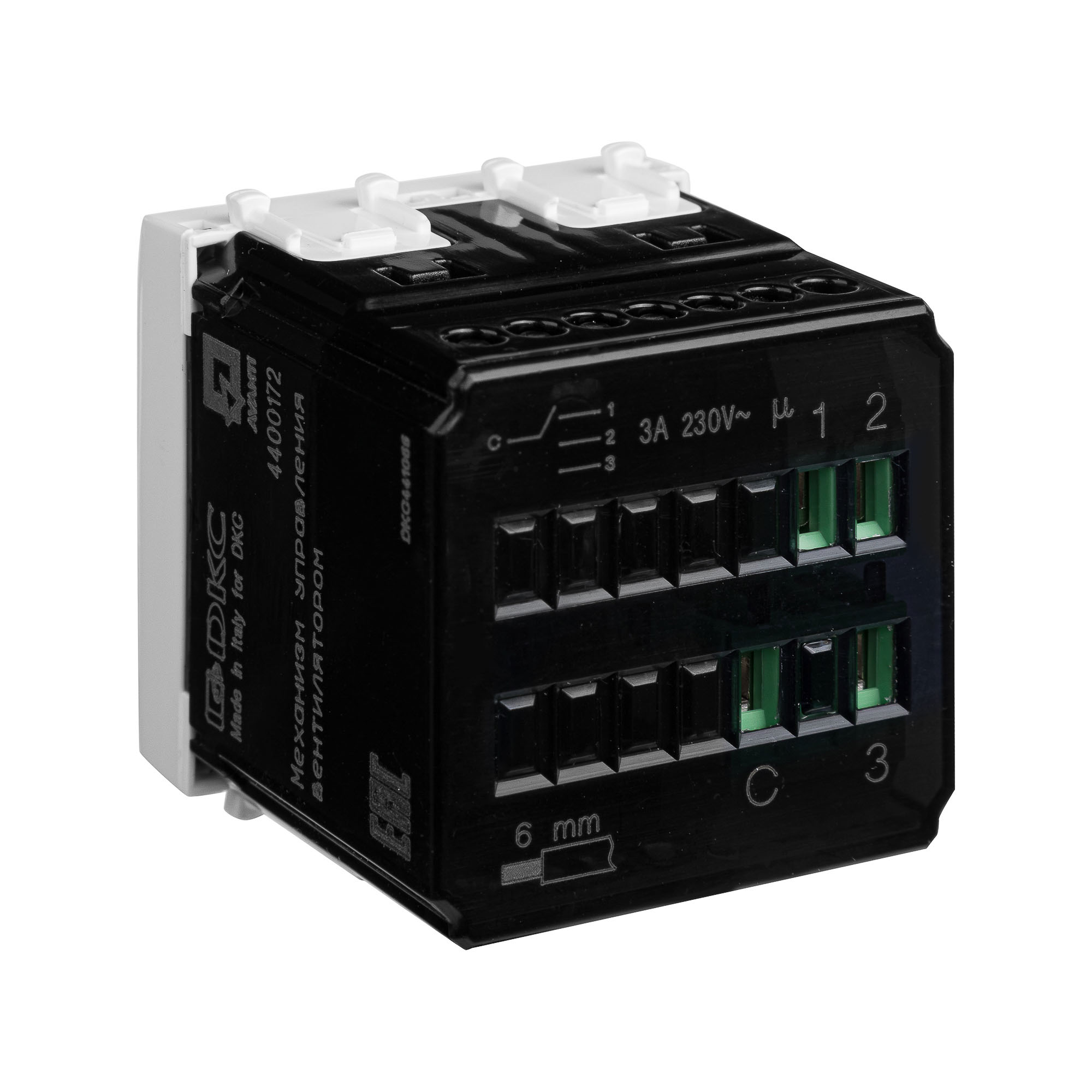 Механизм управления вентиляторами от ДКС встраивается в настенный кабель-канал и используется для изменения скорости вращения лопастей вентилятора. Конструкция предусматривает переключение по трем возможным скоростям и режим покоя. Изменение скорости производится поворотом колесика-регулятора. Номинальное напряжение ЭУИ – 230 В.