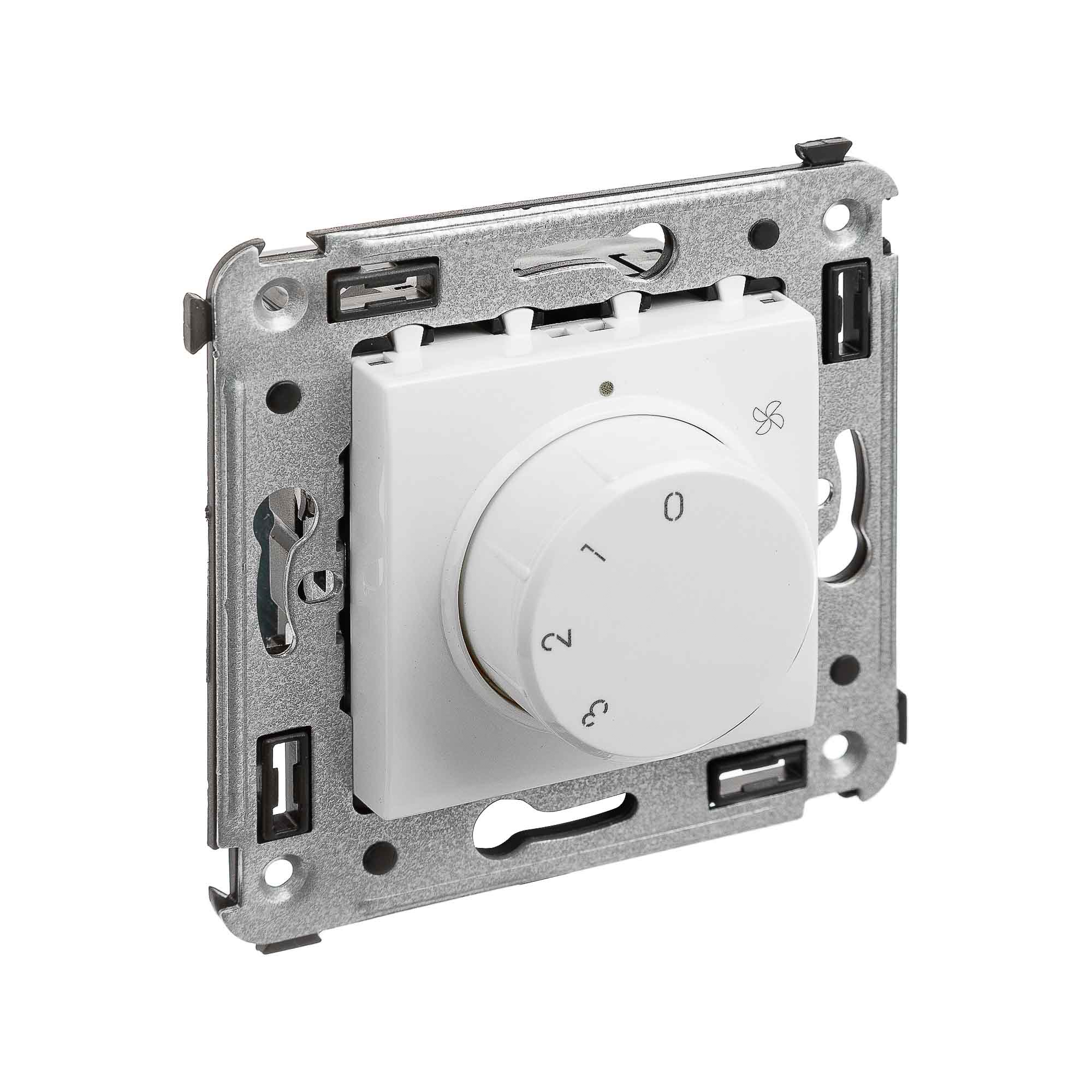 Механизм управления вентиляторами. Назначение: для монтажа в подрозеточные коробки глубиной не менее 45 мм (код 59301);. Предназначен для управления вентиляторами. Характеристики: номинальное напряжение – 230 В; 3 скорости работы; диаметр отверстий для ввода кабелей – 3 мм; винтовые зажимы; шаблон для зачистки кабеля – 11 мм; фиксация в подрозеточные коробки глубиной не менее 45 мм при помощи каркаса с лапками (код 4400802) и саморезов. Цвет: "Белое облако".