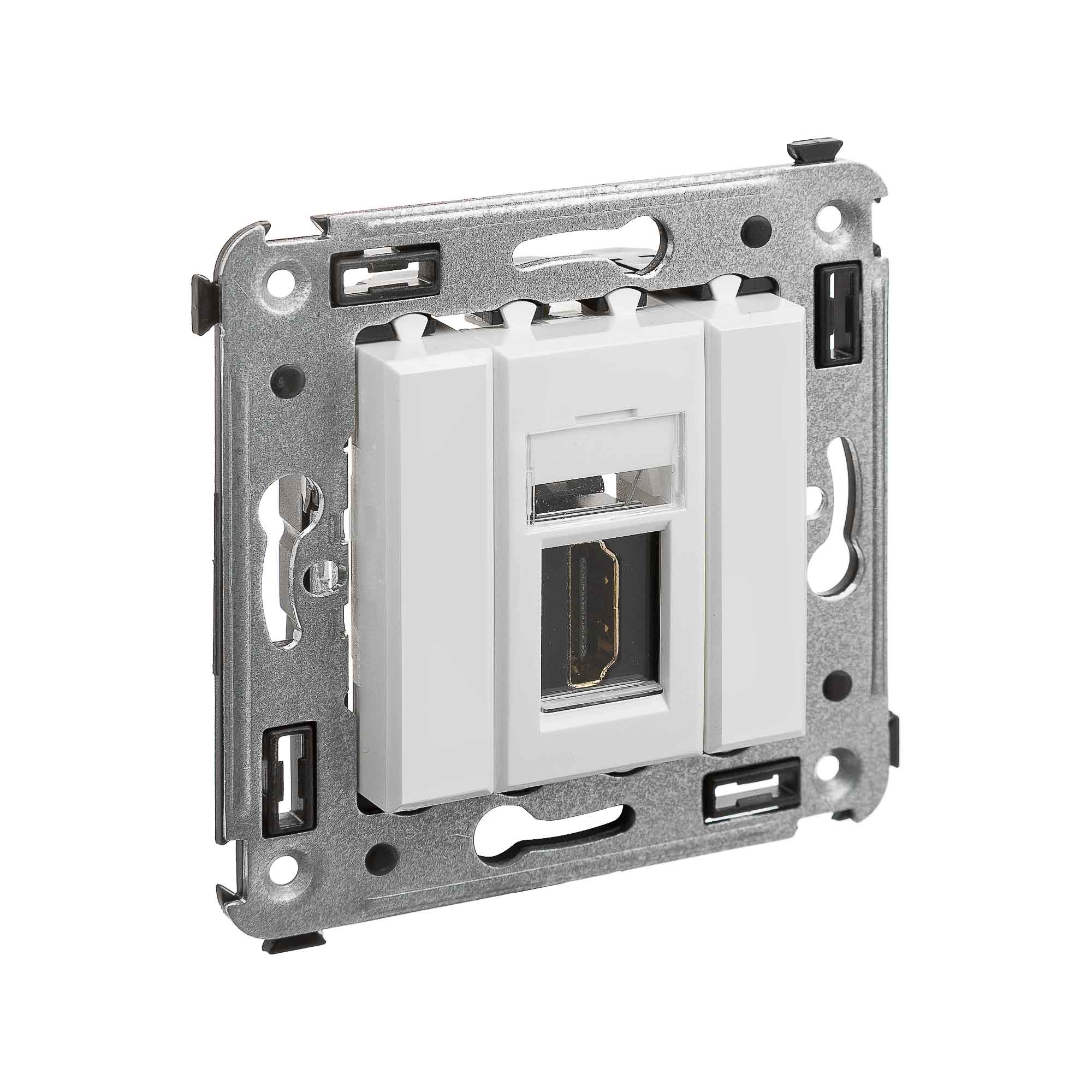 HDMI - розетка. Назначение: для монтажа в подрозеточные коробки глубиной не менее 45 мм (код 59301). Используется в качестве мультимедийной розетки для передачи сигнала (подключение проекторов, мониторов, телевизоров и др.). Характеристики: 1 модуль, с пылезащитной шторкой; с маркировочной табличкой; в комплекте разъем Keystone; для заделки контактов используется инструмент типа 110; тип розетки – "А - А" или "мама - мама"; фиксация в подрозеточные коробки глубиной не менее 45 мм при помощи каркаса с лапками (код 4400802) и саморезов. Цвет: "Белое облако".
