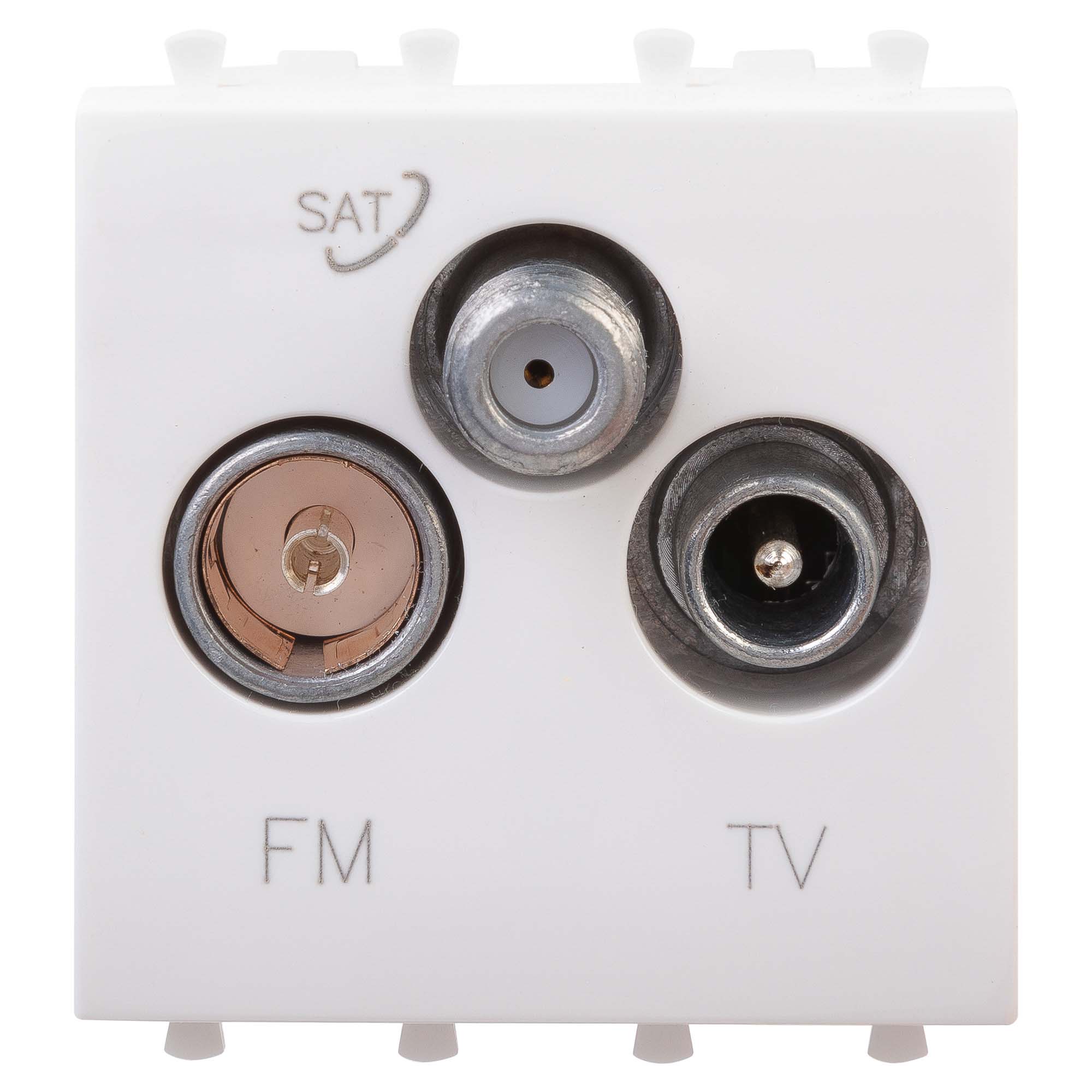 Розетки TV-FM-SAT предназначены для комплектации систем организации рабочих мест (кабель-каналов, лючков, башенок, колонн). Применяются для подключения подключение теле-и радиокабеля. Розетки рассчитаны на частоту до 2400 Гц. Материал – металл, пластик. 2 модуля. Пластиковые детали имеют цвет "Белое облако".