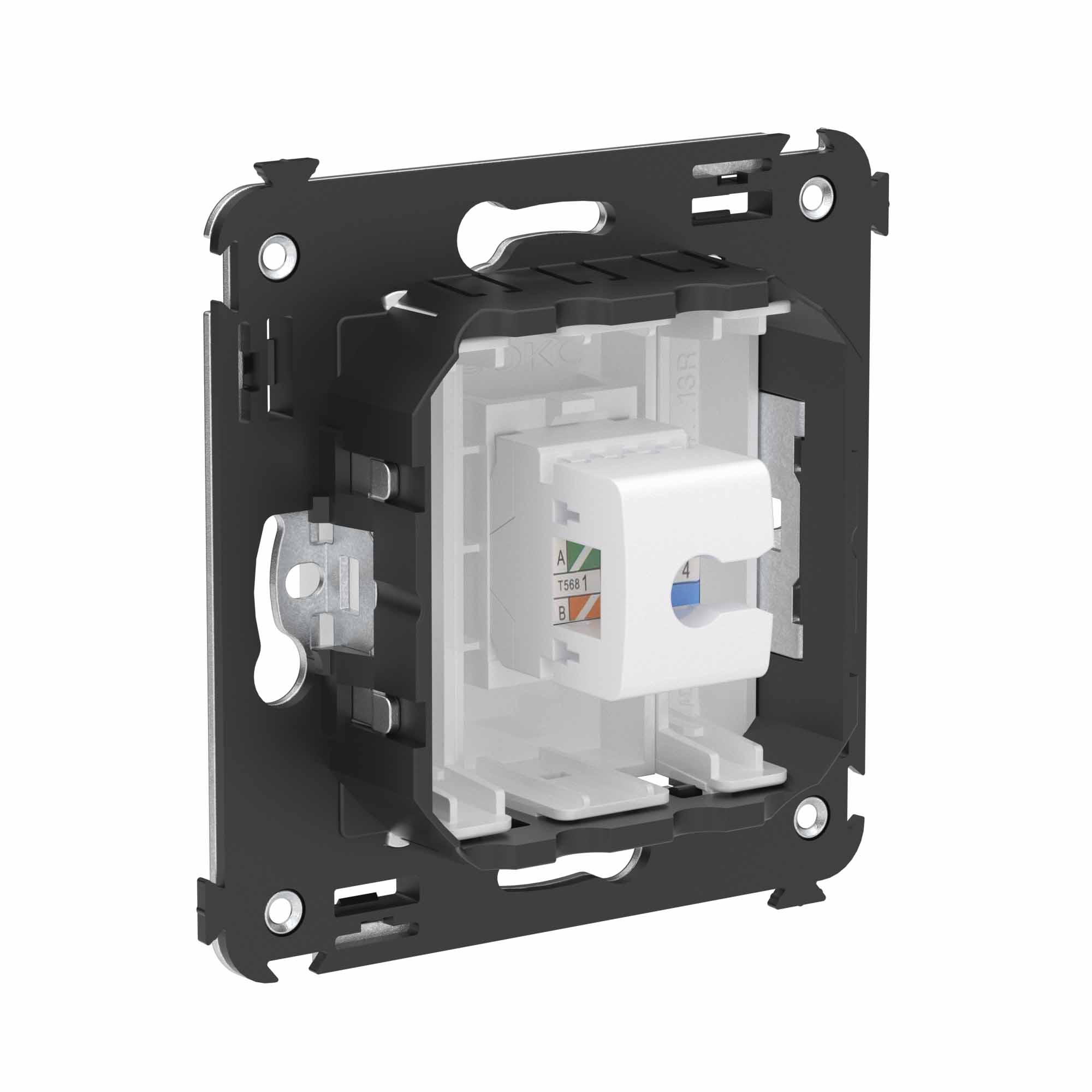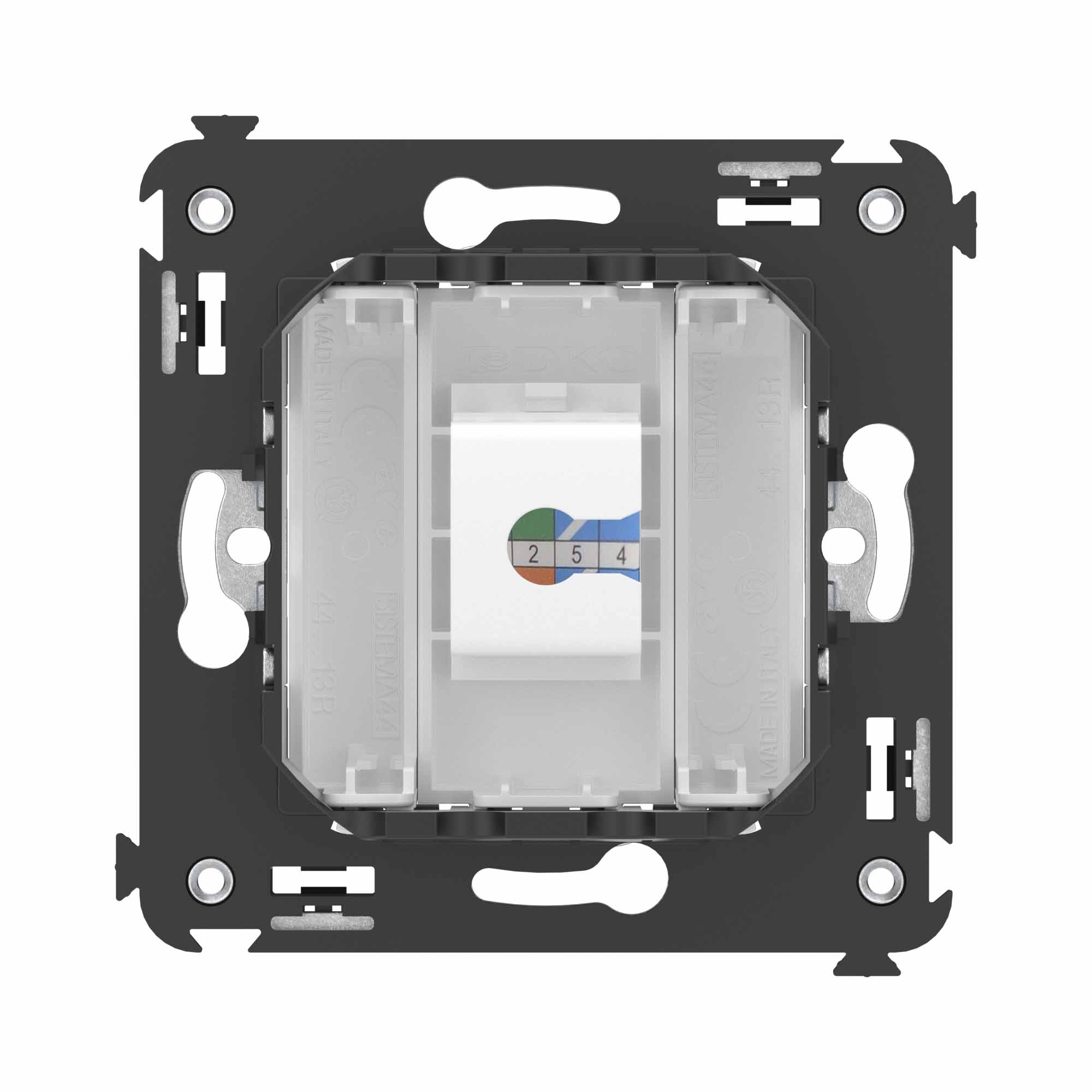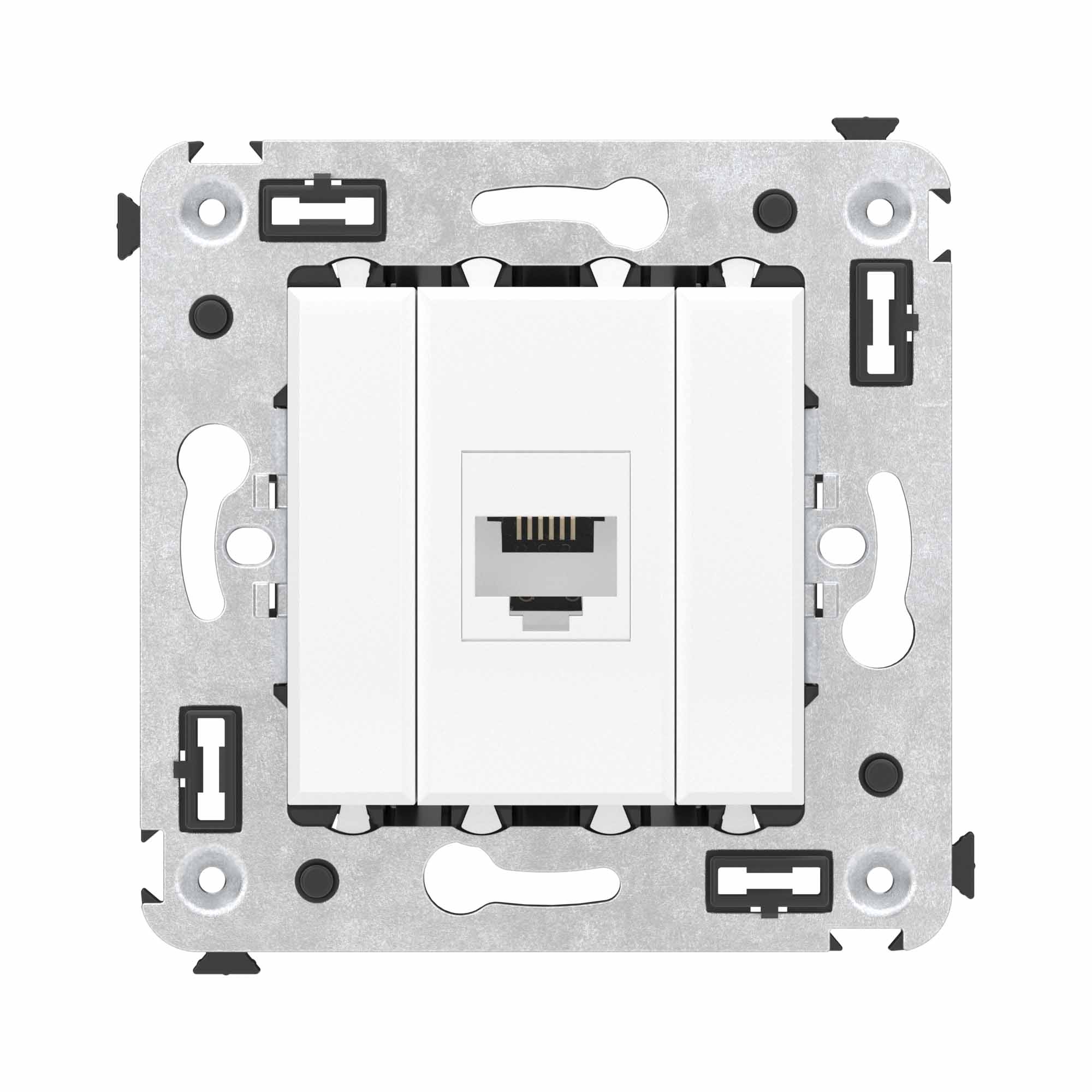 Телефонная розетка RJ - 12 без шторки используется для коммутации линий телефонной связи в патч - панелях или для связи телефонных аппаратов с розеткой. Предназначена для скрытого монтажа в стену, поставляется в комплекте с суппортом. Материал – металл, термопласт. Пластиковые детали электроустановочного изделия имеют цвет "Белое облако".