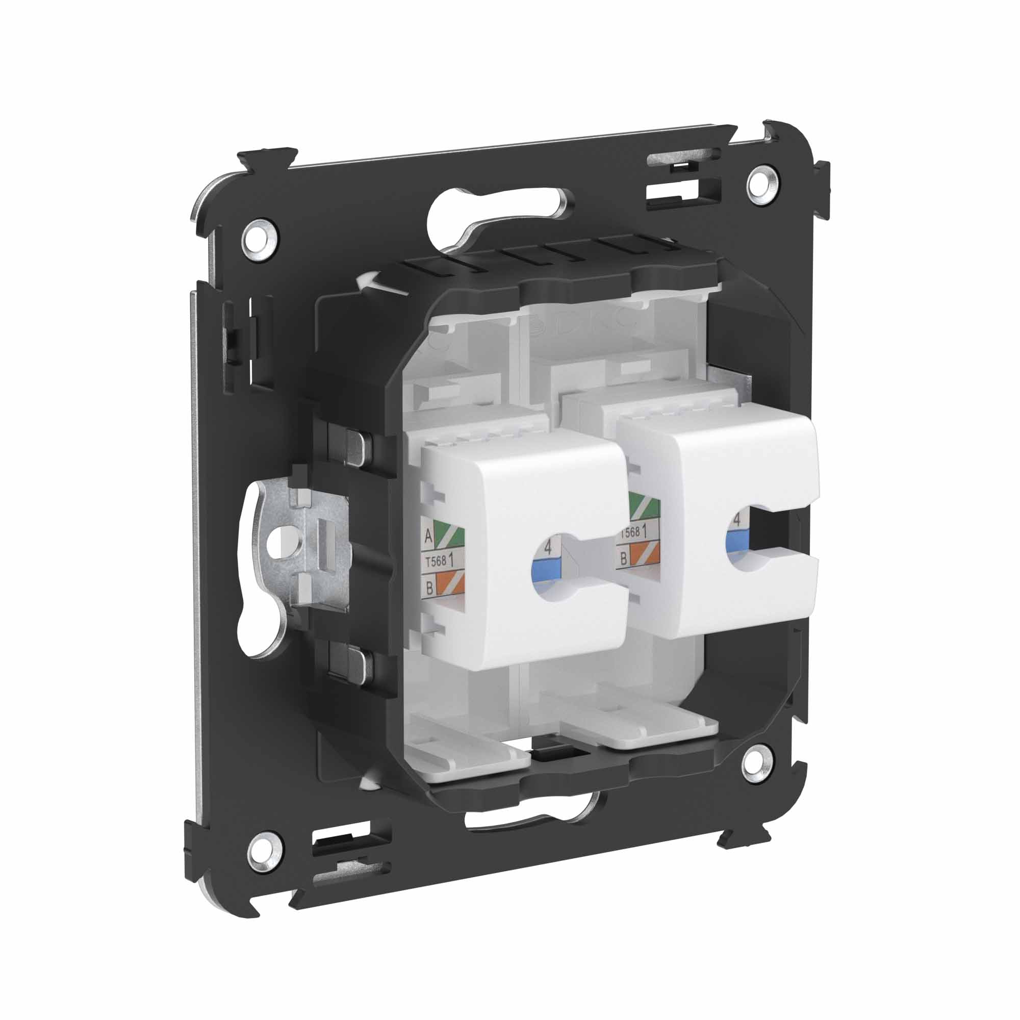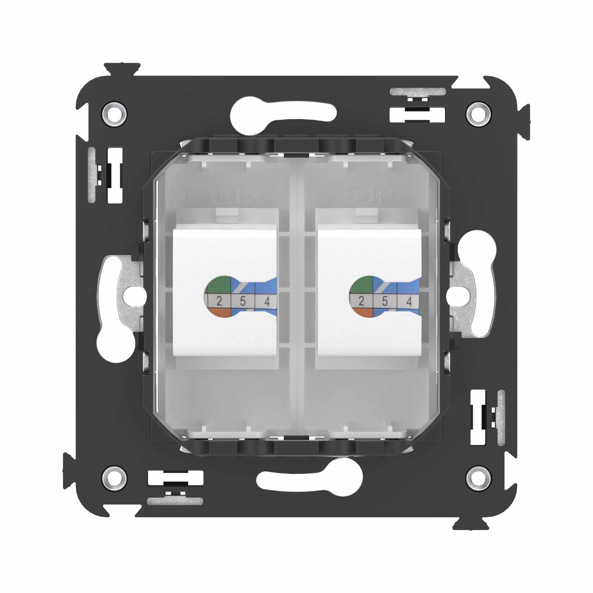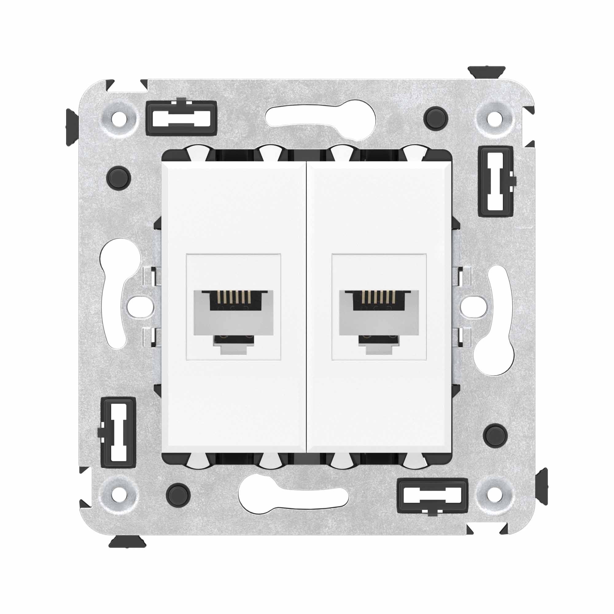 Телефонная розетка RJ - 12 двойная без шторки используется для коммутации линий телефонной связи в патч - панелях или для связи телефонных аппаратов с розеткой. Предназначена для скрытого монтажа в стену, поставляется в комплекте с суппортом. Материал – металл, термопласт. Пластиковые детали электроустановочного изделия имеют цвет "Белое облако".