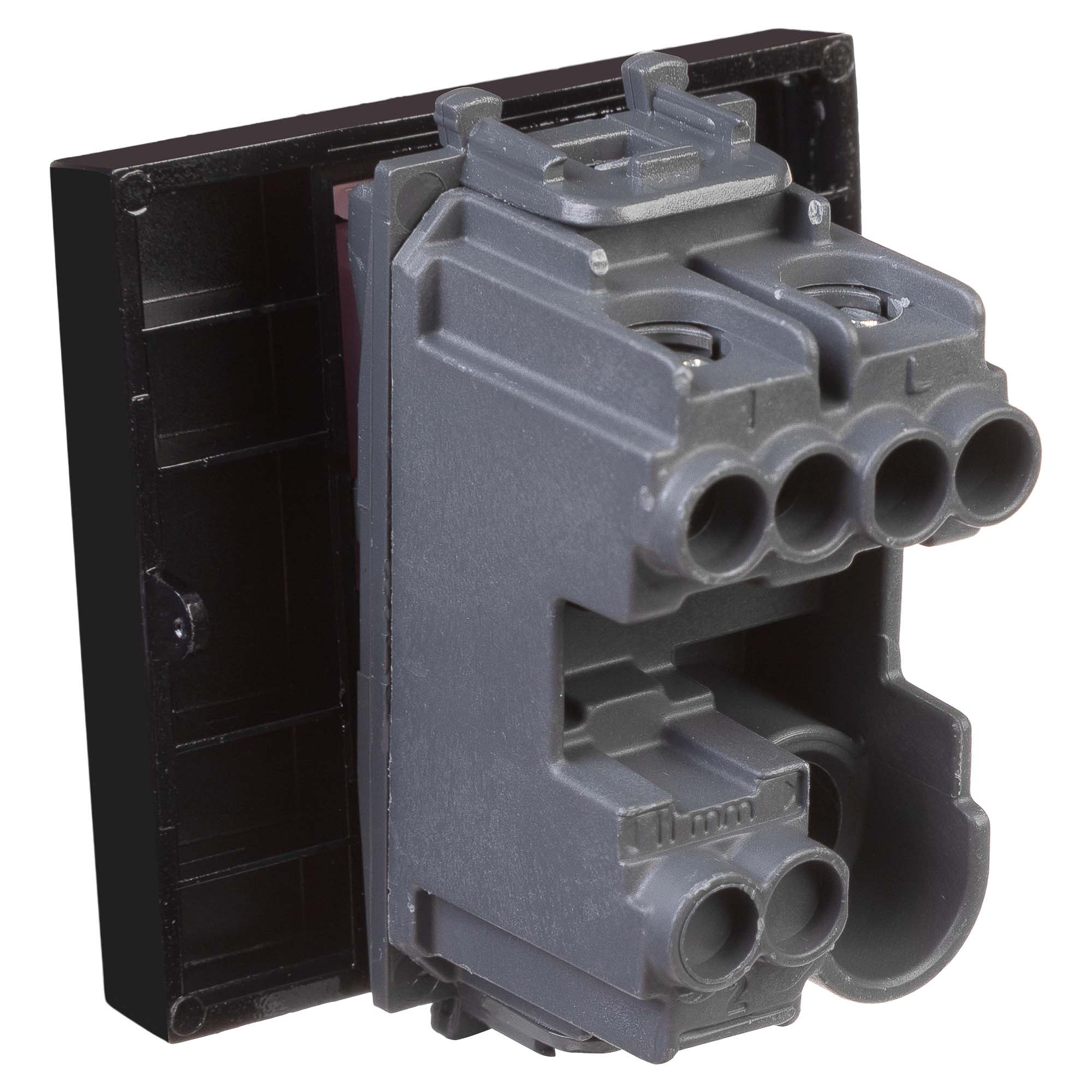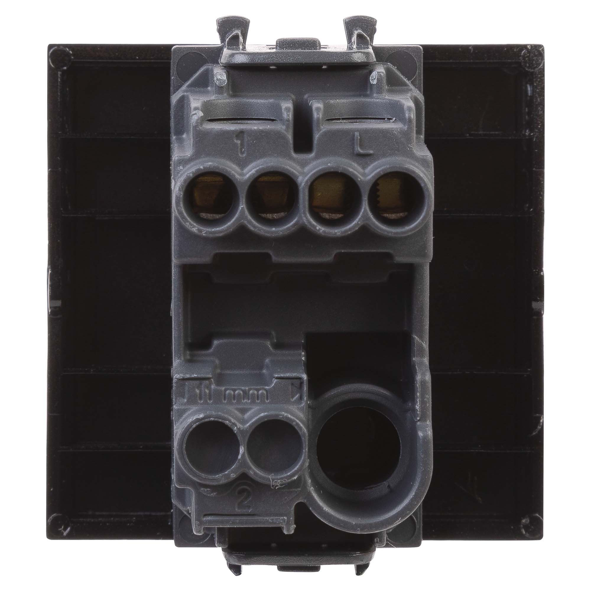 Выключатель одноклавишный однополюсный, модульный. Предназначен для монтажа в системы "In-liner Front" и "In-liner Aero" при помощи рамок-суппортов и каркасов "Avanti" (код 4400912 и т.д.); включения/выключения освещения. Характеристики: диаметр отверстий для ввода кабелей – 3 мм (по 2 отверстия на одну клемму); винтовые зажимы; шаблон для зачистки кабеля – 11 мм; номинальный ток – 16 A; номинальное напряжение – 230 В; возможна фиксация в подрозеточные коробки при помощи каркаса с лапками (код 4400802) и саморезов. 2 модуля. Цвет: "Черный квадрат".