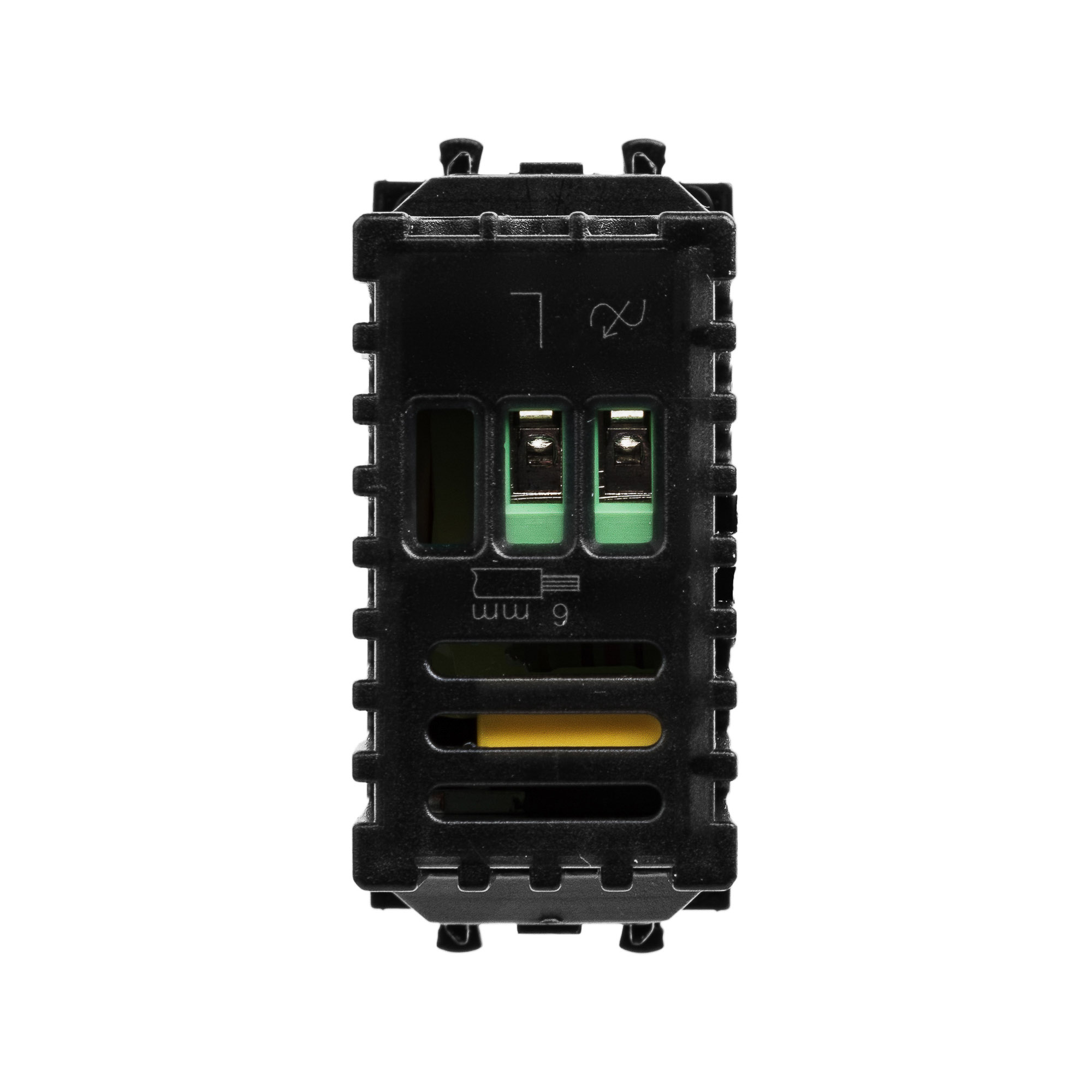 Диммер поворотный модульный. Предназначен для монтажа в системы "In-liner Front" и "In-liner Aero" при помощи рамок-суппортов и каркасов "Avanti" (код 4400912 и т.д.). Назначение: управление освещением помещения; регулирование 60–800 Вт для ламп накаливания и галогенных ламп. Диаметр отверстий для ввода кабелей – 3 мм; винтовые зажимы; шаблон для зачистки кабеля – 11 мм; встроенная подсветка. Фиксация в подрозеточные коробки глубиной не менее 45 мм при помощи каркаса с лапками (код 4400802) и саморезов. 1 модуль. Цвет: "Черный квадрат".