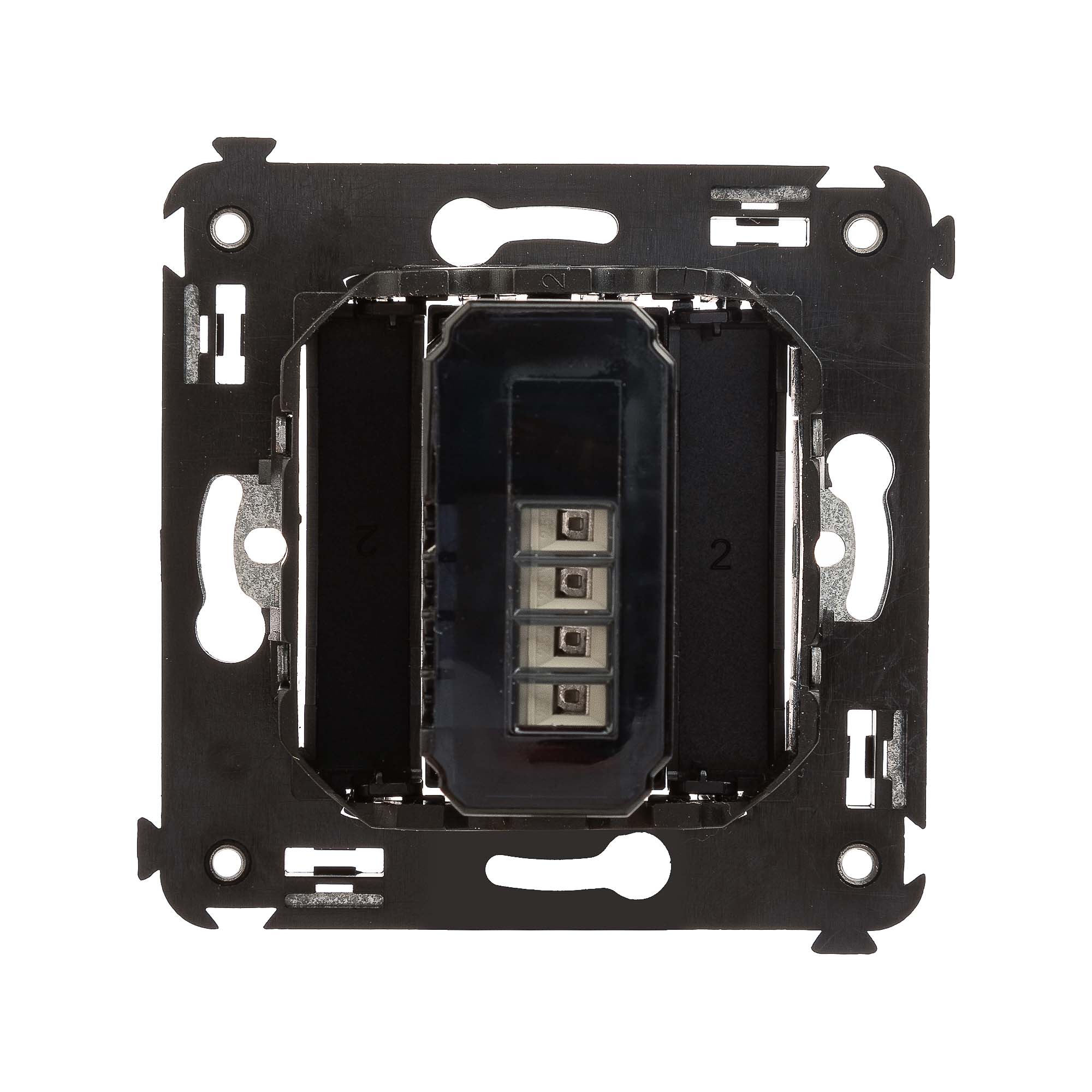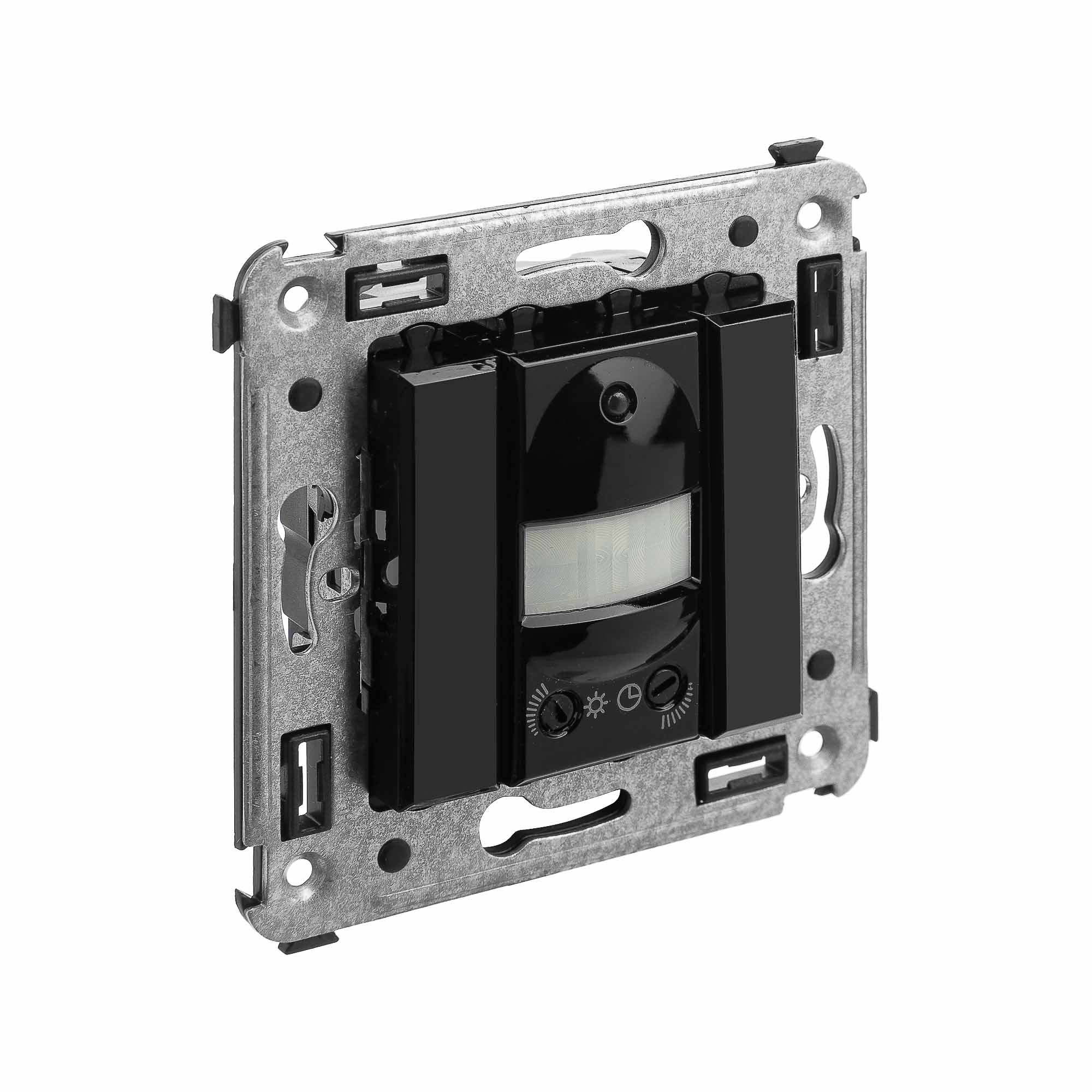 Датчик движения. Назначение: для монтажа в подрозеточные коробки глубиной не менее 45 мм (код 59301). Используется для автоматического включения/выключения. света. Характеристики: диаметр отверстий для ввода кабелей – 3 мм;. винтовые зажимы; шаблон для зачистки кабеля – 11 мм; расстояние обнаружения – от 2 до 12 м; угол охвата – 150°; время задержки отключения – от 10 с до 7 мин.; настройка светочувствительности датчика; настройка порога освещенности; фиксация в подрозеточные коробки глубиной не менее 45 мм при помощи каркаса с лапками (код 4400802) и саморезов. . Цвет: "Черный квадрат".