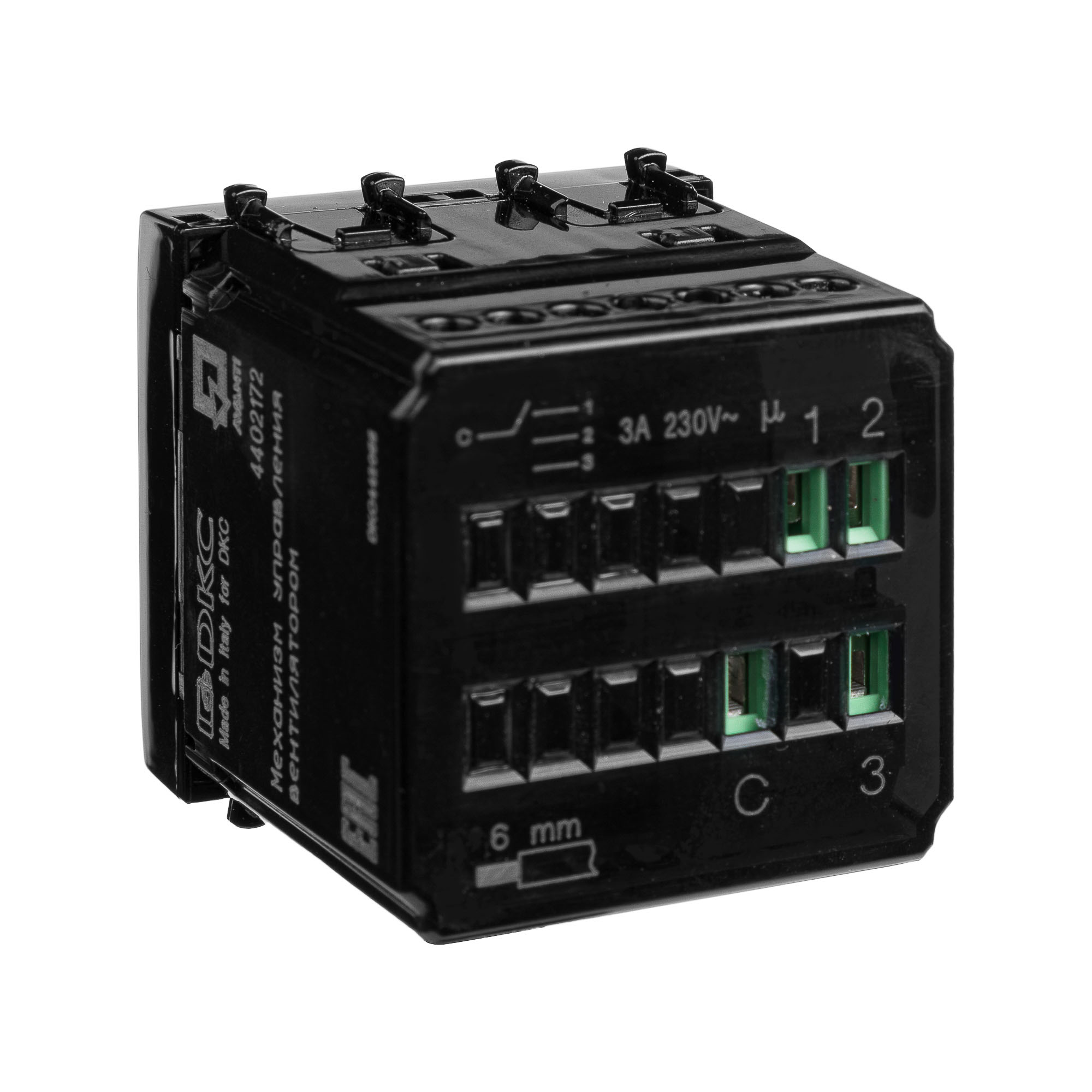 Механизм управления вентиляторами от ДКС встраивается в настенный кабель-канал и используется для изменения скорости вращения лопастей вентилятора. Конструкция предусматривает переключение по трем возможным скоростям и режим покоя. Изменение скорости производится поворотом колесика-регулятора. Номинальное напряжение ЭУИ – 230 В.