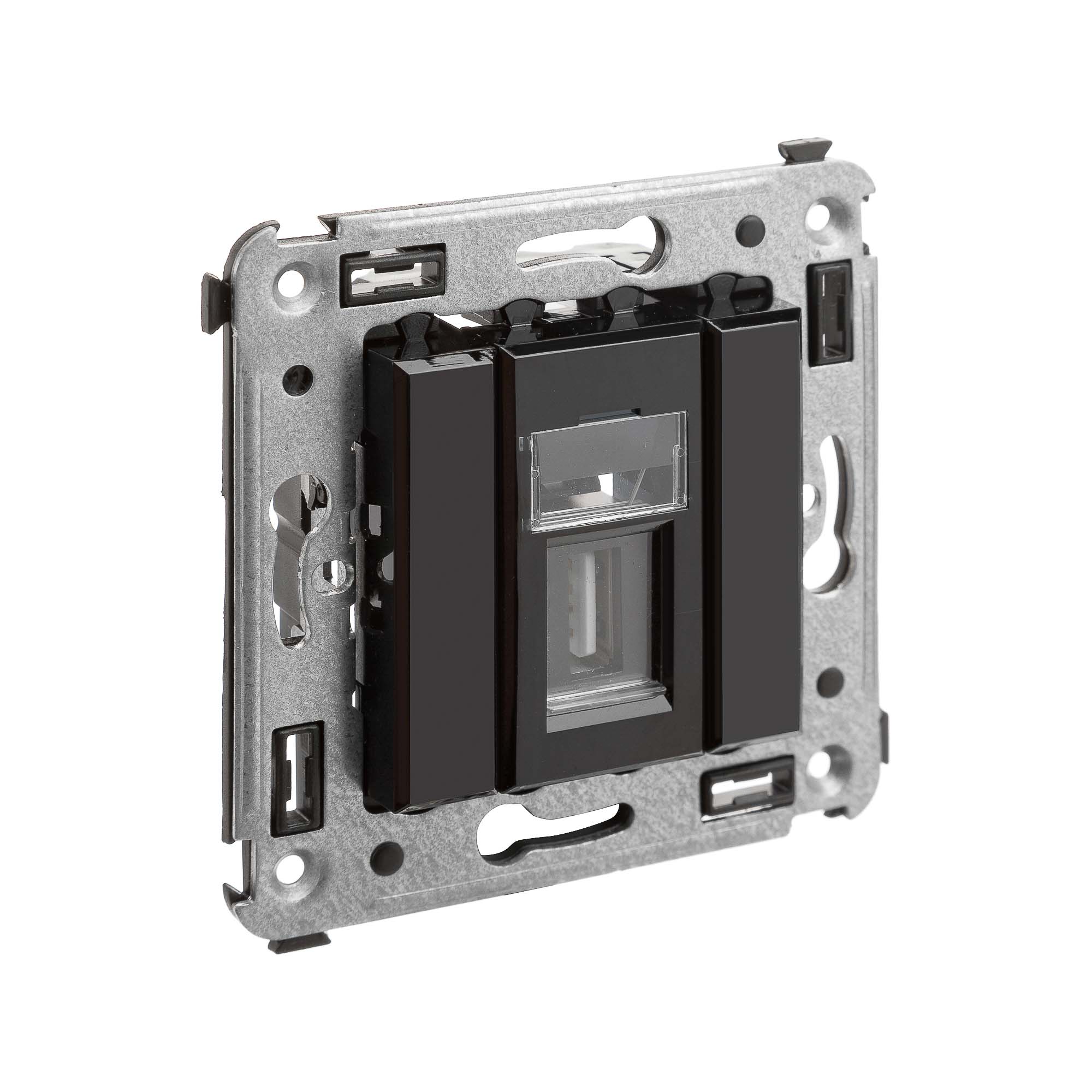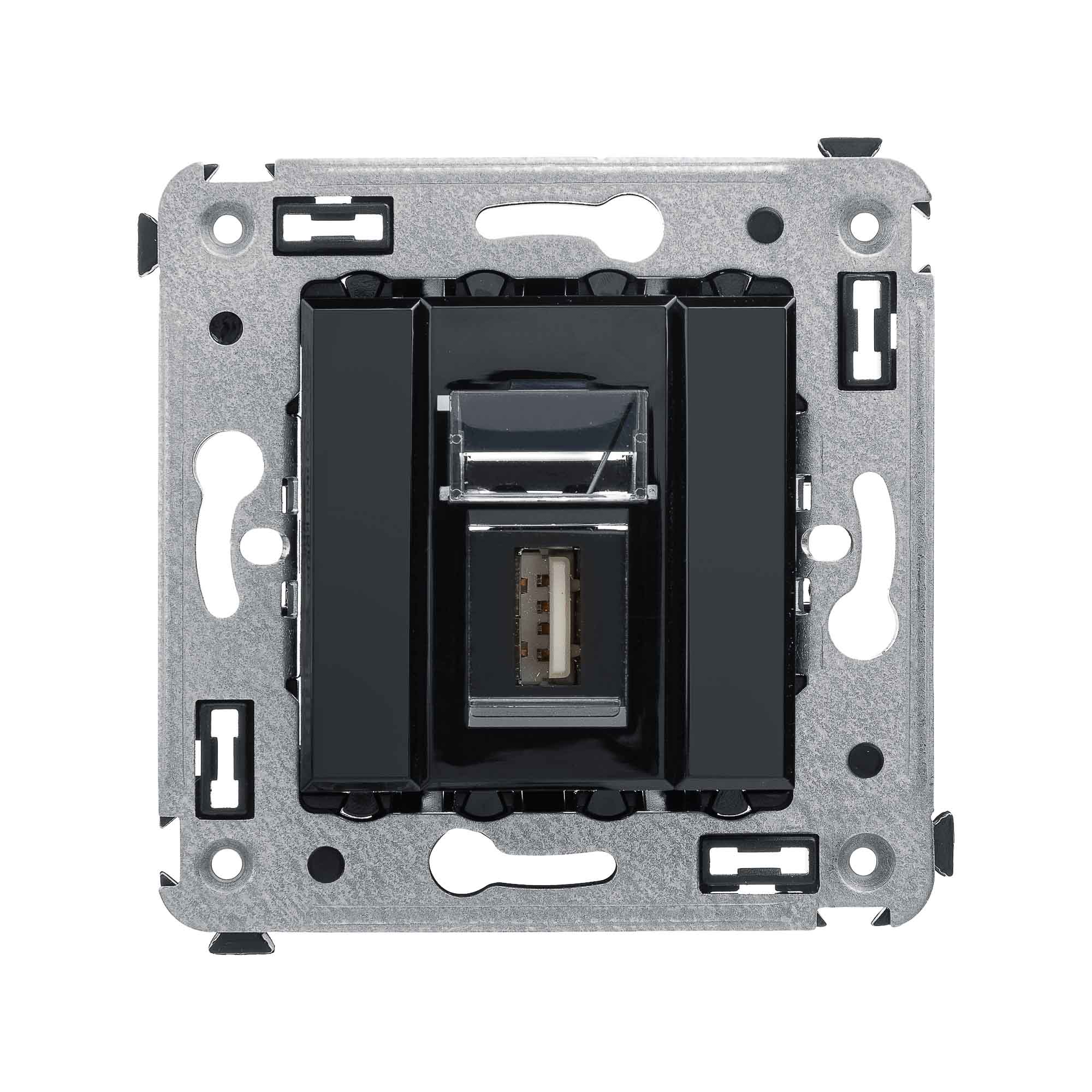 USB 2.0 розетка. Назначение: для монтажа в подрозеточные коробки глубиной не менее 45 мм (код 59301). Используется в качестве информационной розетки для передачи сигнала (подключение проекторов, мониторов и др.). Цвет: "Черный квадрат".