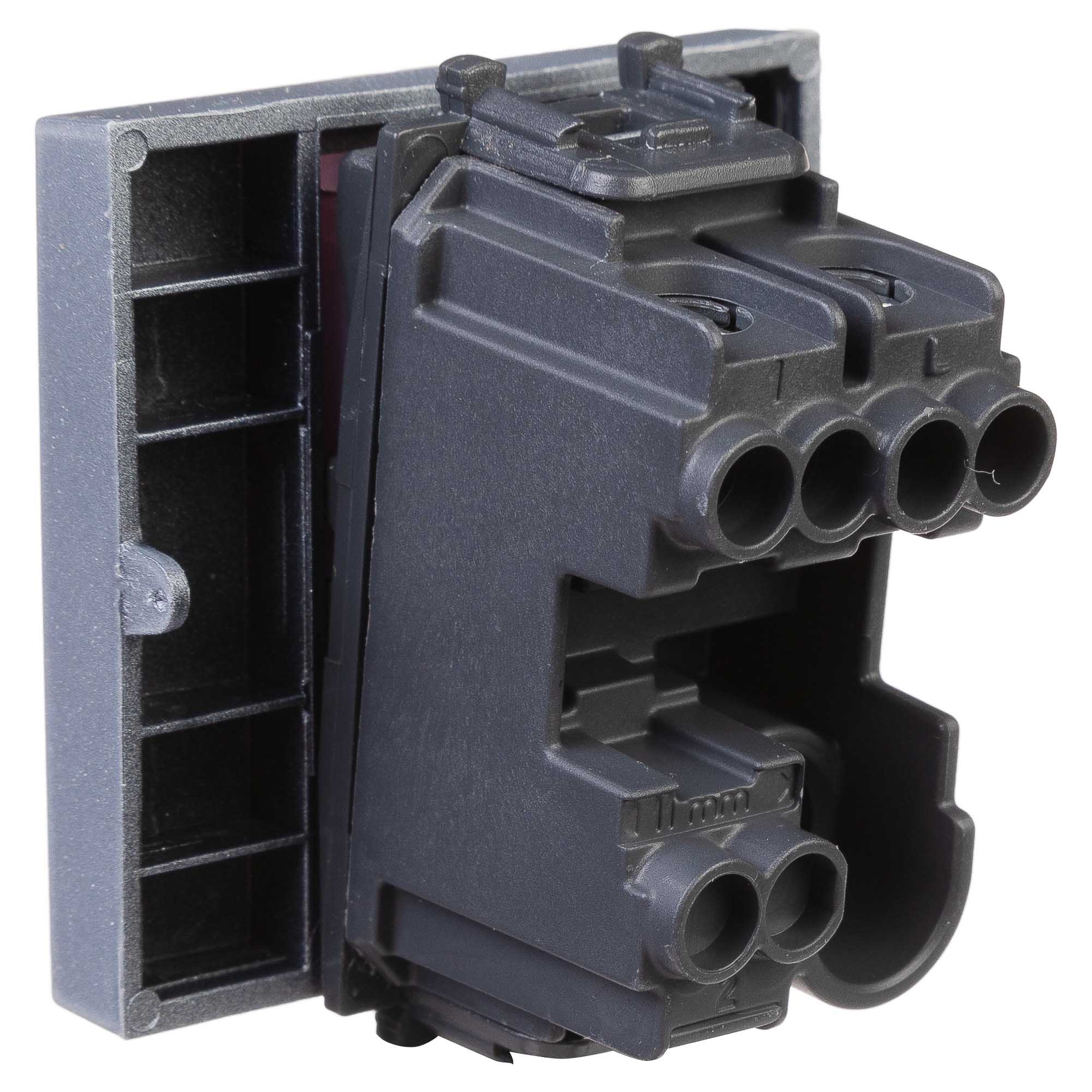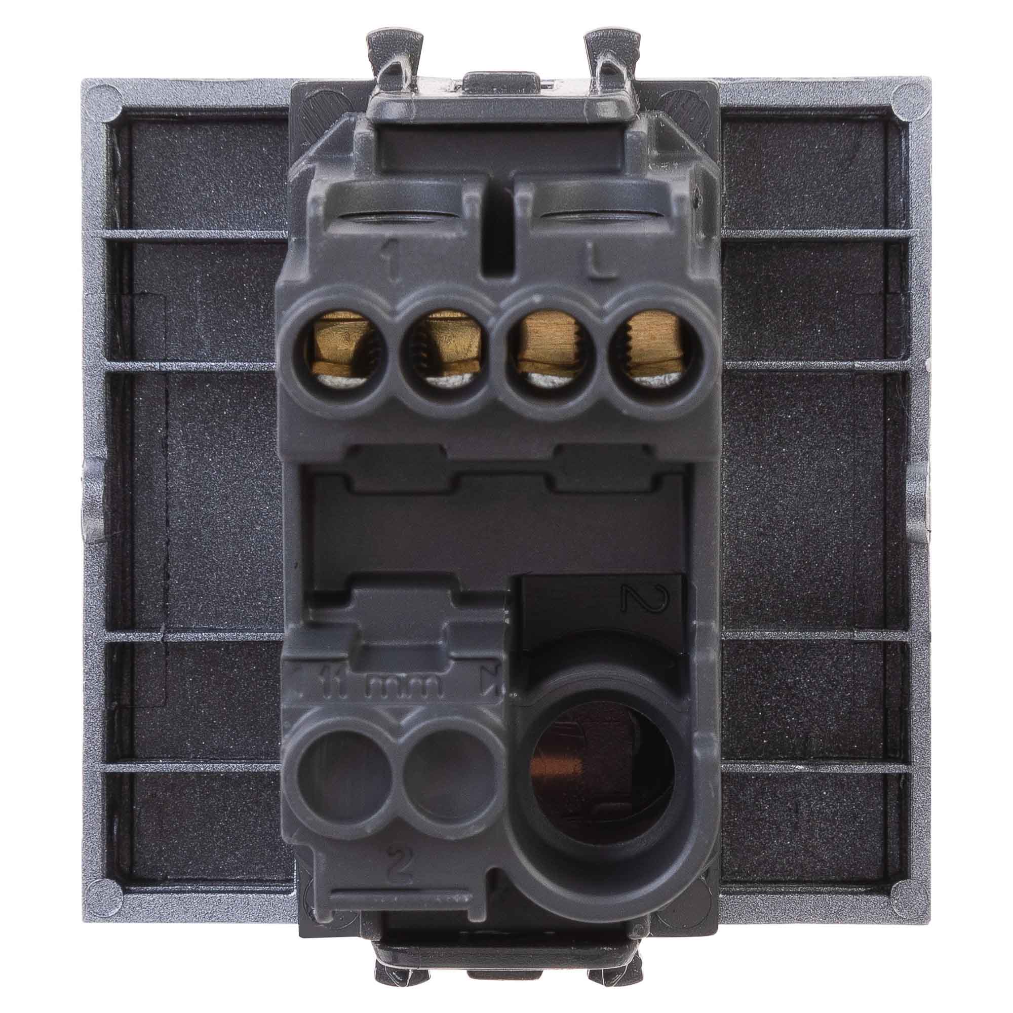 Выключатель одноклавишный однополюсный, модульный. Предназначен для монтажа в системы "In-liner Front" и "In-liner Aero" при помощи рамок-суппортов и каркасов "Avanti" (код 4400912 и т.д.); используется для включения/выключения освещения. Характеристики: диаметр отверстий для ввода кабелей – 3 мм (по 2 отверстия на одну клемму); винтовые зажимы; шаблон для зачистки кабеля – 11 мм; номинальный ток – 16 A; номинальное напряжение – 230 В; возможна фиксация в подрозеточные коробки при помощи каркаса с лапками (код 4400802) и саморезов. 2 модуля. Цвет: "Закаленная сталь".