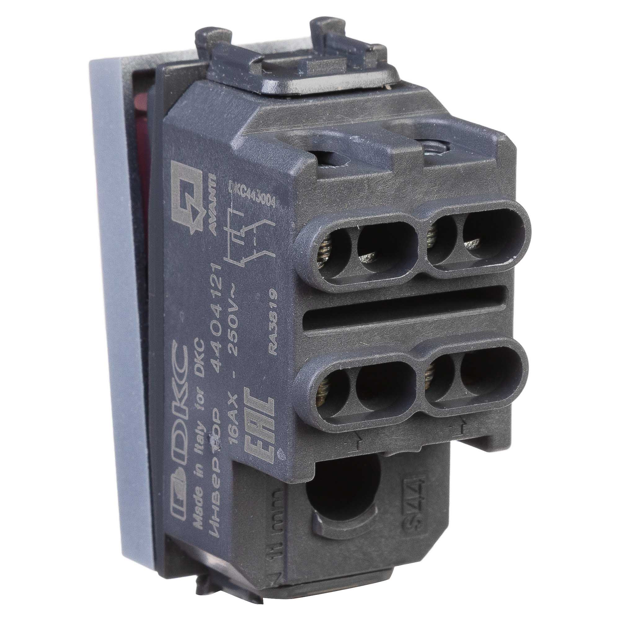 Инвертор одноклавишный модульный. Назначение: для монтажа в системы "In-liner Front" и "In-liner Aero" при помощи рамок-суппортов. и каркасов "Avanti" (код 4400912 и т.д.); включение/выключение освещения с трех и более мест. Характеристики: диаметр отверстий для ввода кабелей – 3 мм (по 2 отверстия на одну клемму); винтовые зажимы; шаблон для зачистки кабеля – 11 мм; номинальный ток – 16 A; номинальное напряжение – 230 В; фиксация в подрозеточные коробки при помощи каркаса с лапками (код 4400802) и саморезов. Кол-во модулей: 1. Цвет: "Закаленная сталь".