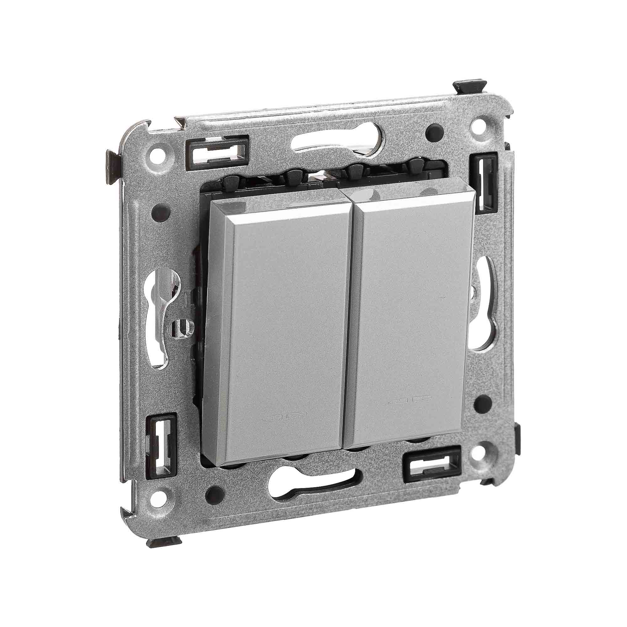 Инвертор двухклавишный. Назначение: для монтажа в подрозеточные коробки глубиной не менее 45 мм (код 59301). Используется для включения/выключения освещения с трех и более мест. Характеристики: 2 модуля, диаметр отверстий для ввода кабелей – 3 мм (по 2 отверстия на одну клемму); винтовые зажимы; фиксация в подрозеточную коробку при помощи саморезов; шаблон для зачистки кабеля – 11 мм; номинальный ток – 16 A; номинальное напряжение – 230 В. Цвет: "Закаленная сталь".