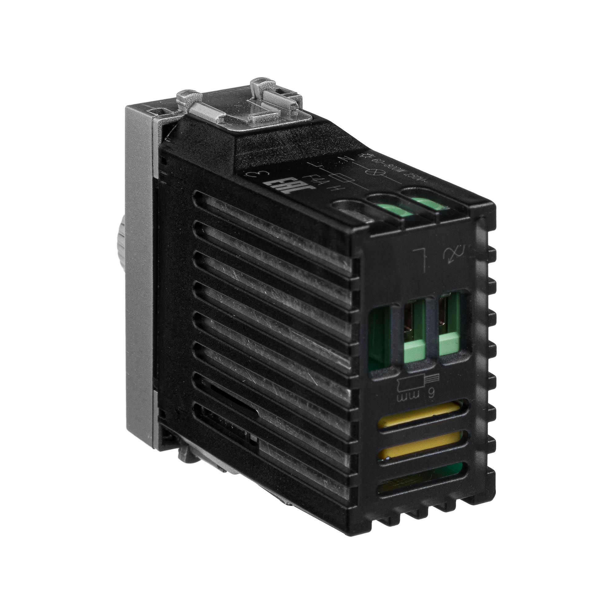 Диммер поворотный модульный. Назначение: для монтажа в системы "In-liner Front" и "In-liner Aero" при помощи рамок-суппортов и каркасов "Avanti" (код 4400912 и т.д.); управление освещением помещения; регулирование 60–800 Вт для ламп накаливания и галогенных ламп. Характеристики: диаметр отверстий для ввода кабелей – 3 мм; винтовые зажимы; шаблон для зачистки кабеля – 11 мм; встроенная подсветка; фиксация в подрозеточные коробки глубиной не менее 45 мм при помощи каркаса с лапками (код 4400802) и саморезов. Кол-во модулей: 1. Цвет: "Закаленная сталь".