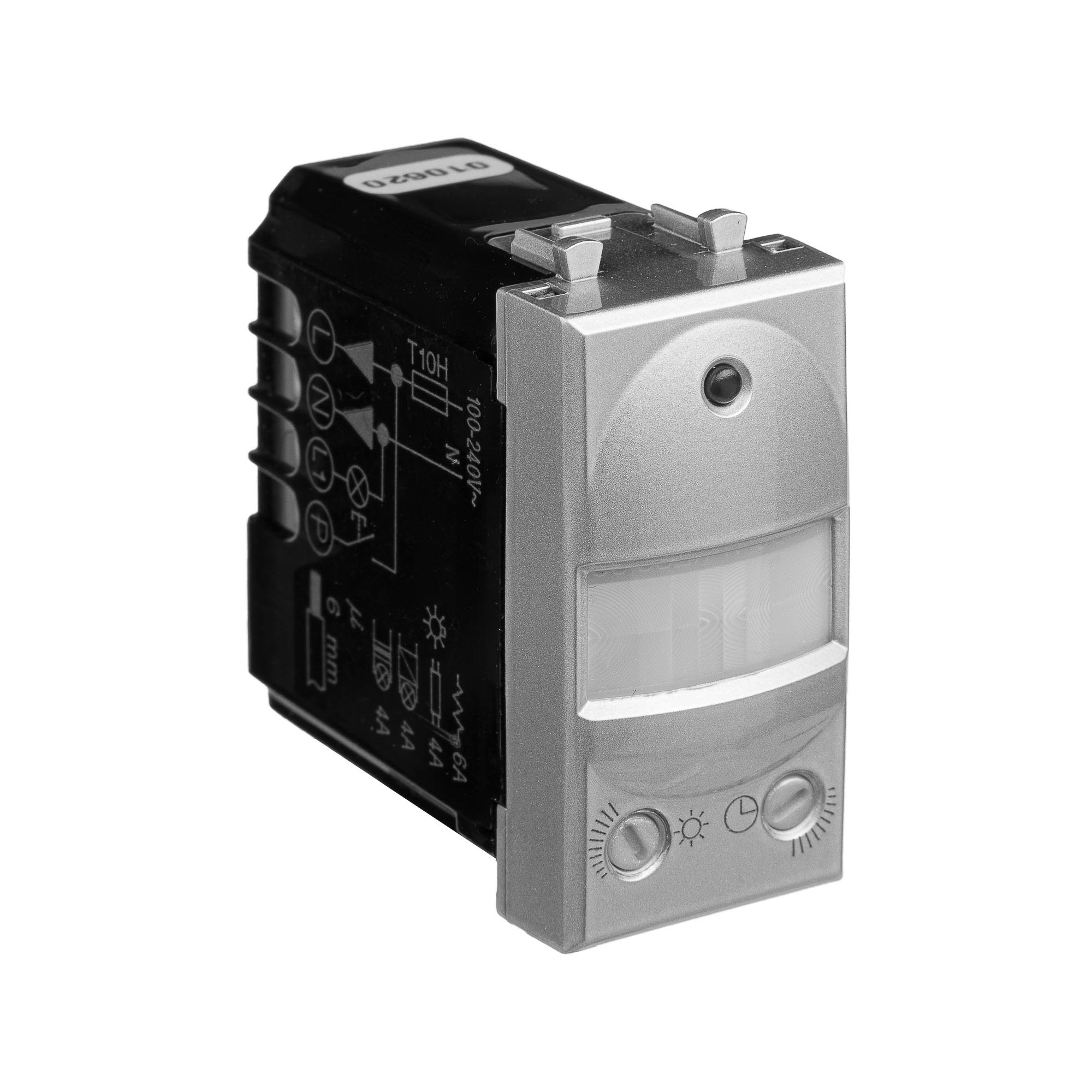 Датчик движения модульный. Назначение: для монтажа в системы "In-liner Front" и "In-liner Aero" при помощи рамок-суппортов и каркасов "Avanti" (код 4400912 и т.д.); автоматическое включение/выключение света. Характеристики: диаметр отверстий для ввода кабелей – 3 мм; винтовые зажимы; шаблон для зачистки кабеля – 11 мм; расстояние обнаружения – от 2 до 12 м угол охвата – 150°; время задержки отключения (от 10 с до 7 мин.); настройка светочувствительности датчика; настройка порога освещенности; фиксация в подрозеточные коробки глубиной не менее 45 мм при помощи каркаса с лапками (код 4400802) и саморезов. Кол-во модулей: 1. Цвет: "Закаленная сталь".
