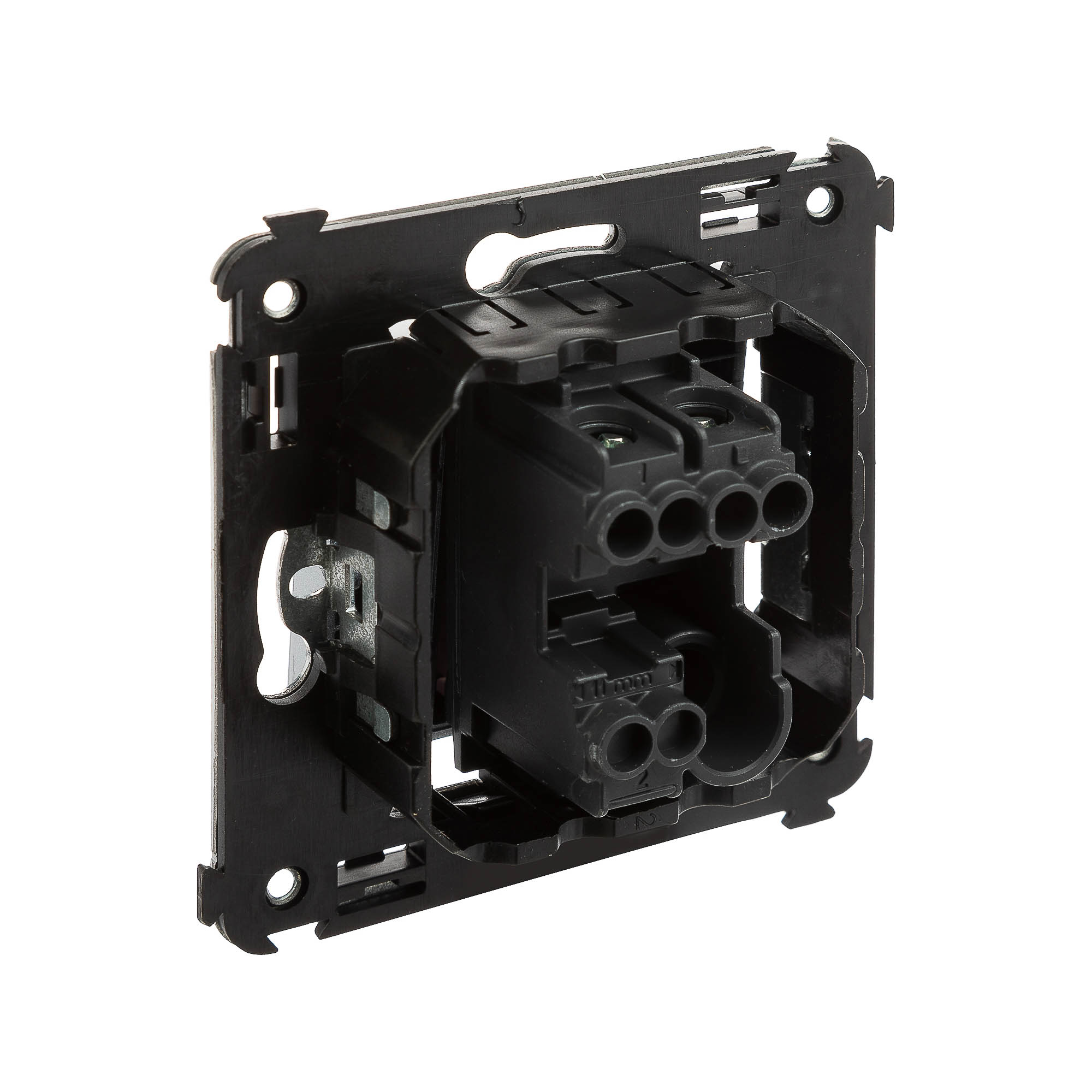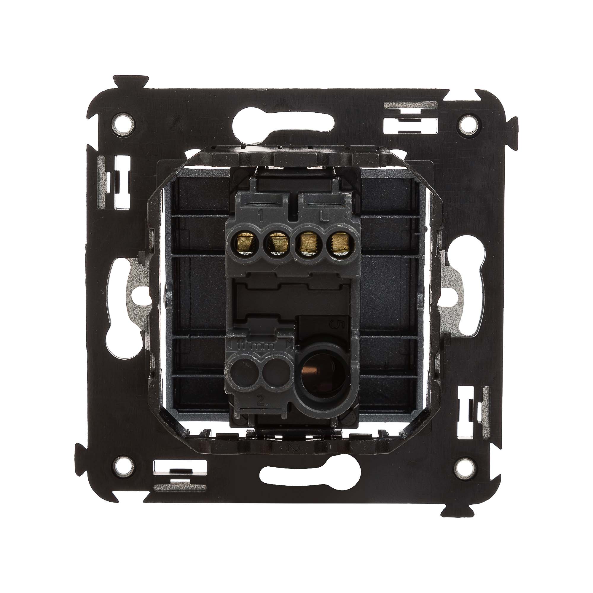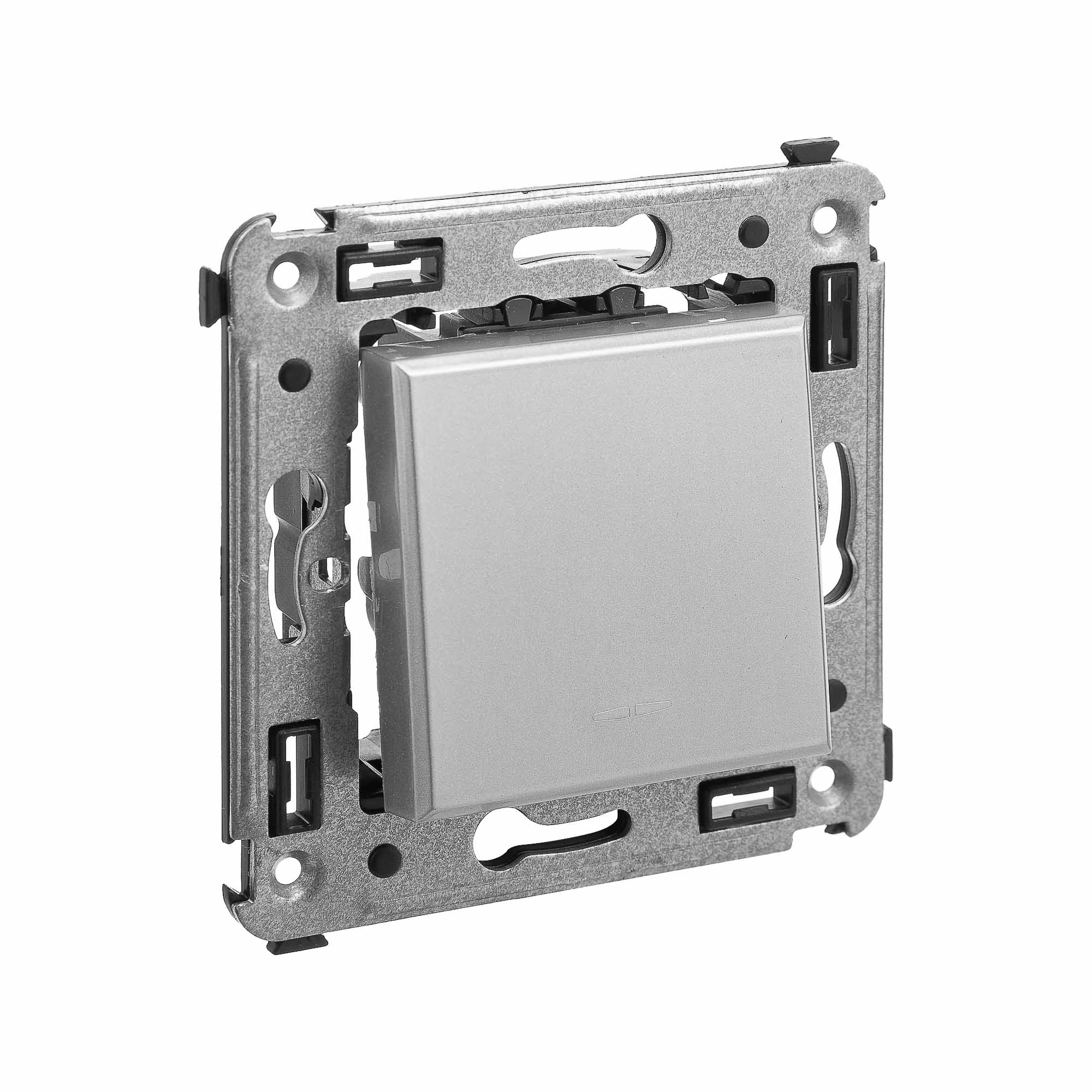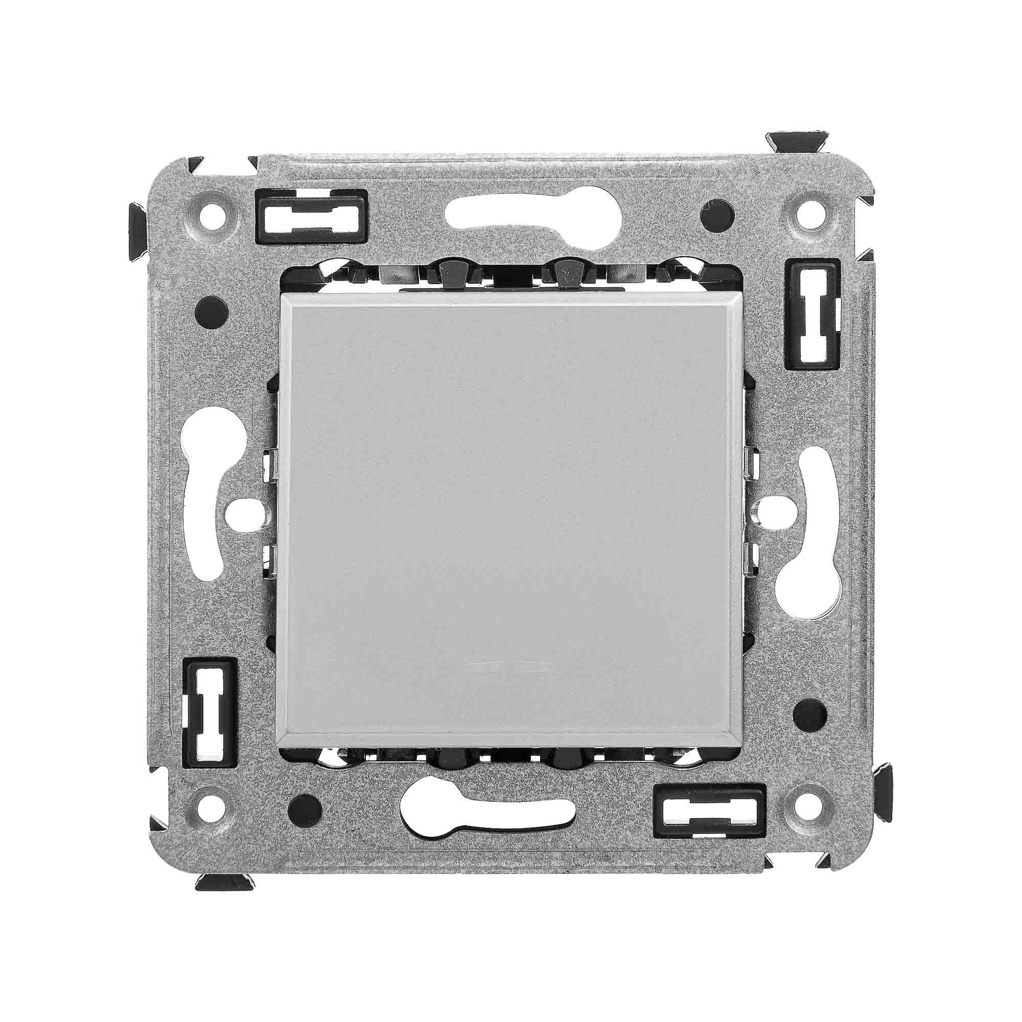 Кнопка одноклавишная. Назначение: для монтажа в подрозеточные коробки глубиной не менее 45 мм (код 59301). Используется в качестве кратковременного включения источника питания энергией. Характеристики: 2 модуля, диаметр отверстий для ввода кабелей – 3 мм (по 2 отверстия на одну клемму); винтовые зажимы;. шаблон для зачистки кабеля – 11 мм; номинальный ток – 10 A; номинальное напряжение – 230 В; фиксация в подрозеточные коробки при помощи каркаса с лапками (код 4400802) и. саморезов. Цвет: "Закаленная сталь".