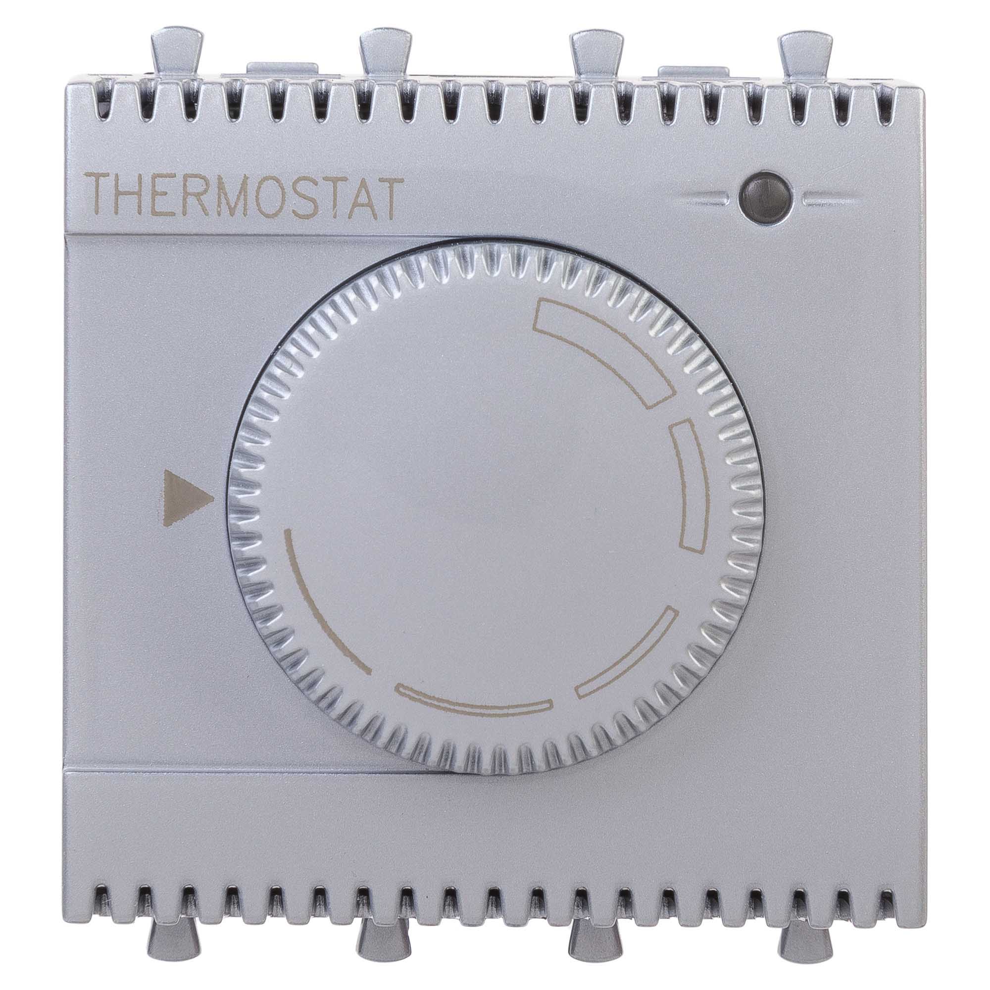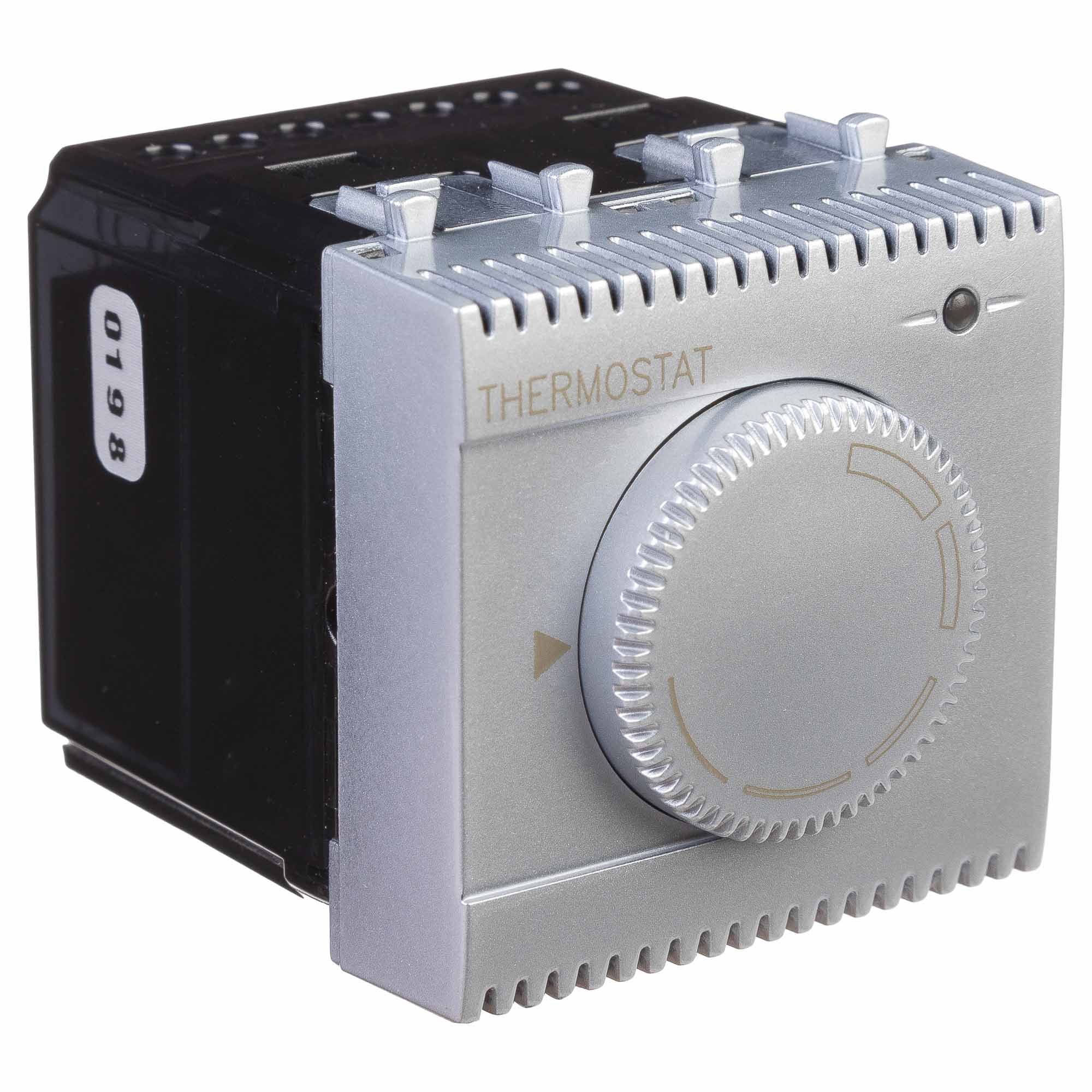 Термостат модульный для теплых полов. Назначение: для монтажа в системы "In-liner Front" и "In-liner Aero" при помощи рамок-суппортов и каркасов "Avanti" (код 4400912 и т.д.); управление теплыми полами. Характеристики: диапазон от 5 до 30 °С; частота – 50–60 Гц; номинальное напряжение – 230 В; лампа-индикатор включается, когда температура в комнате падает ниже выбранного значения; нагрузка: 5 A – cosφ=1, 2 A – cosφ=0,4; фиксация в подрозеточные коробки глубиной не менее 45 мм при помощи каркаса с лапками (код 4400802) и саморезов. Кол-во модулей: 2. Цвет: "Закаленная сталь"