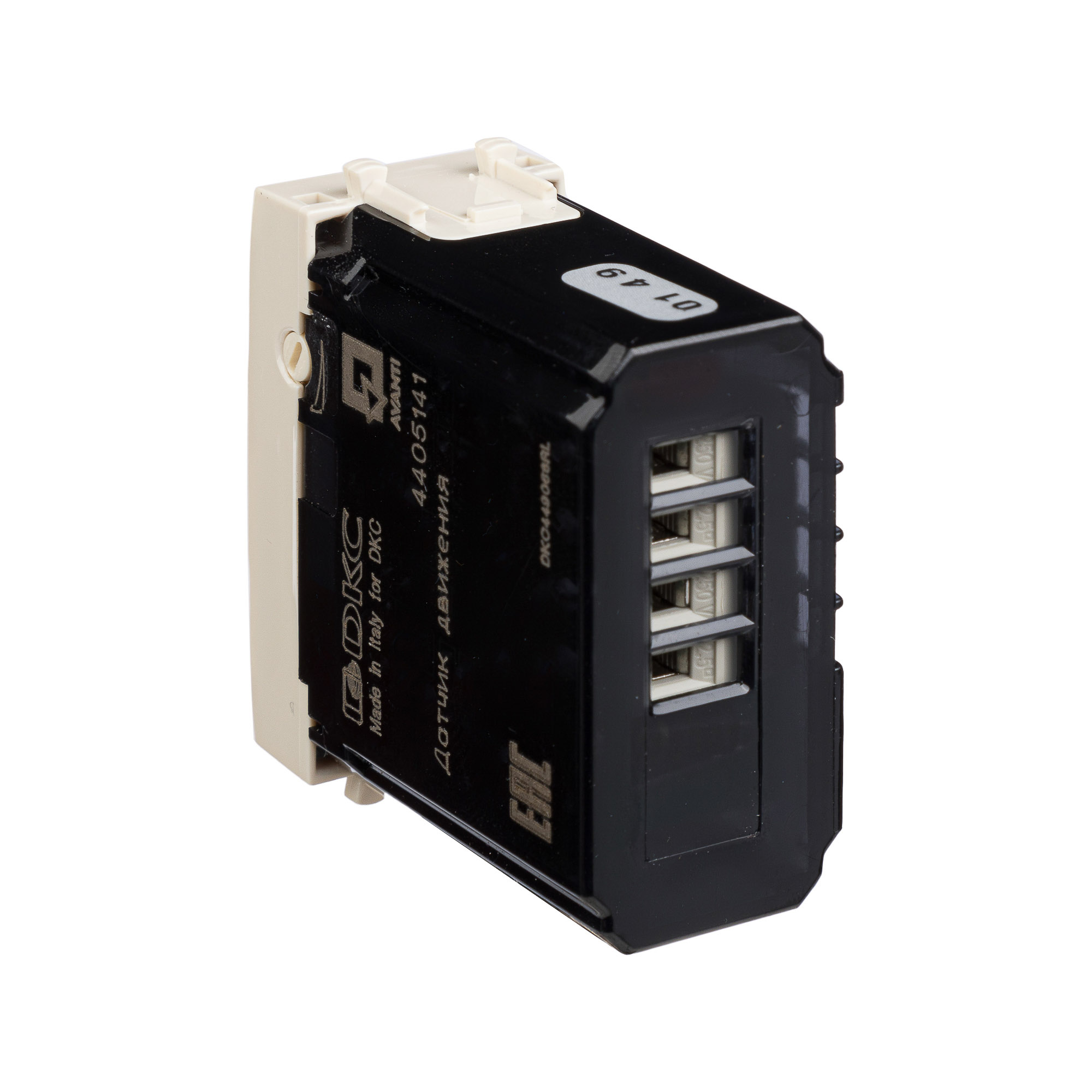 Модульный датчик движения ДКС – составная часть электроустановочных изделий серии "Avanti". Прибор размещается в кабель-канале. Его применение позволяет автоматически включать свет в проходных зонах во время присутствия там людей и выключать – когда движения в этой зоне нет. В датчиках установлен пассивный инфракрасный сенсор с дальностью действия 9 метров (фронтально) и углом сканирования 180 градусов.