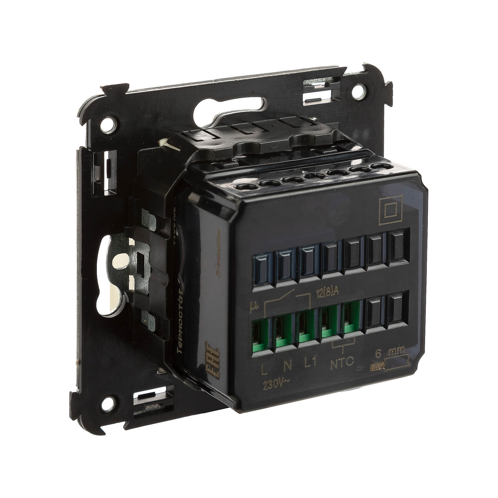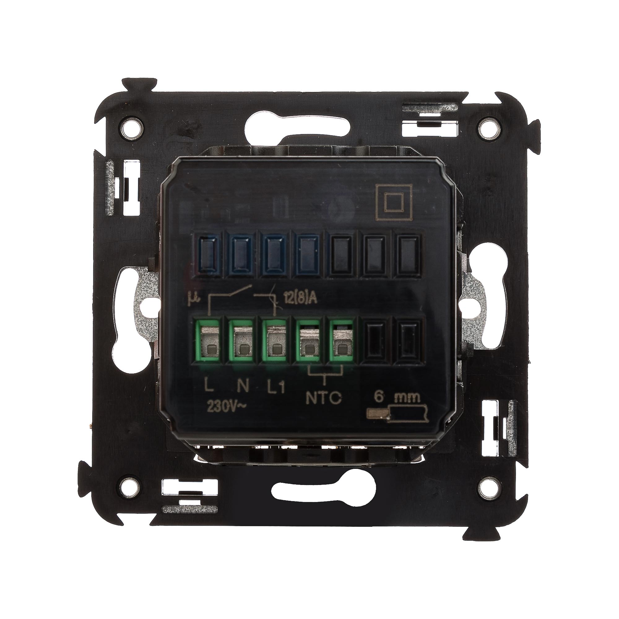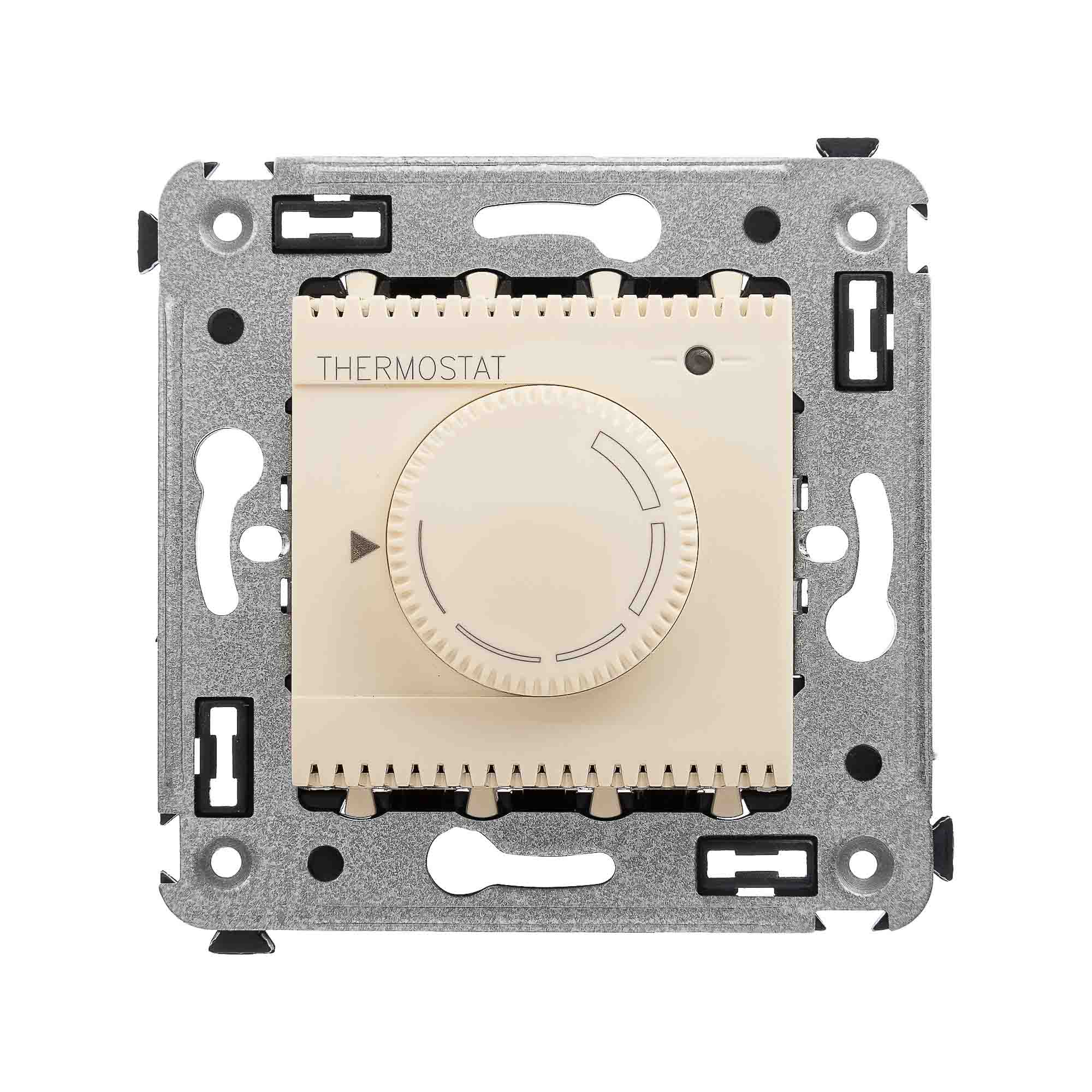 Термостат для теплых полов. Назначение: для монтажа в подрозеточные коробки глубиной не менее 45 мм (код 59301);. Предназначен для управления теплыми полами. Характеристики: диапазон от 5 до 30 °С; частота – 50–60 Гц; номинальное напряжение – 230 В; лампа - индикатор включается, когда температура в комнате падает ниже выбранного значения; нагрузка: 12 A – cosφ=1; 4,8 A – cosφ=0,4; фиксация в подрозеточные коробки глубиной не менее 45 мм при помощи каркаса с лапками (код 4400802) и саморезов; провод датчика температуры в комплекте (длина 3,5 метра). Цвет: "Ванильная дымка".