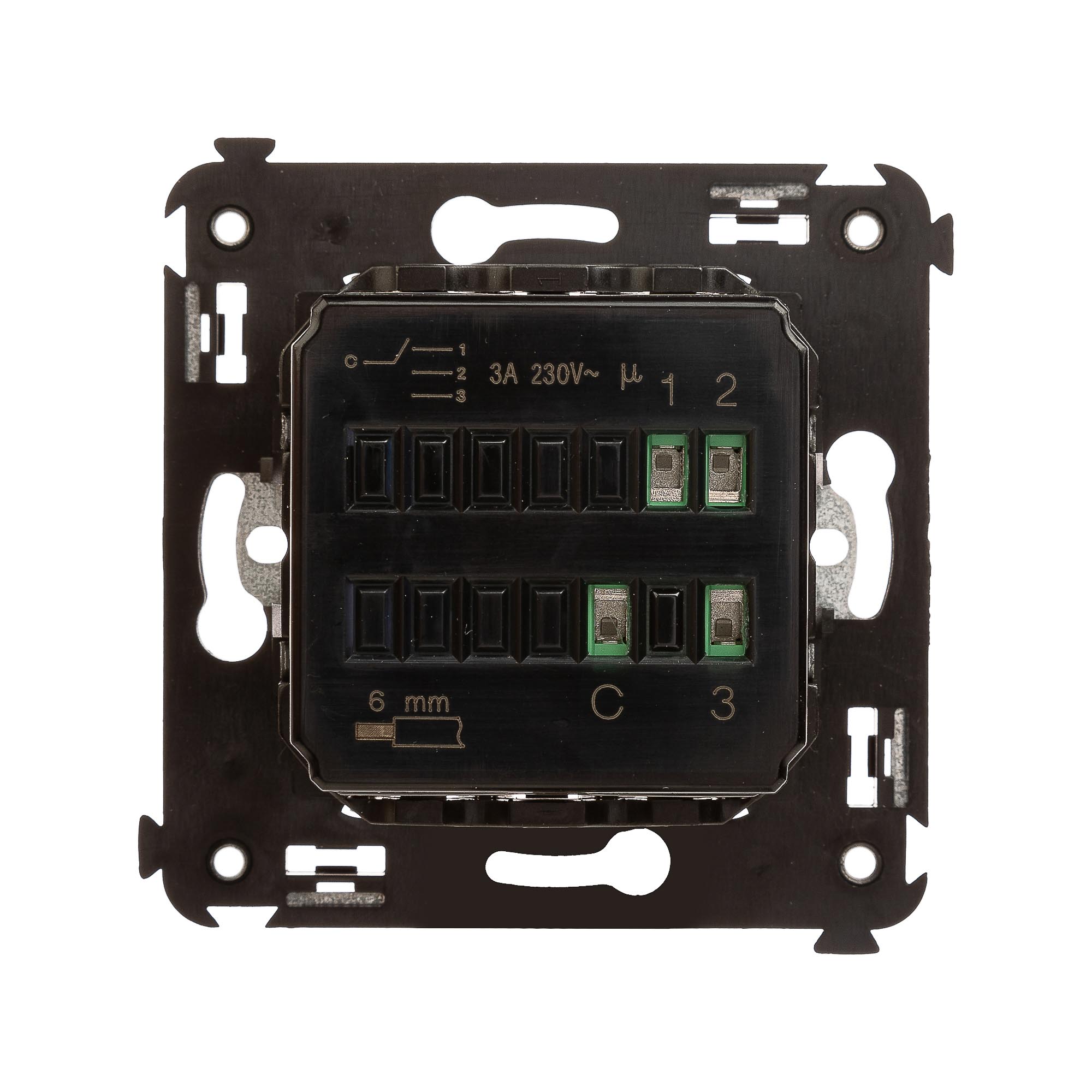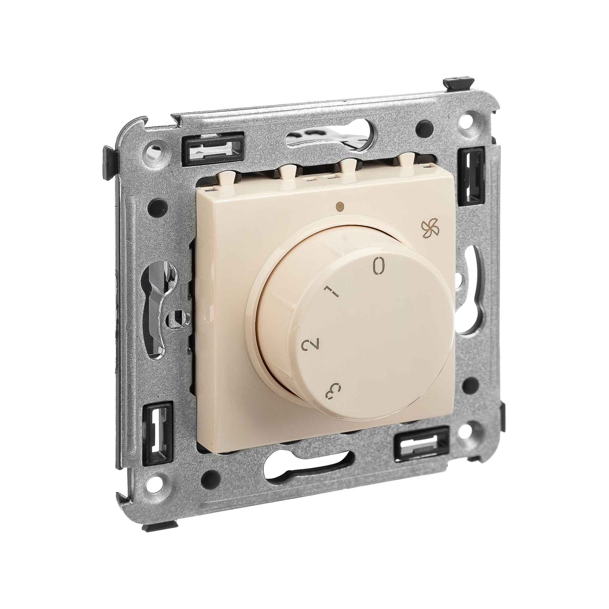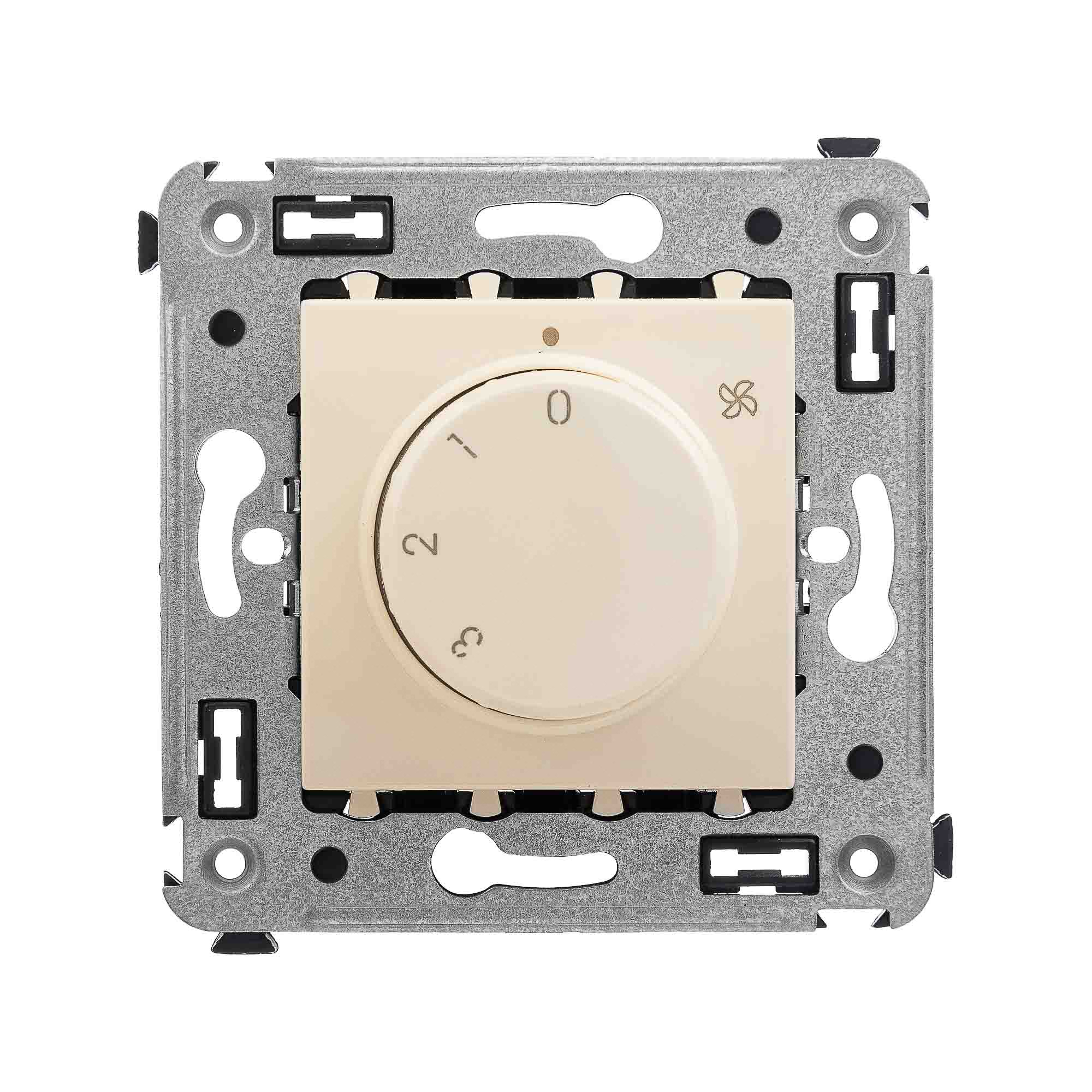 Механизм управления вентиляторами. Назначение: для монтажа в подрозеточные коробки глубиной не менее 45 мм (код 59301);. Предназначен для управления вентиляторами. Характеристики: номинальное напряжение – 230 В; 3 скорости работы; диаметр отверстий для ввода кабелей – 3 мм; винтовые зажимы; шаблон для зачистки кабеля – 11 мм; фиксация в подрозеточные коробки глубиной не менее 45 мм при помощи каркаса с лапками (код 4400802) и саморезов. Цвет:"Ванильная дымка".