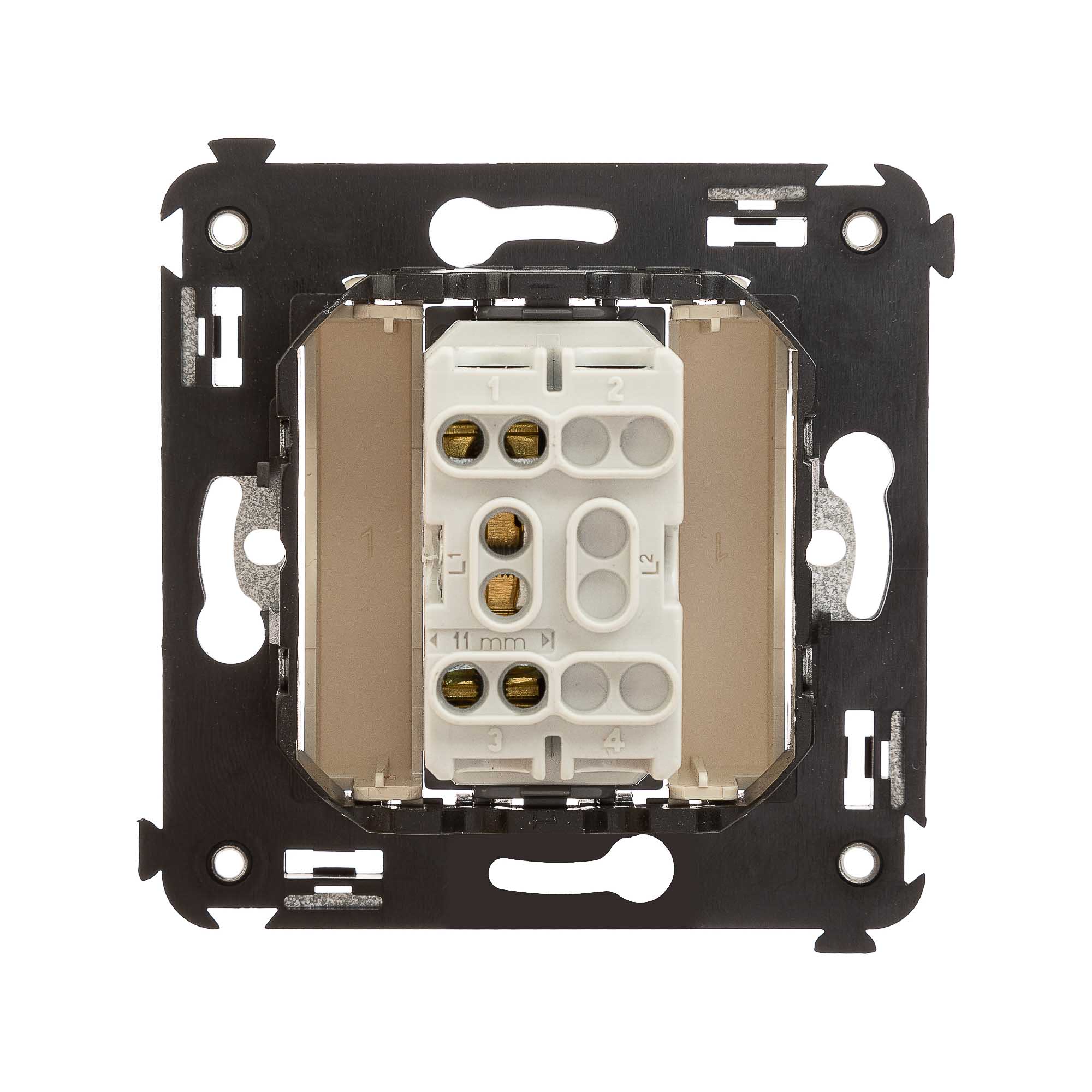 Механизм управления рольставнями. Назначение: предназначен для управления приводом рольставней и штор. Характеристики: номинальное напряжение – 230 В; диаметр отверстий для ввода кабелей – 3 мм; винтовые зажимы; шаблон для зачистки кабеля – 11 мм. Механизм устанавливается в подрозеточные коробки глубиной не менее 45 мм (код 59301) при помощи каркаса с лапками (код 4400802) и саморезов. Цвет: "Ванильная дымка"
