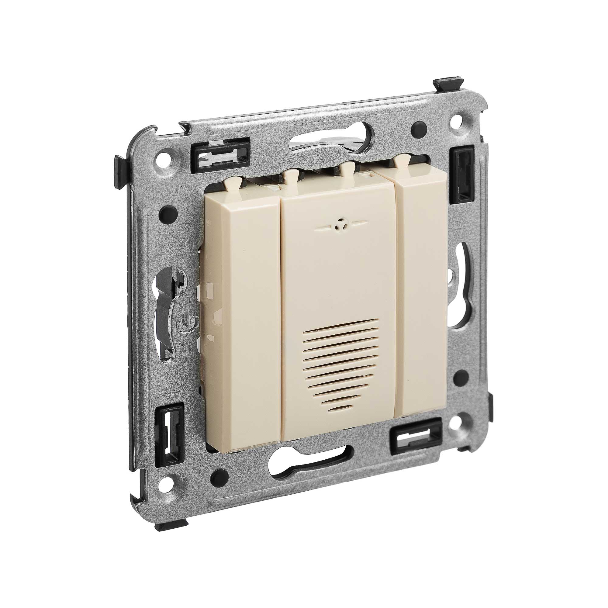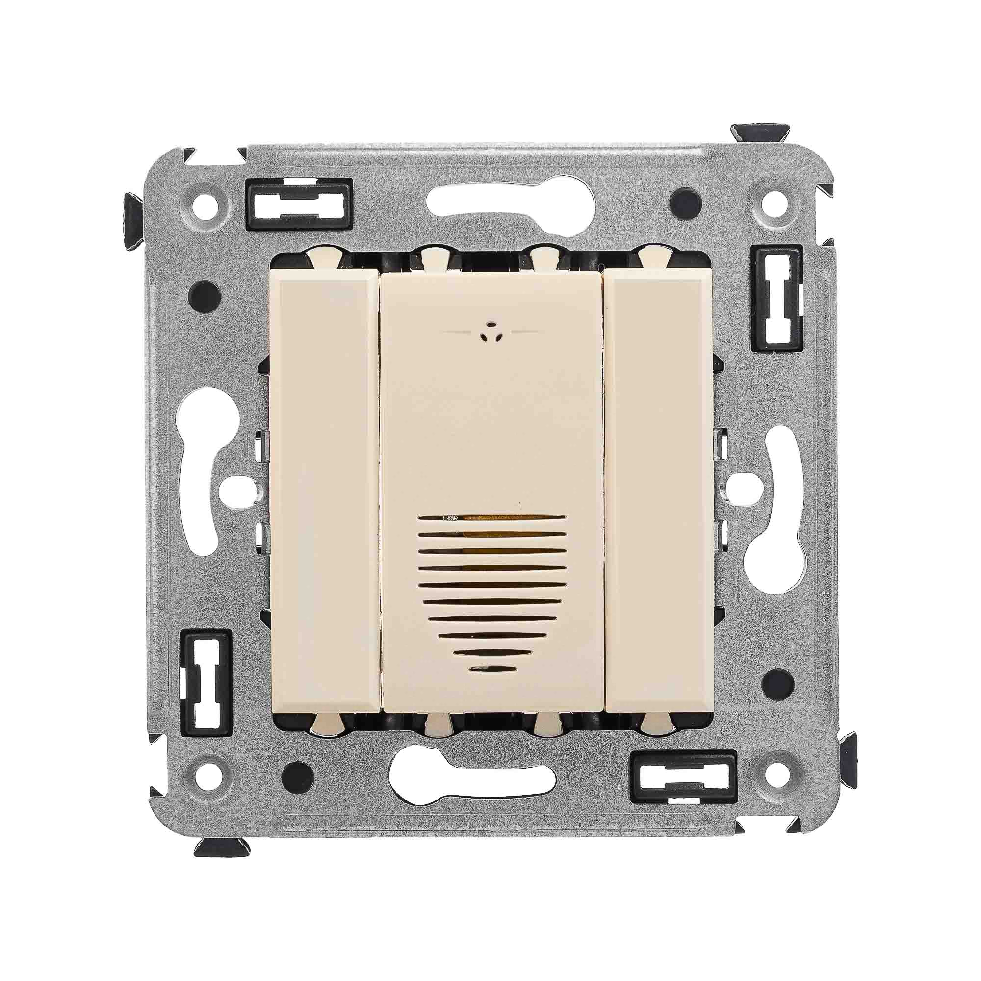 Звонок. Назначение: для монтажа в подрозеточные коробки глубиной не менее 45 мм (код 59301). Предназначен для звуковой индикации. Характеристики: винтовые зажимы;. номинальное напряжение – 230 В; фиксация в подрозеточные коробки глубиной не менее 45 мм при помощи каркаса с лапками. (код 4400802) и саморезов. Цвет: "Ванильная дымка".