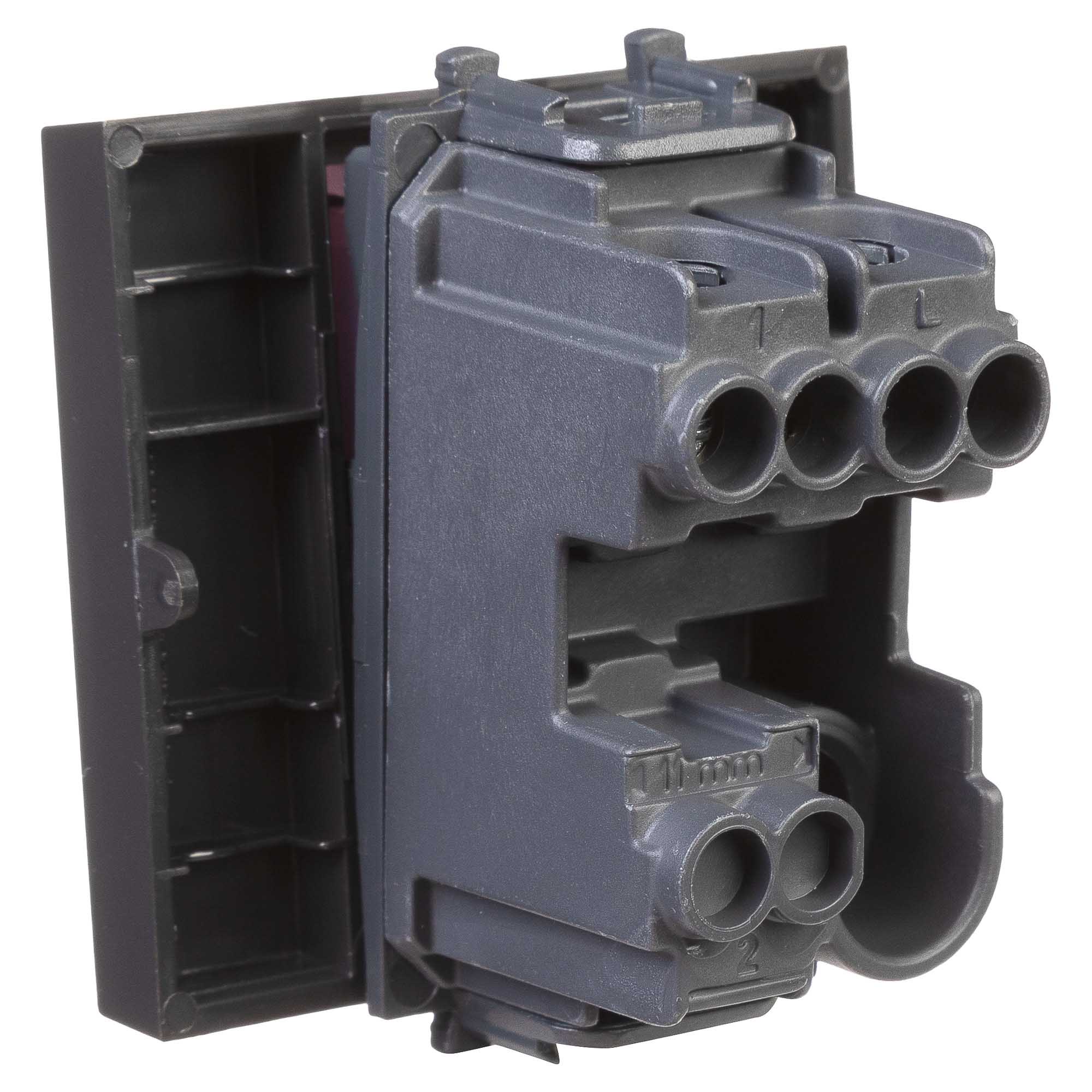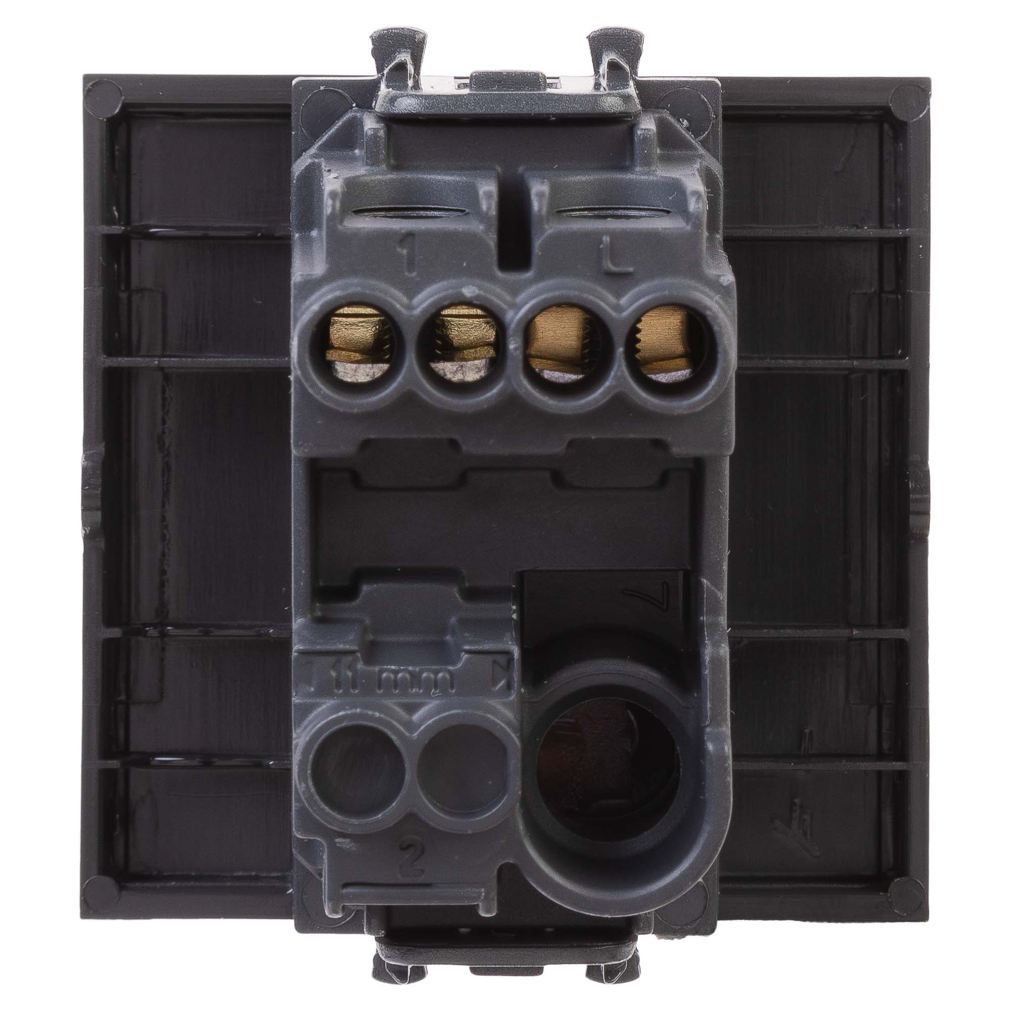 Выключатель одноклавишный однополюсный, модульный. Предназначен для монтажа в системы "In-liner Front" и "In-liner Aero" при помощи рамок-суппортов и каркасов "Avanti" (код 4400912 и т.д.). Используется для включения/выключения освещения. Характеристики: диаметр отверстий для ввода кабелей – 3 мм (по 2 отверстия на одну клемму); винтовые зажимы; шаблон для зачистки кабеля – 11 мм; номинальный ток – 16 A; номинальное напряжение – 230 В. Возможна фиксация в подрозеточные коробки при помощи каркаса с лапками (код 4400802) и саморезов. 2 модуля. Цвет: "Черный матовый".