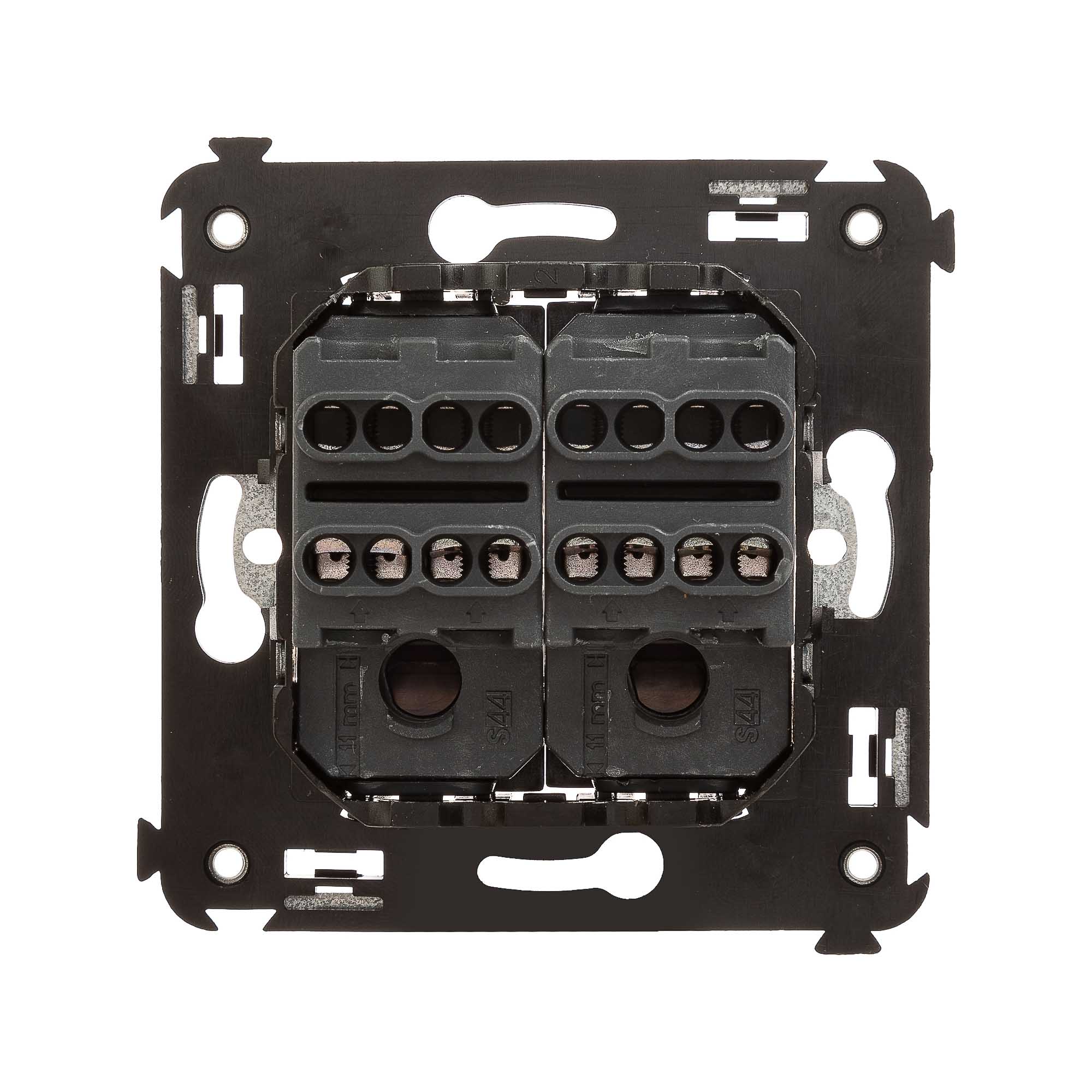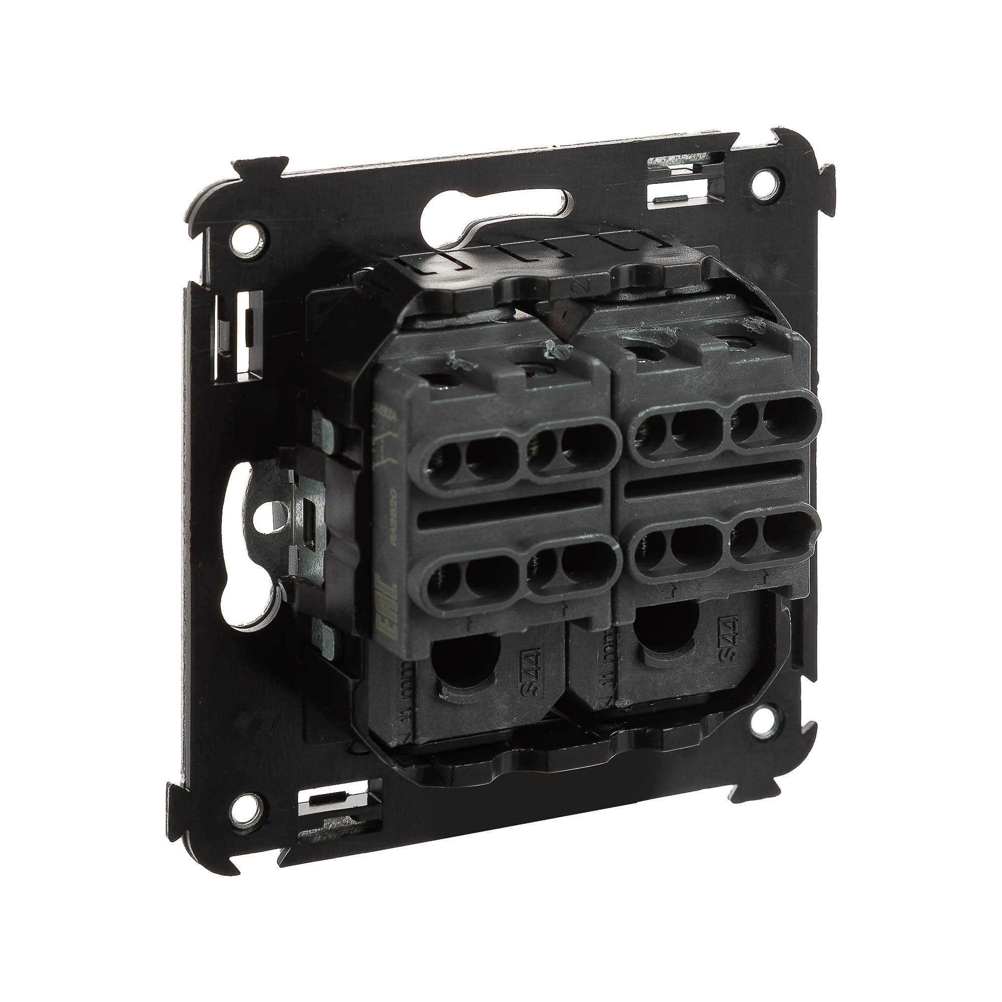 Инвертор двухклавишный. Назначение: для монтажа в подрозеточные коробки глубиной не менее 45 мм (код 59301). Используется для включения/выключения освещения из трех и более мест. Характеристики: 2 модуля, диаметр отверстий для ввода кабелей – 3 мм (по 2 отверстия на одну клемму); винтовые зажимы; шаблон для зачистки кабеля – 11 мм; номинальный ток – 16 A; номинальное напряжение – 230 В. Фиксация производится в подрозеточную коробку при помощи саморезов. Цвет: "Черный матовый".