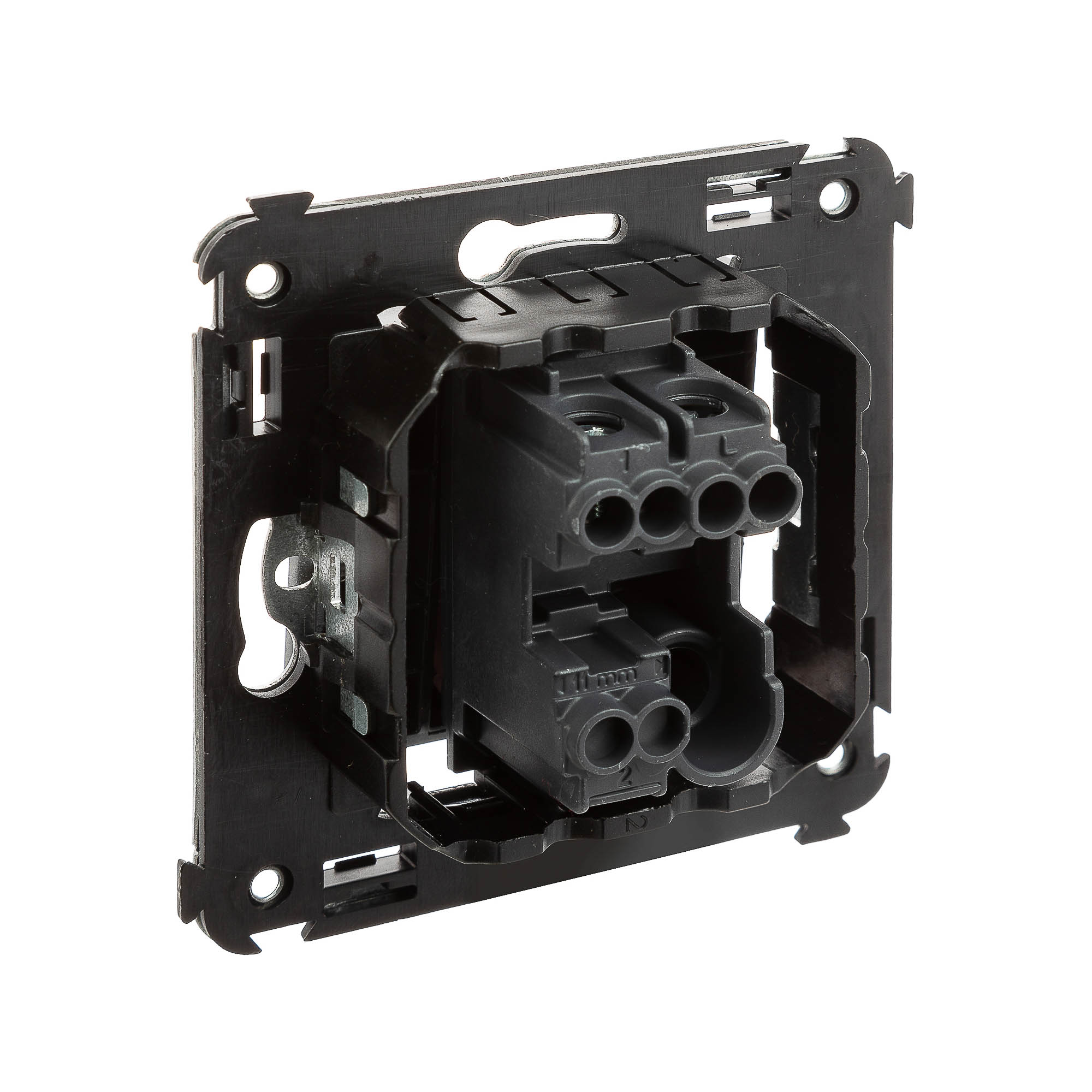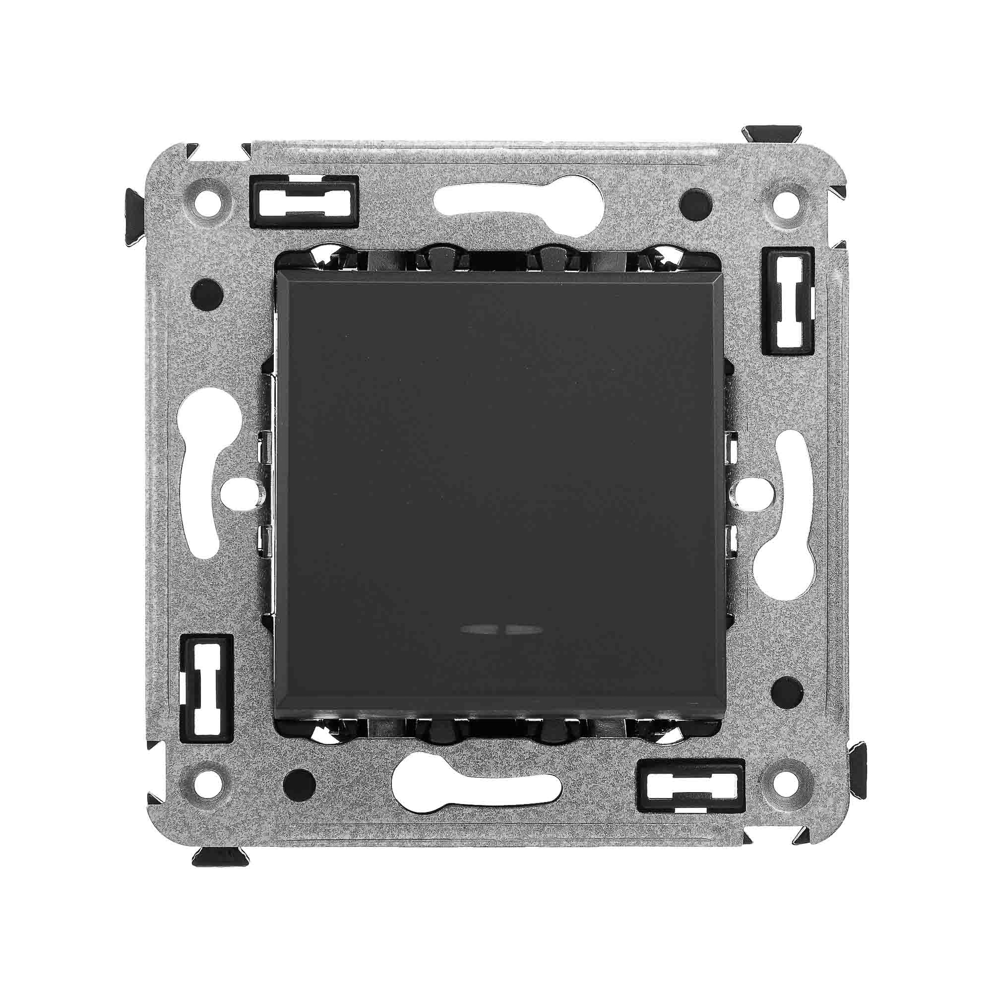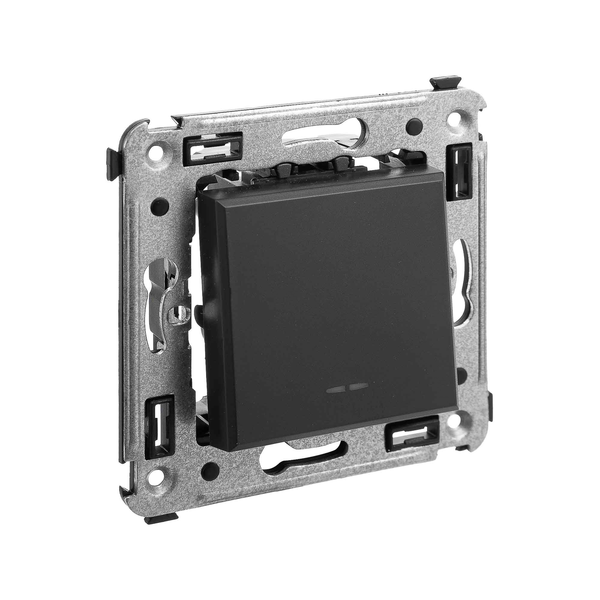 Кнопка одноклавишная. Назначение: для монтажа в подрозеточные коробки глубиной не менее 45 мм (код 59301). Используется в качестве кратковременного включения источника питания энергией. Характеристики: 2 модуля, диаметр отверстий для ввода кабелей – 3 мм (по 2 отверстия на одну клемму); винтовые зажимы; шаблон для зачистки кабеля – 11 мм; номинальный ток – 10 A; номинальное напряжение – 230 В; фиксация в подрозеточные коробки при помощи каркаса с лапками (код 4400802) и саморезов. Цвет: "Черный матовый".