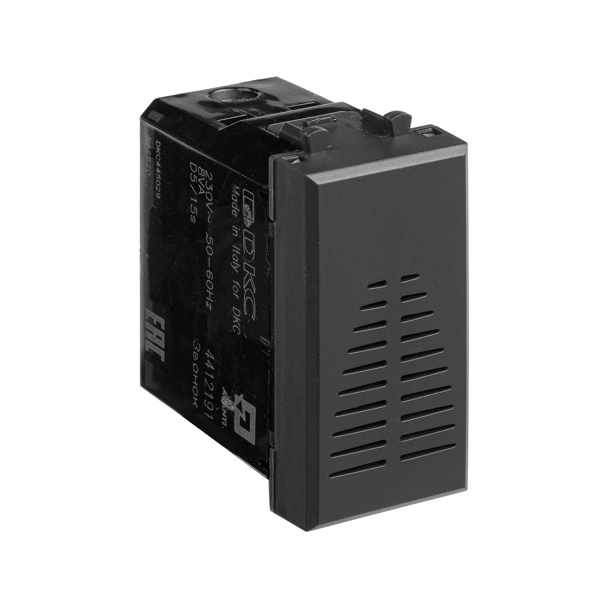 Модульный звонок от ДКС (1 модуль) – прибор, издающий звуковой сигнал. Проводной звонок – элемент модульных ЭУИ, питается от электросети. Номинальное напряжение – 230 В. Материал – пластик. Монтаж производится в кабель - каналы систем "In - liner Front" и "In - liner Aero". Цвет звонка – "Черный матовый".