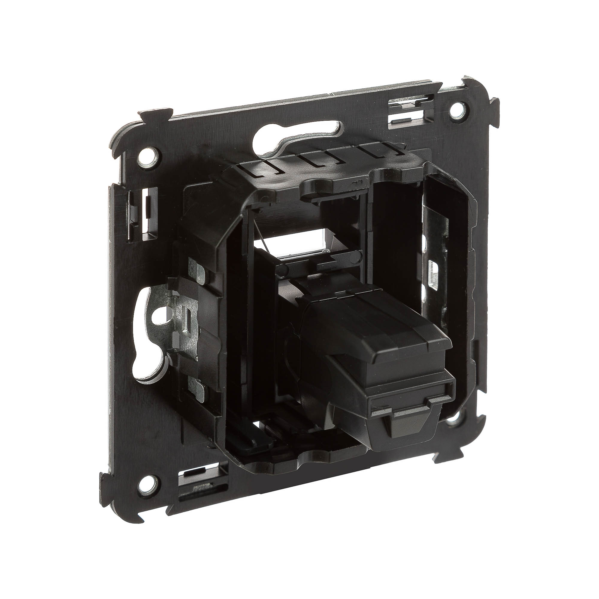 USB 2.0 розетка одиночная в стену. Предназначена для монтажа в подрозеточные коробки глубиной не менее 45 мм (код 59301). Используется в качестве информационной розетки для передачи сигнала (подключение проекторов, мониторов и др.). 2 модуля. Цвет: "Черный матовый".