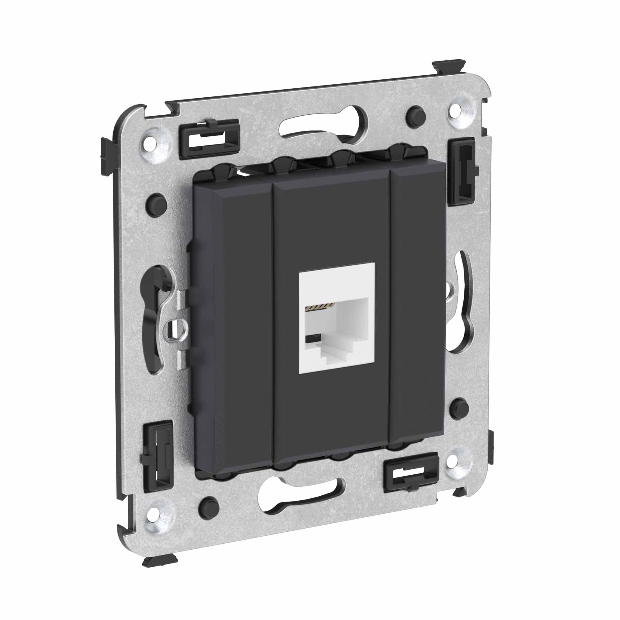 Телефонная розетка RJ - 12 без шторки используется для коммутации линий телефонной связи в патч - панелях или для связи телефонных аппаратов с розеткой. Предназначена для скрытого монтажа в стену, поставляется в комплекте с суппортом. Материал – металл, термопласт. Пластиковые детали электроустановочного изделия имеют цвет "Черный матовый".