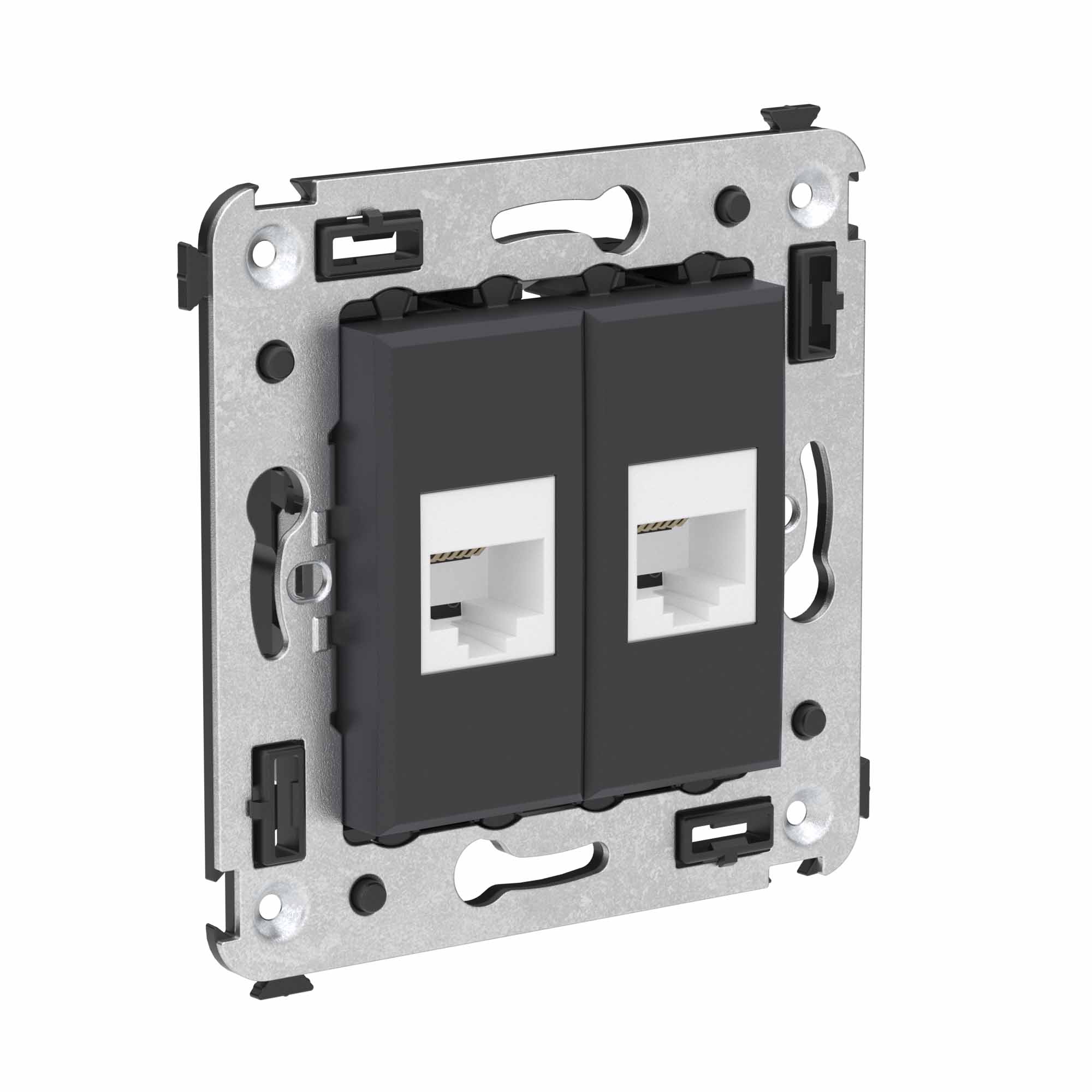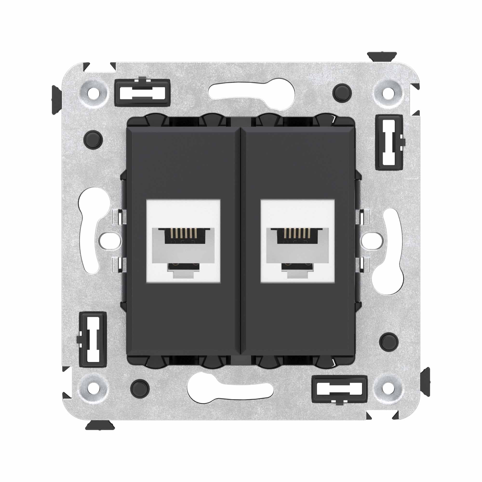 Телефонная розетка RJ - 12 двойная без шторки используется для коммутации линий телефонной связи в патч - панелях или для связи телефонных аппаратов с розеткой. Предназначена для скрытого монтажа в стену, поставляется в комплекте с суппортом. Материал – металл, термопласт. Пластиковые детали электроустановочного изделия имеют цвет "Черный матовый".