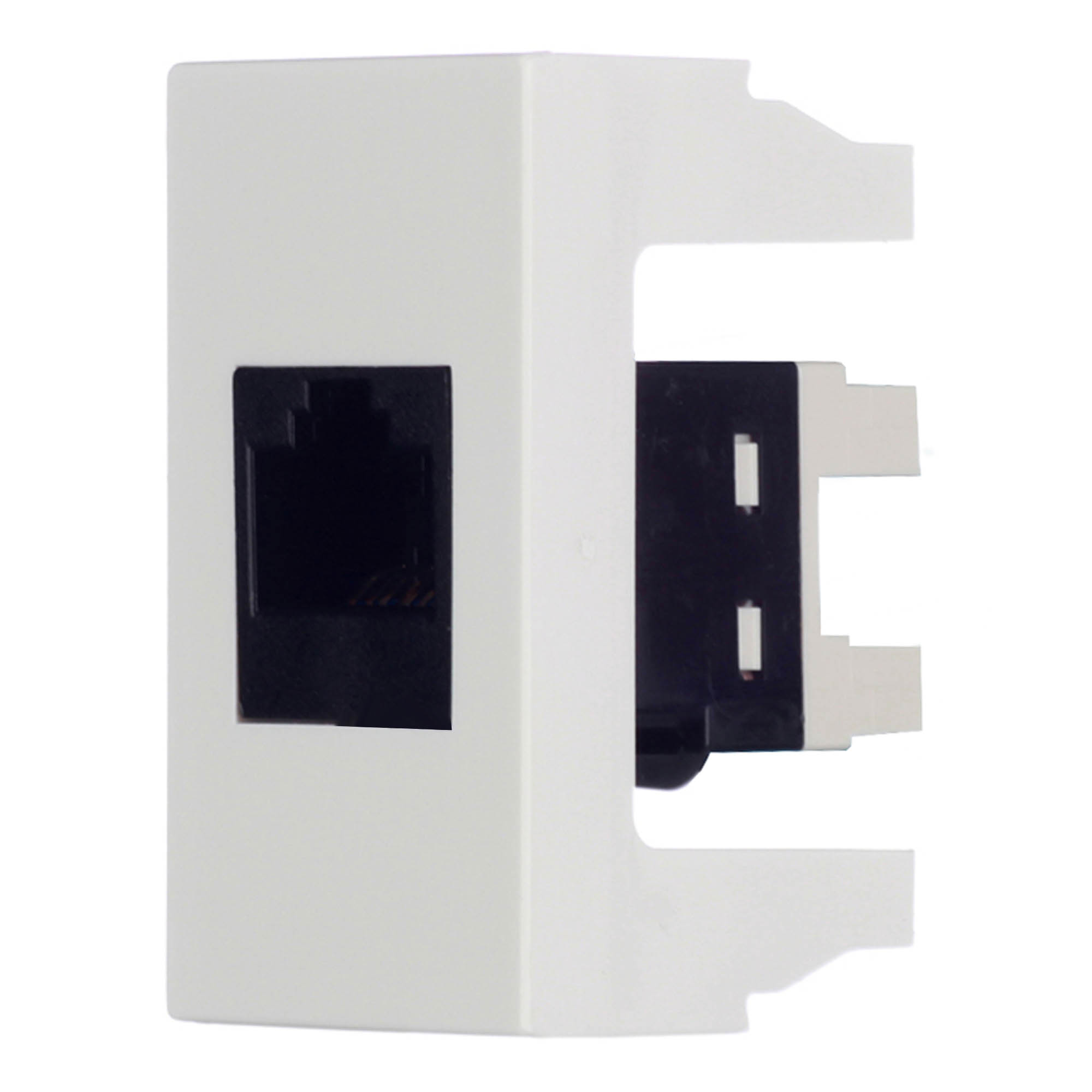 Телефонная розетка. Назначение: подсоединение телефонного кабеля. Характеристики: 6Р6С; комплектуются 1-модульным гнездом; все гнезда производства АМР имеют хвостовик для ограничения перегиба и натяжения кабеля; для заделки контактов в розетки АМР использовать инструмент типа 110. RJ-12. Установочный размер: 45х25. Кол-во модулей: 1. Цвет: белый. Цвет Keystone: белый.