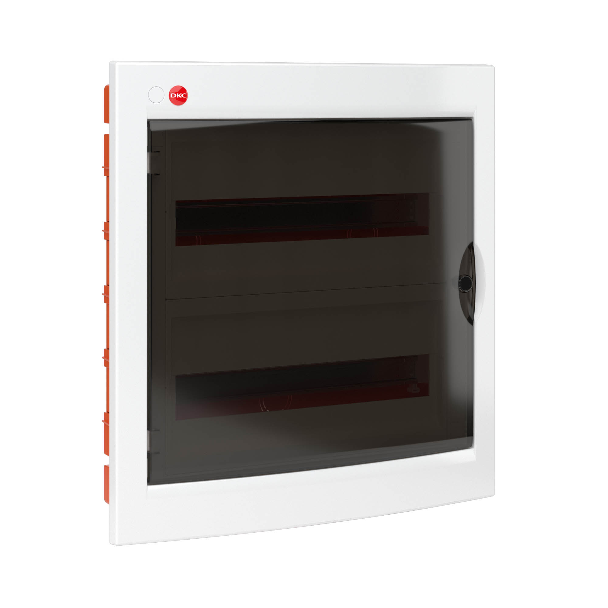 Встраиваемый распределительный щиток ДКС предназначен для монтажа в жилых и административных помещениях для установки автоматических выключателей любых производителей: таймеров, устройств защитного отключения и управления освещением и т.д. Щиток имеет оцинкованную DIN-рейку и суппорт, заглушки для пустых модулей, сборочные винты и заглушки для них, самоклеящуюся этикетку для маркировки цепей. Межосевое расстояние между рядами 125-150-175 мм. Преперфорированные отверстия и насечки на задней стенке обеспечивают точное соединение с пластиковыми трубами и обеспечивают легкий монтаж. Дверца выполнена из затемненного полупрозрачного пластика. Специальная конструкция петель дает возможность открывать дверцу более чем на 180°. Степень пыле-и влагозащиты IP 41. Количество модулей-36. Параметры щитка: ширина-455 мм, высота-474 мм, глубина встраиваемой части-77 мм. Материал-термостойкий пластик. Цвет-белый.
