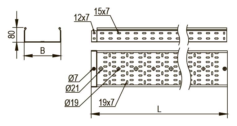 - Отверстия для кабеля: Лотки оборудованы отверстиями диаметром 11 мм, 17 мм и 21 мм для эффективного отвода кабеля.