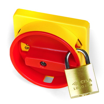 AZ6601 | Желтая площадка 67х67 - красная ручка B64 22мм с замком для серии А