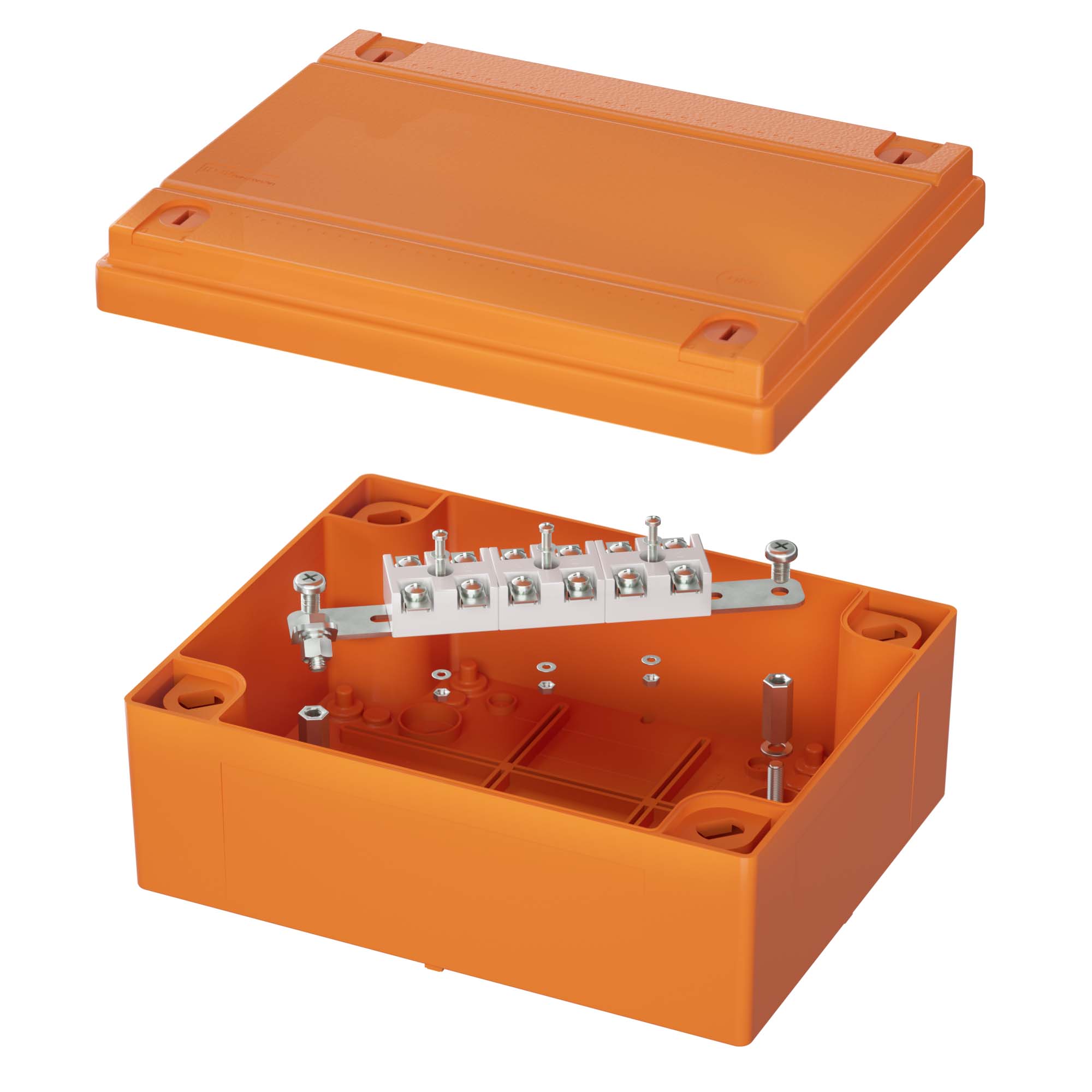 Предназначение огнестойких ответвительных коробок – соединение и ответвление проводов и кабелей с сохранением работоспособности при пожаре. Коробки применяются в составе огнестойких кабельных линий и прошли испытания в соответствии с ГОСТ Р 53316 с продукцией различных кабельных заводов. Материал – специальный термопласт, цвет – оранжевый, RAL2003. В комплект поставки коробок входят керамические клеммники, а также огнестойкие метизы (монтажная пластина, анкера, винты, шайбы, гайки).