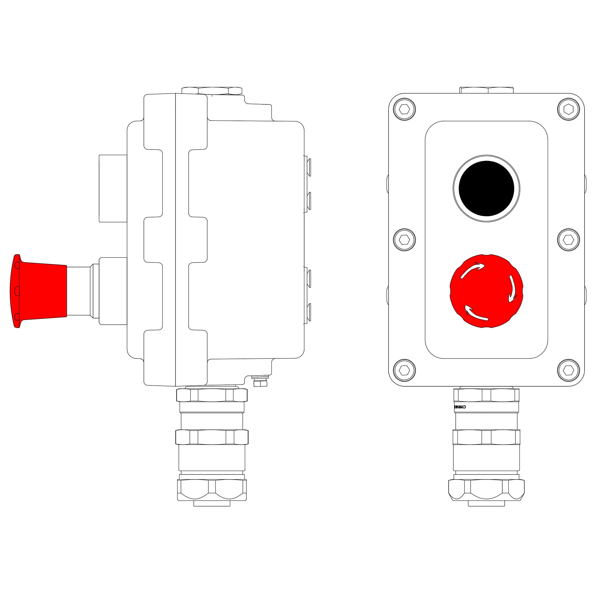 Взрывонепроницаемый пост управления из алюминия LCSD - 02 - B - MB - P1B(11)x1 - P6R(11)x1 - PBMB - KAEPM2MHK - 20 Взрывозащищенный местный пост управления из алюминия на 2 эл.управления. Маркировка: 1Ex d IIB T5 Gb / Ex tb IIIC T95°С Db / IP66 Температура окружающей среды: От - 60°C до +40°C Элементы управления P1 – кнопка без фиксации. Цвет черный - 1шт. P6 – кнопка грибовидная с фиксацией, отпускание поворотом (размер Ø40 мм). Цвет красный - 1шт. Кабельные вводы Снизу: Взрывозащищенный кабельный ввод серии КАЕРМ для бронированного и небронированного кабеля в металлорукаве COSMEC Dn:20 М20х1,5 d:5,8 - 12мм.Никелированнаялатунь IP66/IP68 Сверху: Взрывозащищенная заглушка Ex d e, М20x1,5. Никелированная латунь. IP66/67/68