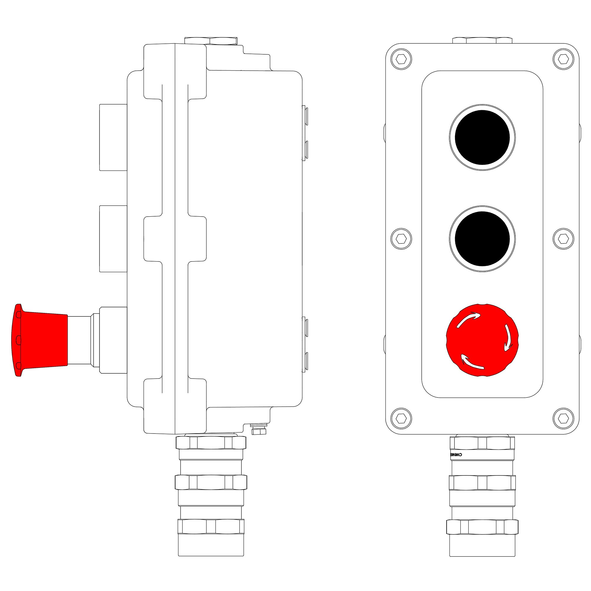 LCSD - 03 - B - MB - P1B(11)x1 - P1B(11)x1 - P6R(11)x1 - PBMB - KA2MHK Взрывозащищенный местный пост управления из алюминия на 3 эл.управления. Маркировка: 1Ex d IIB T5 Gb / Ex tb IIIC T95°С Db / IP66 Температура окружающей среды: От - 60°C до +40°C Элементы управления P1 – кнопка без фиксации. Цвет черный - 2шт. P6 – кнопка грибовидная с фиксацией, отпускание поворотом (размер Ø40 мм). Цвет красный - 1шт. Кабельные вводы Снизу: Взрывозащищенный кабельный ввод серии КА для бронированного кабеляМ20х1,5 d:5,8 - 12мм D:9 - 17мм. Никелированная латунь IP66/IP68 Сверху: Взрывозащищенная заглушка Ex d e, М20x1,5. Никелированная латунь. IP66/67/68