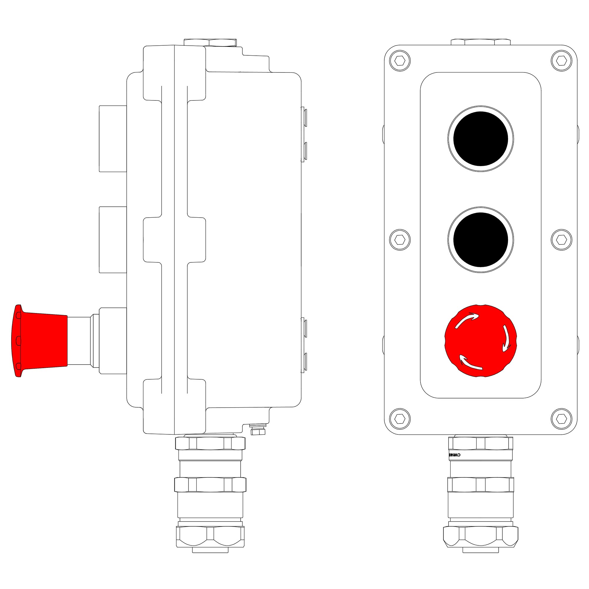 LCSD - 03 - B - MB - P1B(11)x1 - P1B(11)x1 - P6R(11)x1 - PBMB - ANP15BMB Взрывозащищенный местный пост управления из алюминия на 3 эл.управления. Маркировка: 1Ex d IIB T5 Gb / Ex tb IIIC T95°С Db / IP66 Температура окружающей среды: От - 60°C до +40°C Элементы управления P1 – кнопка без фиксации. Цвет черный - 2шт. P6 – кнопка грибовидная с фиксацией, отпускание поворотом (размер Ø40 мм). Цвет красный - 1шт. Кабельные вводы Снизу: Взрывозащищенный кабельный ввод ANP под небронированный кабель в металлорукаве M20х1,5 D5,5 - 13мм, Dn15мм. Никелированная латунь.IP66/68 Сверху: Взрывозащищенная заглушка Ex d e, М20x1,5. Никелированная латунь. IP66/67/68
