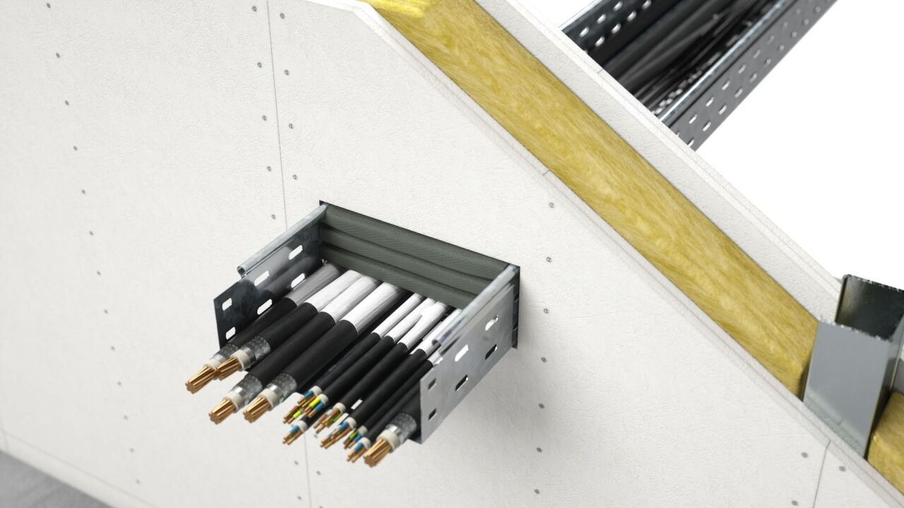 - В случае, если размеры проема проходки больше, чем размеры лотка, проходящего через нее, или проходка представляет собой сложную конструкцию из нескольких лотков, необходимо заделать пространство вокруг лотков огнеупорными плитами DP.