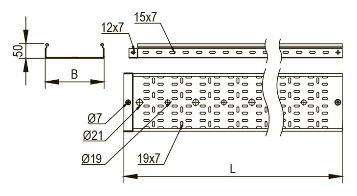 - Отверстия для кабеля: Лотки оборудованы отверстиями диаметром 11 мм, 17 мм и 21 мм для эффективного отвода кабеля.