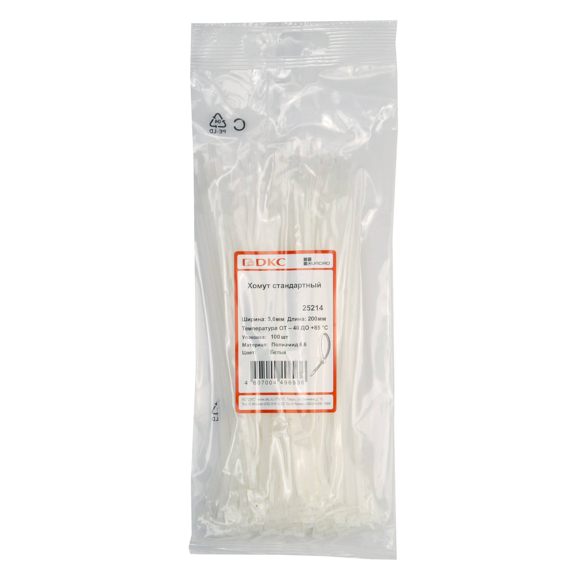 Хомуты (или, иначе, стяжки) – это популярный крепежный элемент, применяющийся при монтажных или строительных работах. Хомуты ДКС прочны, устойчивы к коррозии и воздействию агрессивных сред, что позволяет использовать их не только внутри помещений, но и на улице. С помощью гибких хомутов можно создавать как жесткие, так и подвижные соединения. Ребристые внутренняя и внешняя стороны обеспечивают надежную фиксацию и предотвращает соскальзывание хомута. Изделие имеет длину 200 мм, ширину 3,6 мм, устойчивость к растяжению 180 H. Не рекомендуется использовать стяжки в зонах, где они будут подвергаться воздействию прямых солнечных лучей.