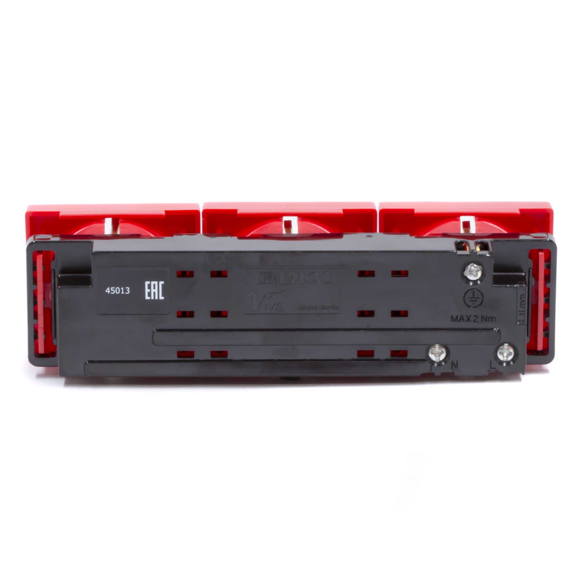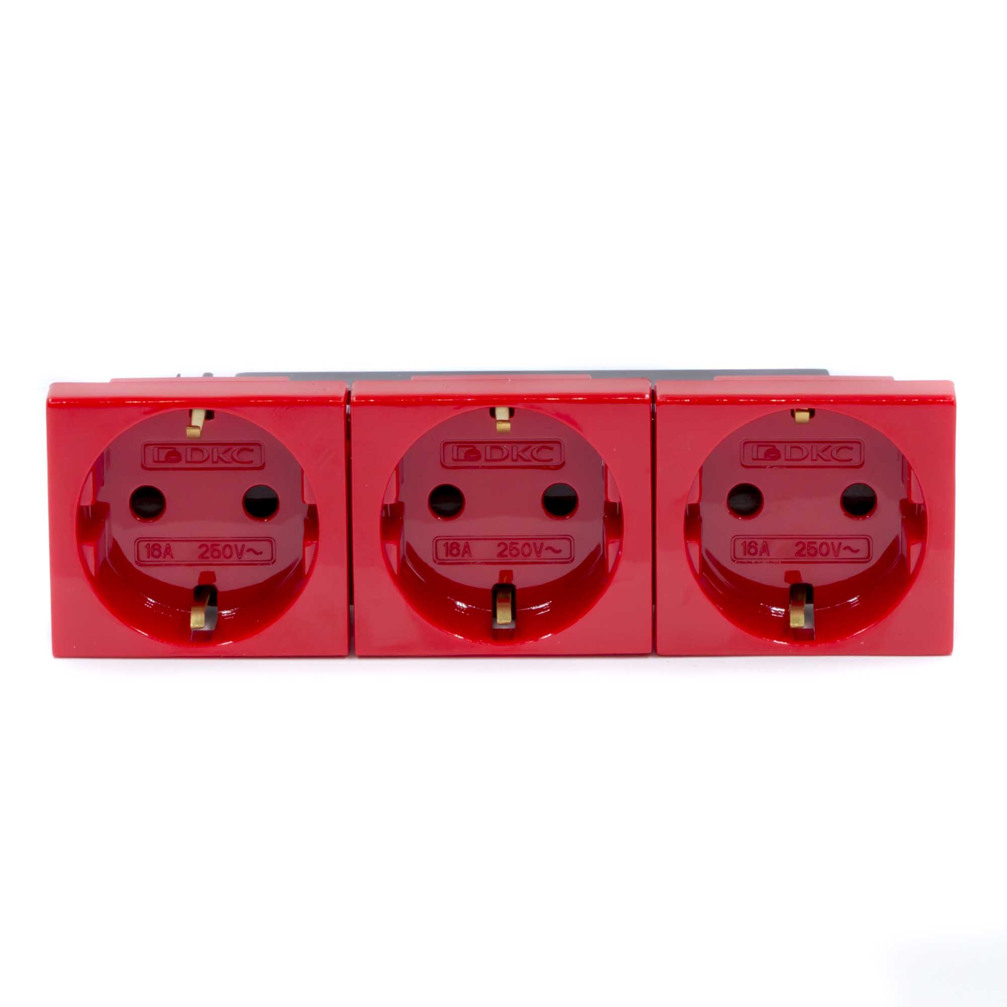 Электрические розетки, штекерные, с заземлением и со шторками, моноблок тройной. Назначение: подключение оргтехники, бытовых приборов и т. п.; экономия времени на подключении кабеля 60 %. Характеристики: в блоке всего 3 клеммы для подключения кабеля – все 3 розетки подключаются одной клеммой; имеется заземление; диаметр отверстий для ввода кабелей - 3 мм (по 2 отверстия на клемму); соответствие ПУЭ, пункт 7.1.49 - имеются автоматические закрывающиеся шторки; номинальный ток – 16 А (на весь блок); номинальное напряжение - 250 B. Кол-во модулей: 6. Установочный размер: 45х150. Цвет: красный